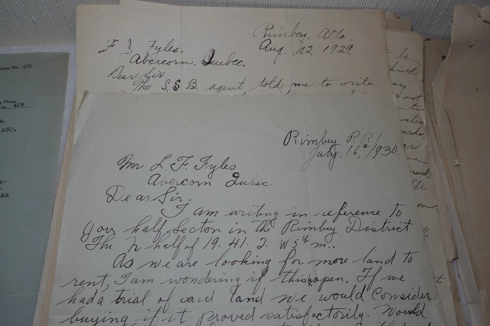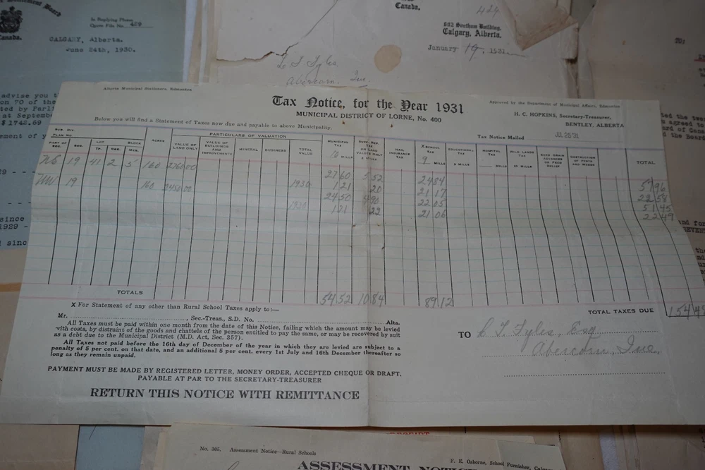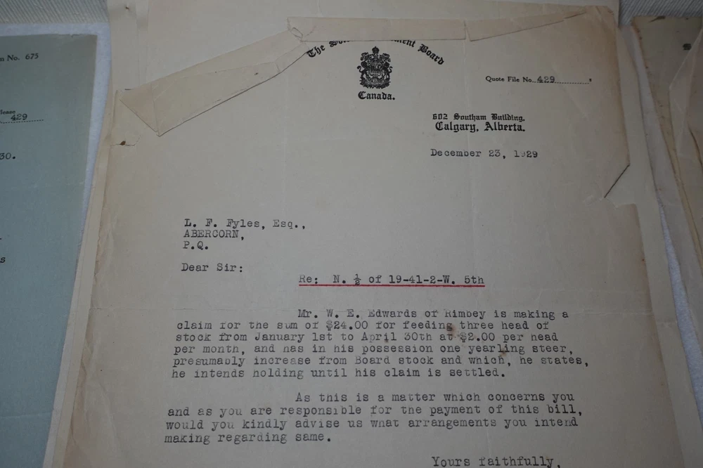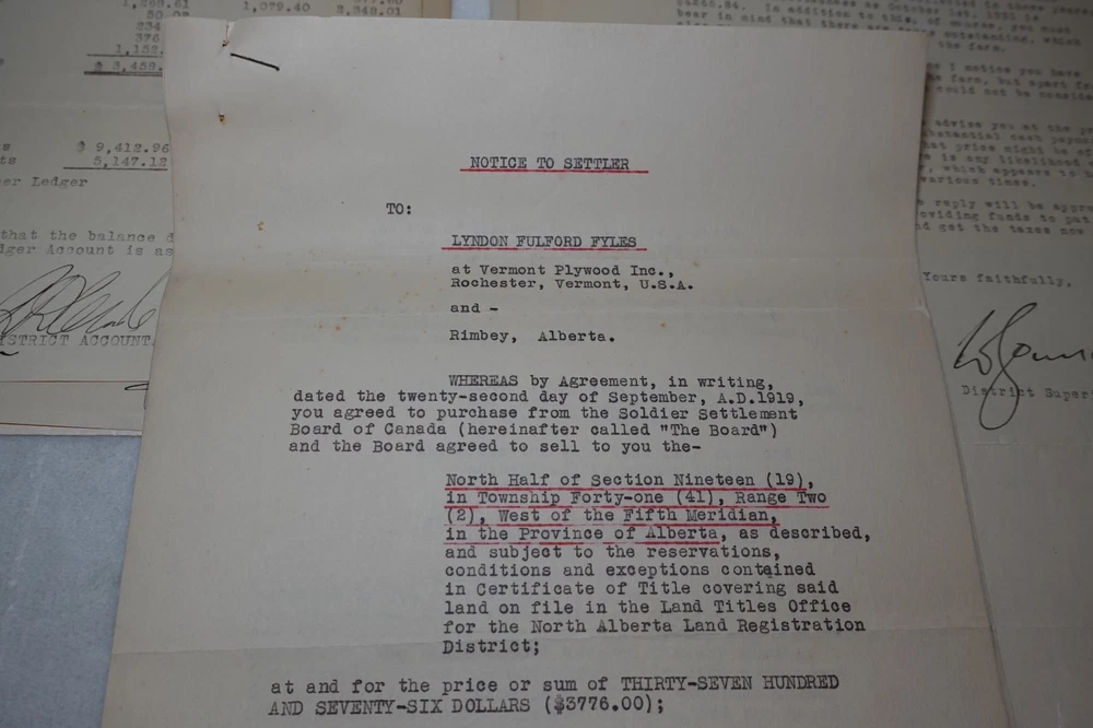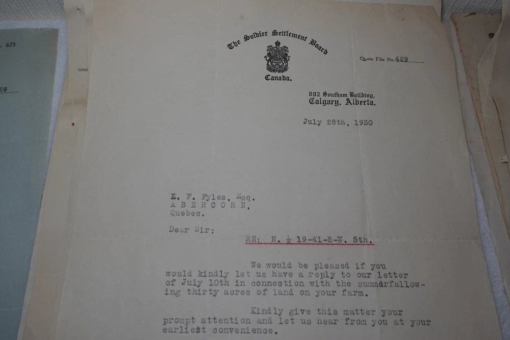 Lyndon F. Fyles Canada Soldier Settlement Board 1928-35 Abercorn Que Ephemera Papers Lot Papers related to Lyndon F. Fyles of Abercorn, Quebec. Fyles also appeared to have connections to Vermont. Years range from 1928 to 1935. Other cities mentioned on the papers are Calgary, Alberta, Rochester, Vermont, and Rimbey, Alberta. Fyles was born in 1891 and died in 1969. There are approximately 48 items (pages) in this lot. Pages range in size from 3 3/8" x 8" to 8" x 13". Documents mention the Soldier Settlement Board of Canada (Fyles was a World War I veteran), property, finances, and other topics. Included are a couple handwritten notes and letters. Some documents appear to be copies. Items are in weathered condition with heavy tearing, edge chipping, holes, folds, creasing, fading, dinged edges and corners, turned corners, staining, age discoloration and marks. Some documents have considerable tearing. Documents also have holes where staples or pins were removed. A couple of pages are stuck together. There is writing on the reverse side of documents, mainly arithmetic or notes. Please see photos for more information on condition and ask any questions you may have.