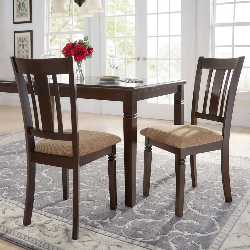 Add timeless character to your dining room or eat in kitchen with the Lynn Espresso Finish Upholstered Dining Chairs by iNSPIRE Q® Classic. The chairs feature premium craftsmanship including rubberwood frames for longevity and sustainability. The chair seats are filled with plush foam and upholstered in a rich, textured tan fabric for comfort and style. The espresso finish frames provide warmth to your space and go well with existing décor. Inspired by the classics, these chairs are sure to provide lasting style. Shop the Lynn Collection Features: Set includes two (2) chairs Textured, tan fabric seats Espresso wood finish Slat-styled chair back Built with rubberwood, particle board, p2nt, foam, and fabric Classic transitional style Weight tested up to 250 poundsDimensions: Free Shipping Over $49.99* Details Lynn Espresso Finish Upholstered Dining Chairs (Set of 2) by iNSPIRE Q Classic Product Description: Add timeless character to your dining room or eat in kitchen with the Lynn Espresso Finish Upholstered Dining Chairs by iNSPIRE Q® Classic. The chairs feature premium craftsmanship including rubberwood frames for longevity and sustainability. The chair seats are filled with plush foam and upholstered in a rich, textured tan fabric for comfort and style. The espresso finish frames provide warmth to your space and go well with existing décor. Inspired by the classics, these chairs are sure to provide lasting style. Shop the Lynn Collection Features: Set includes two (2) chairs Textured, tan fabric seats Espresso wood finish Slat-styled chair back Built with rubberwood, particle board, p2nt, foam, and fabric Classic transitional style Weight tested up to 250 pounds Dimensions: Overall dimensions17.5 in. width x 22.5 in. depth x 38.2 in. height Seat dimensions17.5 in. width x 17.3 in. depth Seat height19.5 in. Ships in one (1) box. Assembly required. Click here to view assembly instructions for this item. Please allow slight color and scale of the pattern deviation due to light and display. Size may vary a little due to manual measurement. Exquisite and inviting, iNSPIRE Q Classic encompasses traditional and transitional designs. Taking cues from time-honored craftsmanship, these pieces simultaneously draw from tried and true roots and contemporary elements. With a breadth of styles to choose from, transform your home into a welcoming haven with iNSPIRE Q Classic. At iNSPIRE Q® , our designer-curated lifestyles reflect current trends and timeless essentials, giving you the know-how to achieve your vision. With diverse style inspirations to choose from, you'll be able to find the one that speaks to you - or mix and match across collections for a style that's all your own. Whether you're cool and contemporary, retro, free-spirited, vintage, or classic, iNSPIRE Q® is here to help you achieve the home of your dreams, every step of the way. Click here to explore the five style inspirationsiQ Bold, iQ Modern, iQ Classic, iQ Artisan, and iQ Junior.