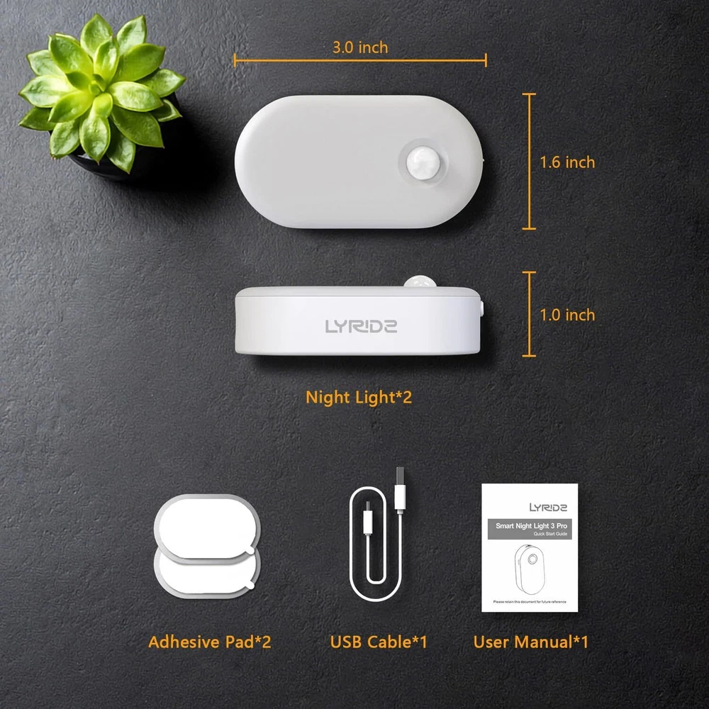 Lyridz Rechargeable Battery Night Light, Stick on Mini 2 Pack, A. Warm White Product Details Finish Type: Matte Base Material: Plastic Bulb Base: G5.3 Product Dimensions: 1.59"D x 3"W x 1"H Cable Length: 156 Inches Item Weight: 0.09 Pounds Lamp Type: Night Light Shade Color: White Shade Material: Acrylonitrile Butadiene Styrene Switch Type: Toggle Style: Modern Brand: Lyridz Color: A. Warm White Special Feature: Dimmable, Cordless, Motion-Sensor Light Source Type: LED Material: Plastic Room Type: Kitchen, Bedroom Recommended Uses For Product: Decoration, Reading Power Source: Battery Powered Shape: Oval Controller Type: Motion-Sensor, Touch Number of Light Sources: 1 Connectivity Technology: USB Included Components: Led Light,Usb cable Is Waterproof: false Bulb Shape Size: B10 Mounting Type: stick on Number of Items: 2 Lighting Method: Up/Down Light Control Method: Touch Indoor/Outdoor Usage: Indoor Specific Uses For Product: Bedroom, Kitchen, Bathroom, Kids' room, Nursery, Garage, Stairway, Hallway, Corridor, Basement, General illumination Water Resistance Level: Not Water Resistant Installation Type: Freestanding Number of Pieces: 2 Efficiency: high Voltage: 5 Volts (DC) Brightness: 20 Lumen Is Cordless?: Yes Size: 2 Pack Manufacturer: Lyridz Shade Height: 1.01 Inches Part Number: A5125 Item Weight: 1.44 ounces Item model number: A5125 Batteries: 2 Lithium Polymer batteries required. (included) Finish types: Matte Special Features: Dimmable, Cordless, Motion-Sensor Batteries Included?: Yes Batteries Required?: Yes Color Temperature: 2800 Kelvin Product Dimensions : 1.59 x 3 x 1 inches; 1.44 ounces Item model number : A5125 Batteries : 2 Lithium Polymer batteries required. (included) Manufacturer : Lyridz Finish Type: Matte Base Material: Plastic Bulb Base: G5.3 Product Dimensions: 1.59"D x 3"W x 1"H Cable Length: 156 Inches Rechargeable Design and Sensitive Motion Sensor: No worries about buying and changing non-recyclable AAA batteries frequently. The motion sensor will be activeated to provide you a detection angle of 120 degrees and a range of 10-13ft. Dimmable LED Night Light: LYRIDZ LED night lights come with lumens up to 20, which is quite suitable for dark places. Touch and hold the control panel to DIY the brightness smoothly from 1LM (min) to 20LM (max) as you want. Or tap the control panel to choose the brightness you need. Saving Energy Everyday: In AUTO mode, when it detects movement in the dark, automatically light up and lightens your way 20 seconds after the last movement has been detected. It automatically turn off, which reduce unnecessary power consumption when you do not need them. In ON mode, always light up. Comfortable Light: Warm white light lets you never dazzle when you walk in the dark. As a sleep light, you may feel relaxed and comfortable, don't wake you up at midnight. Compact Design & Wide Application: The size of this motion night light is 3*1.59*1.01inch, it is perfect for bathroom, kitchen, kids' room, nursery, garage, stairway, hallway, corridor, basement, and anywhere you need a little extra light. Lumi Stick-On Night Light The Stick-Anywhere Night Light From Lyridz, the brand that lights up your life Delightful solutions that make your house a home Smart technology and innovative design that make your life easier USB RECHARGEABLE NIGHT LIGHT No worries about buying and changing non-recyclable AAA batteries frequently; Fully charged in about 3 hours, lasting 10 hours(Max brightness) or 25 hours(Min brightness). DIMMABLE LED NIGHT LIGHTLong press the brightness button to achieve stepless brightness adjustment, 1-20LM can adjust the brightness to meet the use of different environments; You can also click to select the preset 5 fixed brightness (1LM, 5LM, 10LM, 15LM, 20LM). SMART MOTION SENSOR LIGHTIn a dark environment, the light is on for 20s when motion is sensed; If no motion is sensed again after 20s, the night light will automatically turn off; This design can effectively reduce unnecessary power consumption and achieve energy saving, low carbon and environmental protection, also you can set to ON mode, night light will be always light up; The motion sensor be effective at a detection angle of 120 degrees and a range of 10-13 feet. COMFORTABLE LIGHT & REJECT DAZZLINGPeople are tired of the dazzling lights at night, this battery night light of LYRIDZ adopts a semi-hidden LED lamp bead design. In addition, the color temperature value of 2700k is very soft, comfortable and not dazzling while ensuring the brightness of the light; As a sleep night light, you will feel be relaxed and comfortable, don't wake you up at midnight. EASY TO INSTALL & WIDE APPLICATIONThe motion night light size is 3*1.59*1.01 inch, this smart mini night light comes with a magnet on the back, and you can stick it on any iron surface; Also, Each night light is a also individually equipped with a patch, with an iron surface on the front an