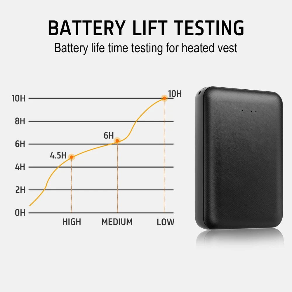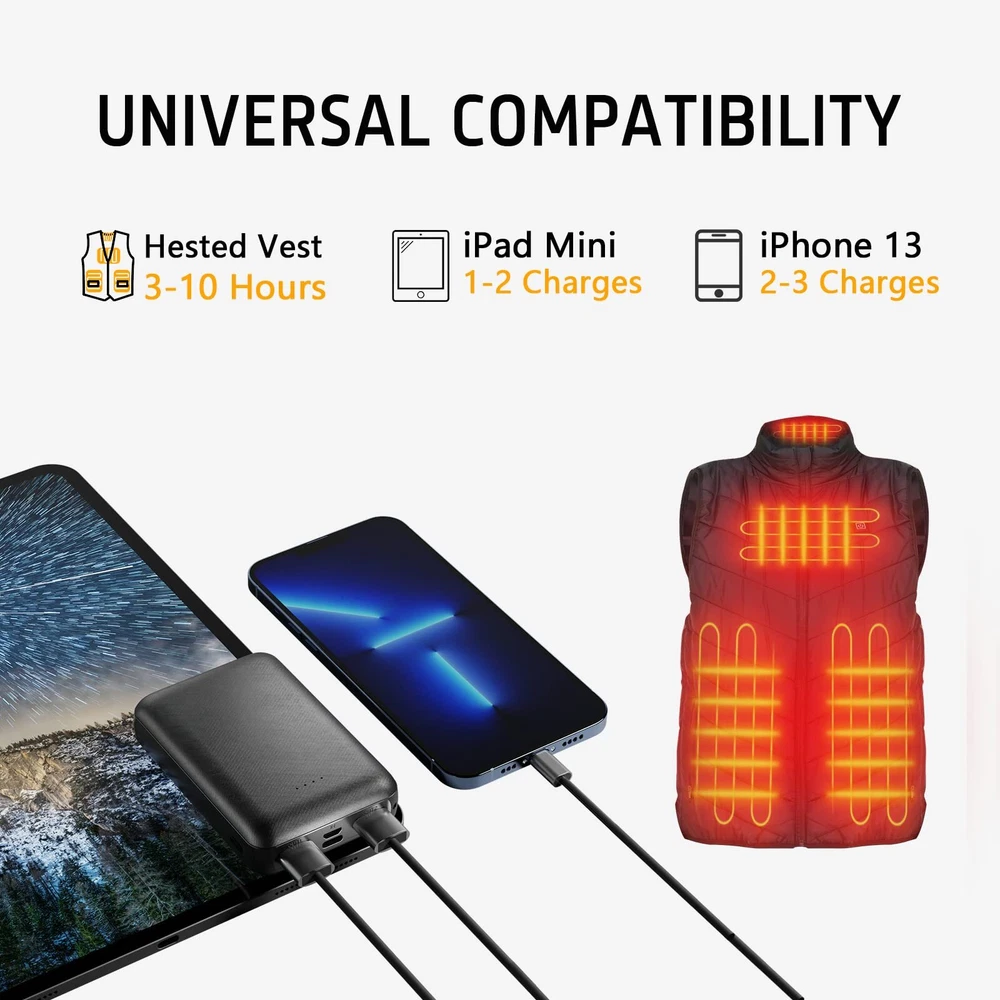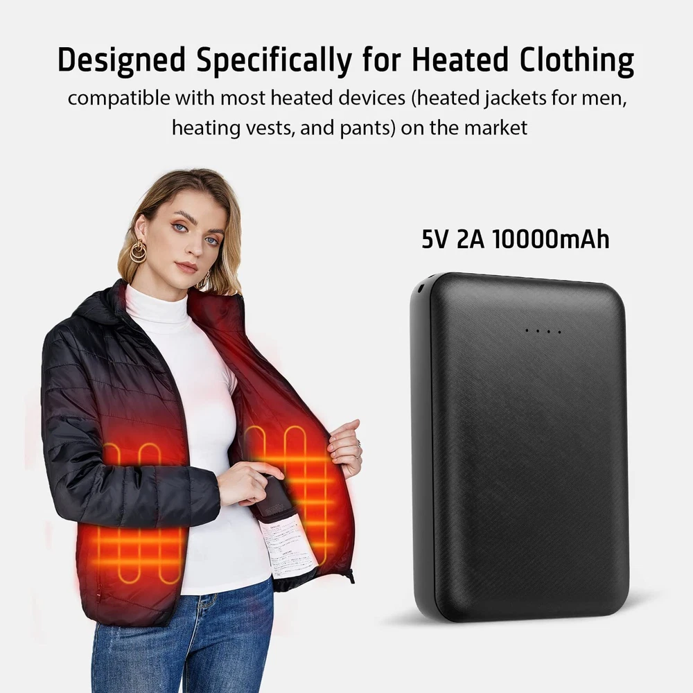 Rechargeable Battery for Heated Vest 10000 mAh 5V 2A 【Small Size Designed for Heated Vest Pockets】Different from other heated vest batteries, Whsahans heated vest battery pack is small and compact enough to fit into your vest pocket. It's the best choice for going out. 【Multiple safety protection】Whsahans power bank has a built-in intelligent safety protection chip of voltage regulator. Multiple protection procedures protect your devices against overvoltage, excessive current, overcharging, and short circuit. Balanced operating temperature, safe and not hot. 【Plug in for Automatic Starting up 】It was specially designed for heated clothing. When you wear heated clothing, it is inconvenient to replace the battery. With our products, you do not need to press the switch button because it will be power on as soon as the battery was connected. It will sleep automatically when it is not working. 【Complete Security Certifications】Our products have passed many certifications from different countries, such as UL, FCC, CE, RoSh, and PSE. After years of quality upgrading, now Whsahans power bank can be charged repeatedly for more than 800 times, providing long-lasting support for outdoor heated vests. 【Perfect Spare Battery for Heated Clothing】Compatible with most heated devices (heated jackets, vests, and pants) on the market , with seamless battery replacement, it can be taken as an additional battery pack, which enables you to enjoy more time outdoors and keeps you warm at any time.