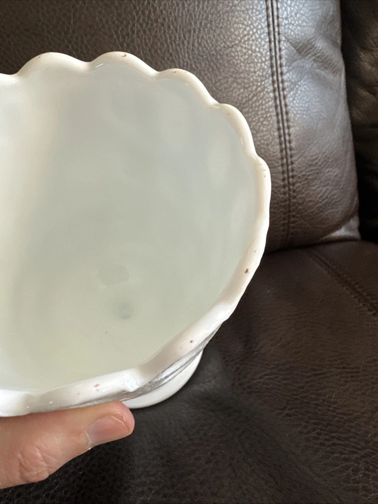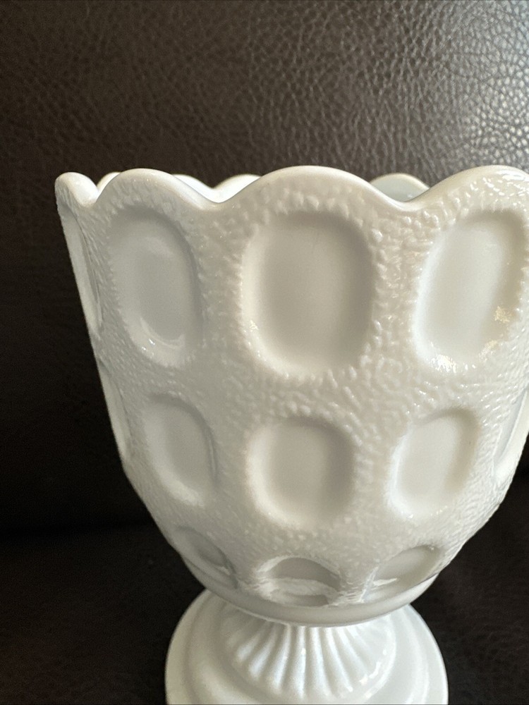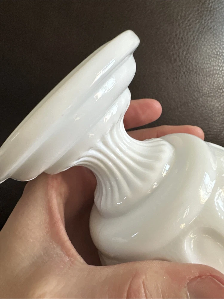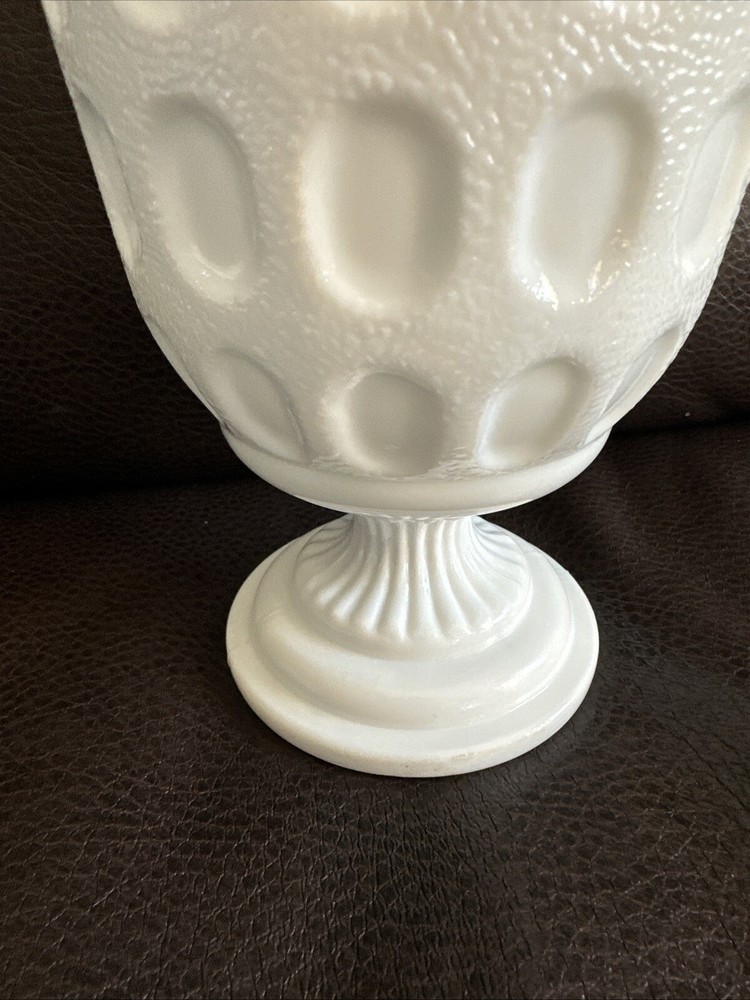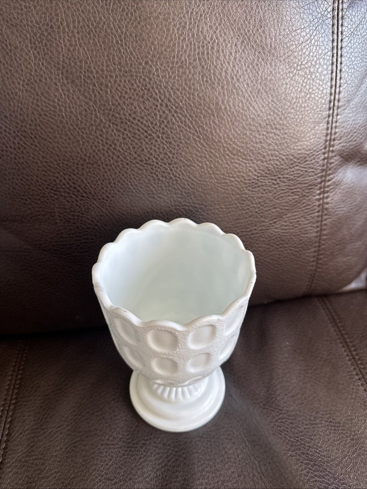 This is a vintage M Brody white milk glass vase, compote, candy bowl, or planter. It features a thumbprint design, scalloped rim, and pedestal footed base. The item is round with a diameter of 4.5" and a height of 6". Produced in the mid-20th century in America, this versatile piece has a glossy finish and a thumbprint solid white pattern. It is an original piece with an impressed backstamp. Good used condition, normal wear, no chips or cracks, see pics.