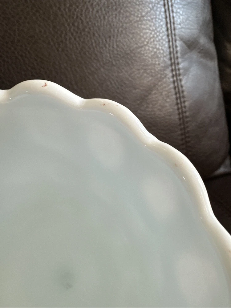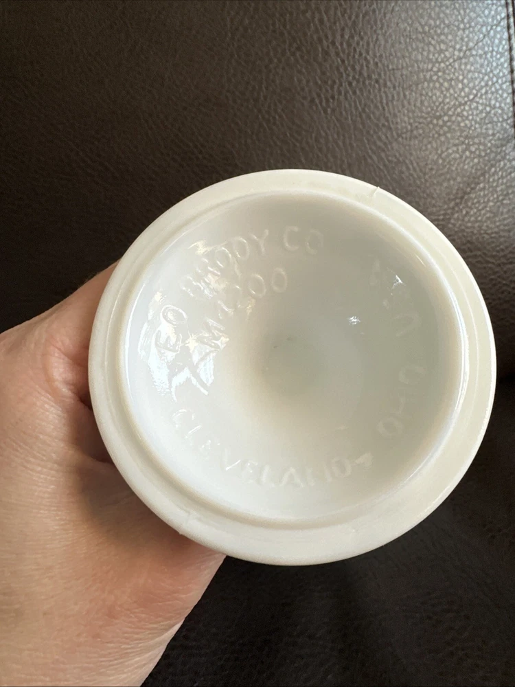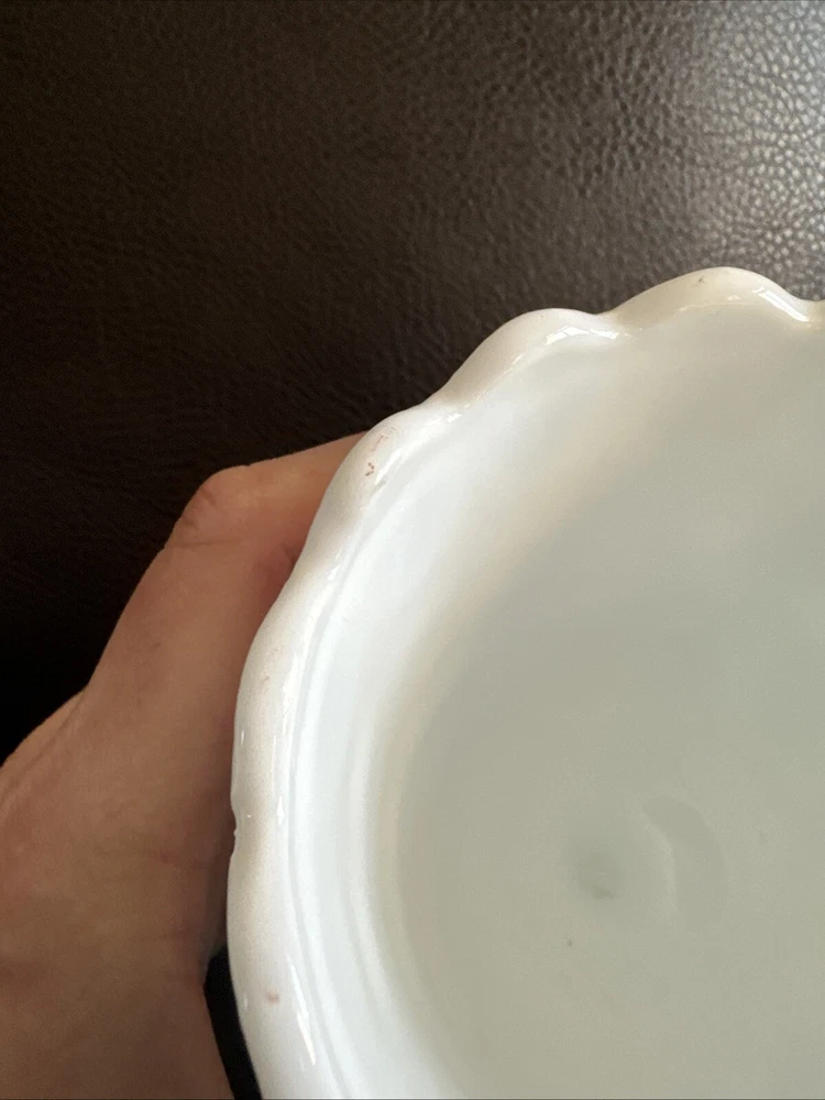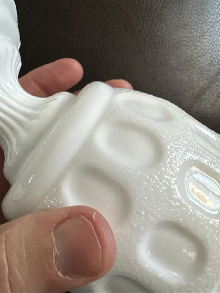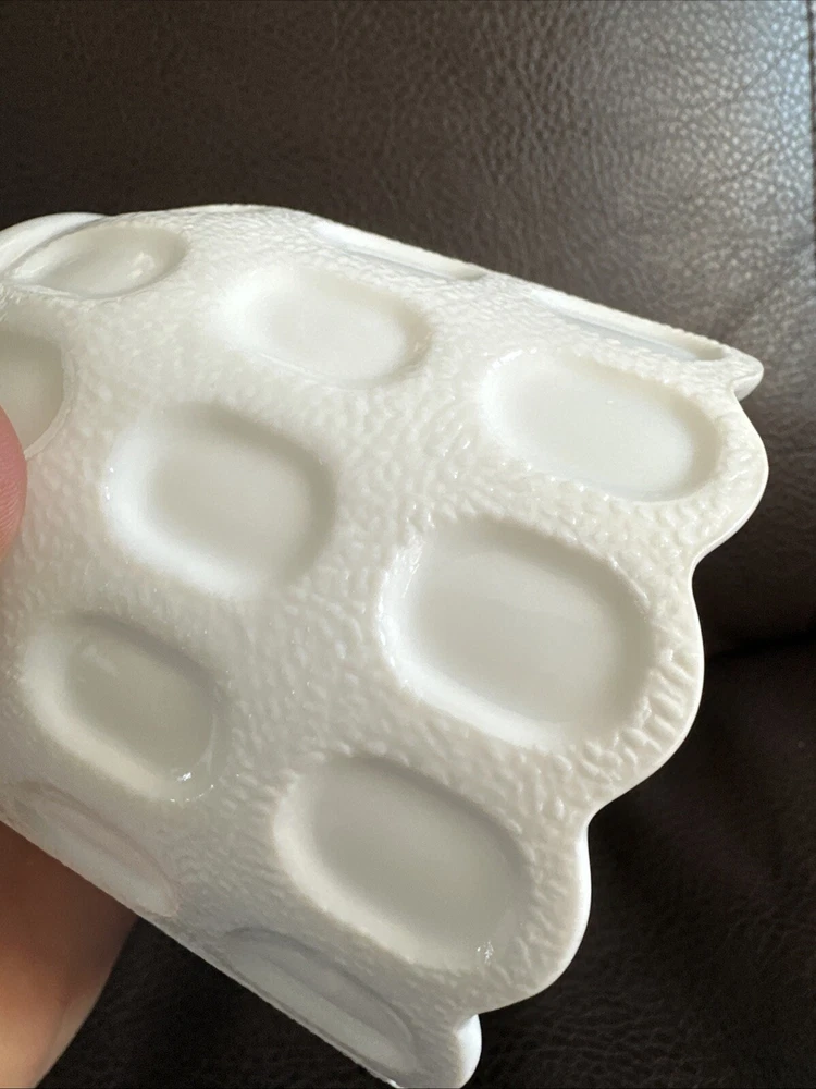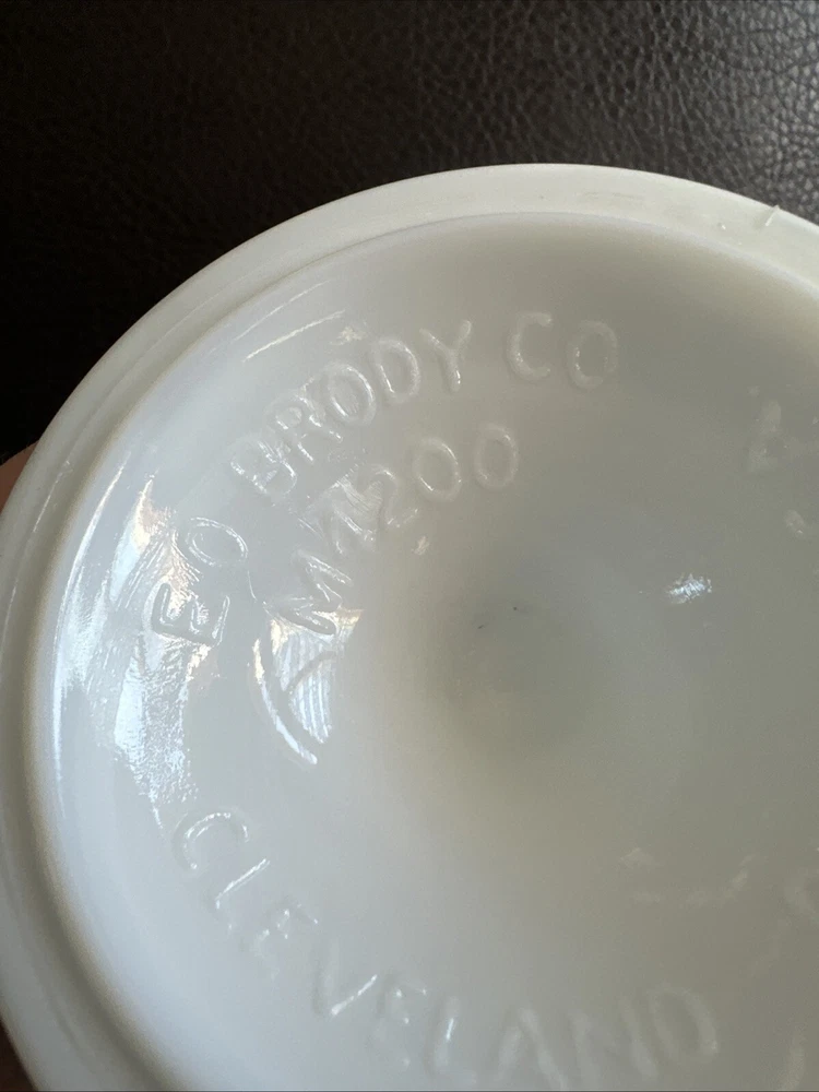 This is a vintage M Brody white milk glass vase, compote, candy bowl, or planter. It features a thumbprint design, scalloped rim, and pedestal footed base. The item is round with a diameter of 4.5" and a height of 6". Produced in the mid-20th century in America, this versatile piece has a glossy finish and a thumbprint solid white pattern. It is an original piece with an impressed backstamp. Good used condition, normal wear, no chips or cracks, see pics.