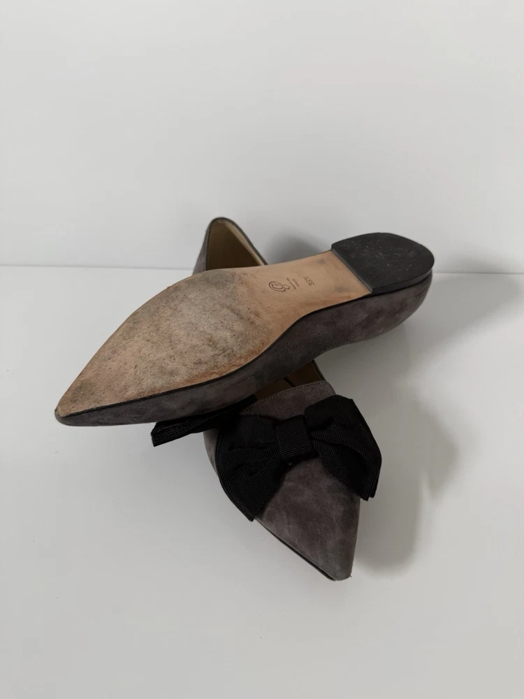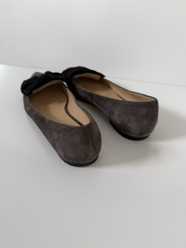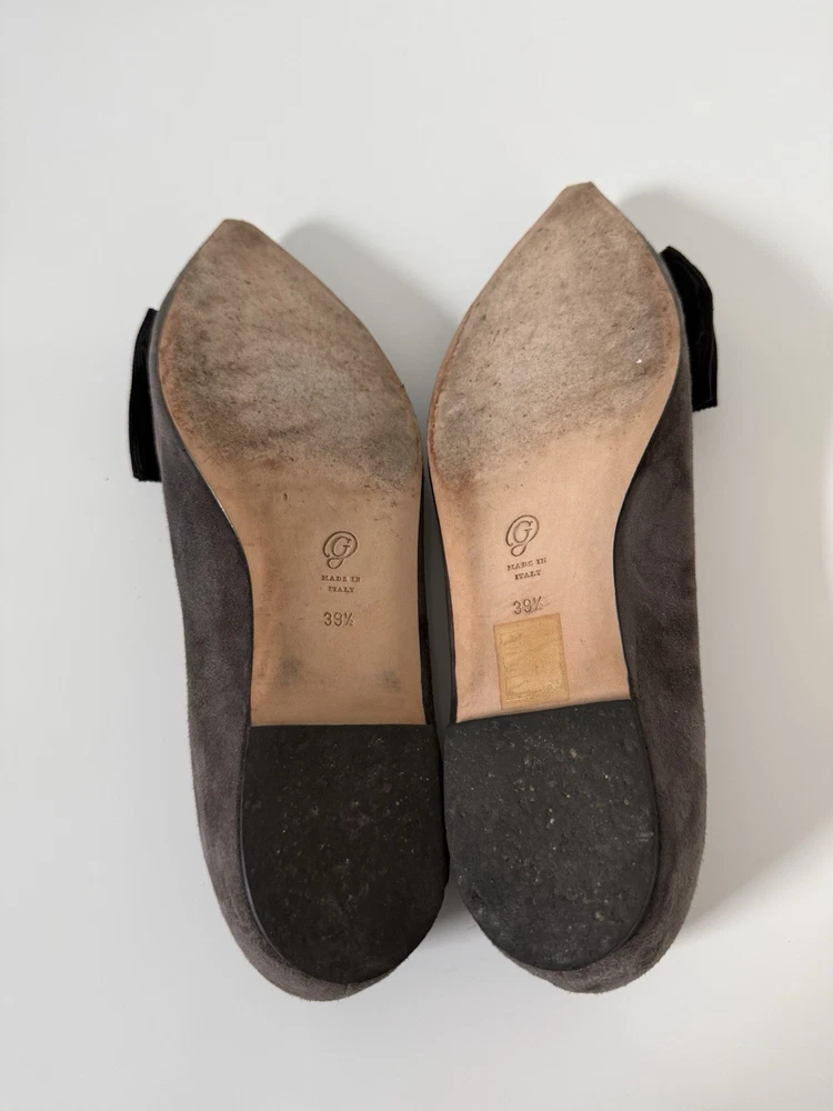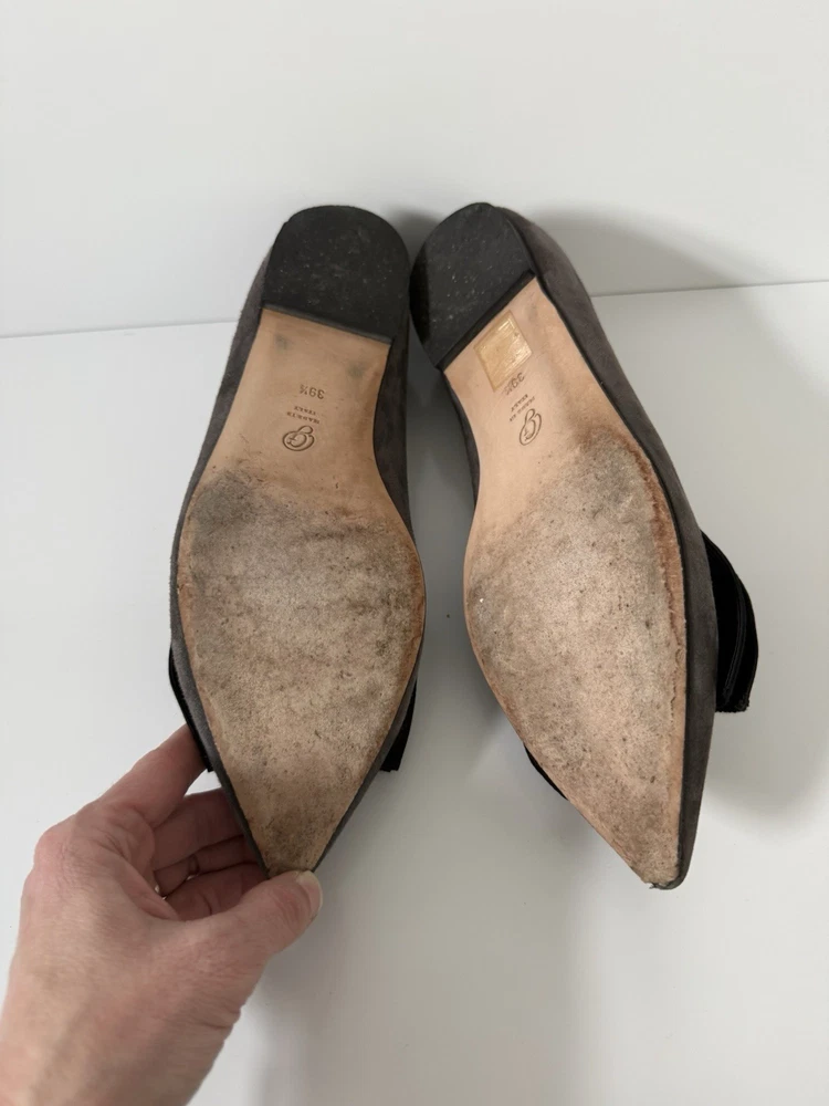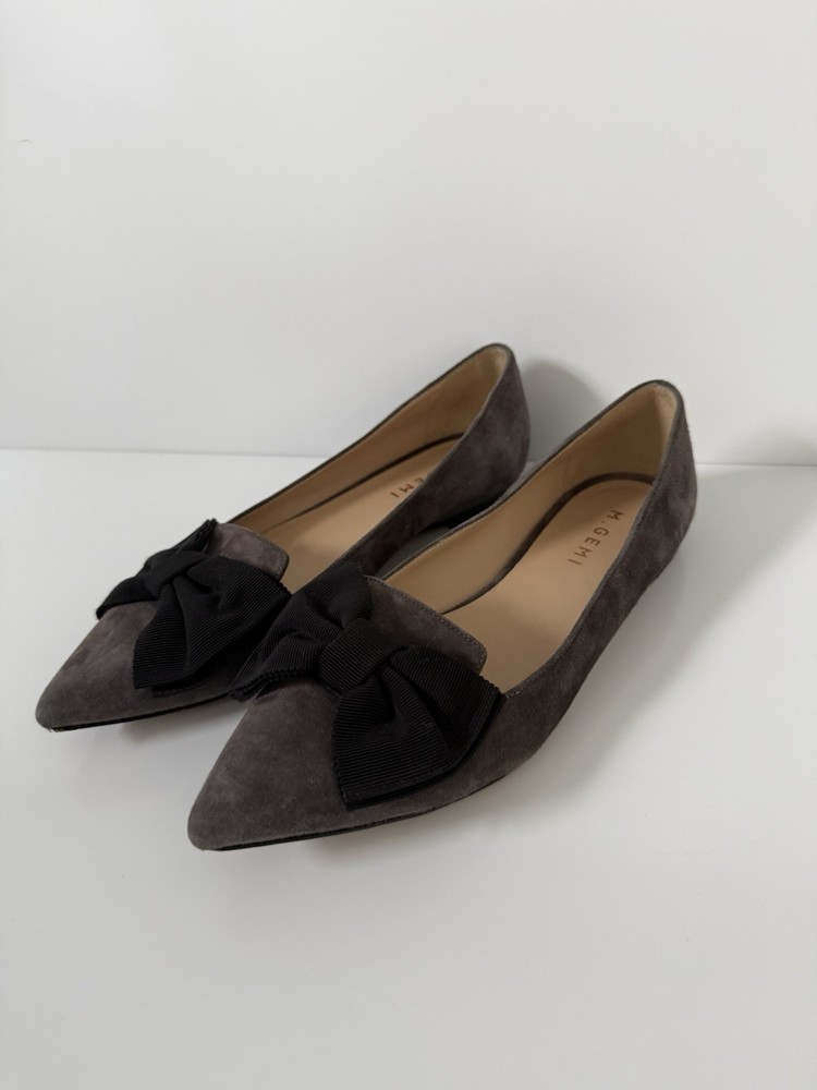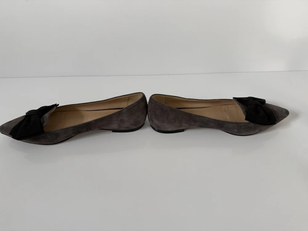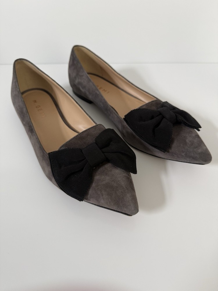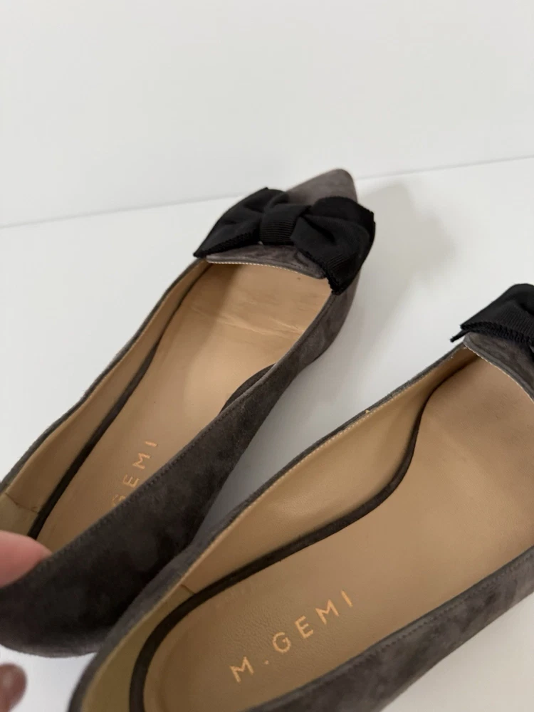 The M. GEMI Grey Suede Pointed Toe Flat Shoes with Black Bow are a stylish and elegant choice for women. Made in Italy with high-quality suede, these shoes feature a slip-on closure and a pointed toe design. With a UK size of 7.5 and US size of 9.5, these flats are a timeless addition to any woman's wardrobe. They have a very professional elegant look to them. There are some creases in the interior. And the bottom leather has some wear. Especially near the tip of the pointed toe. Nothing that that can be seen or that affect the aesthetic.