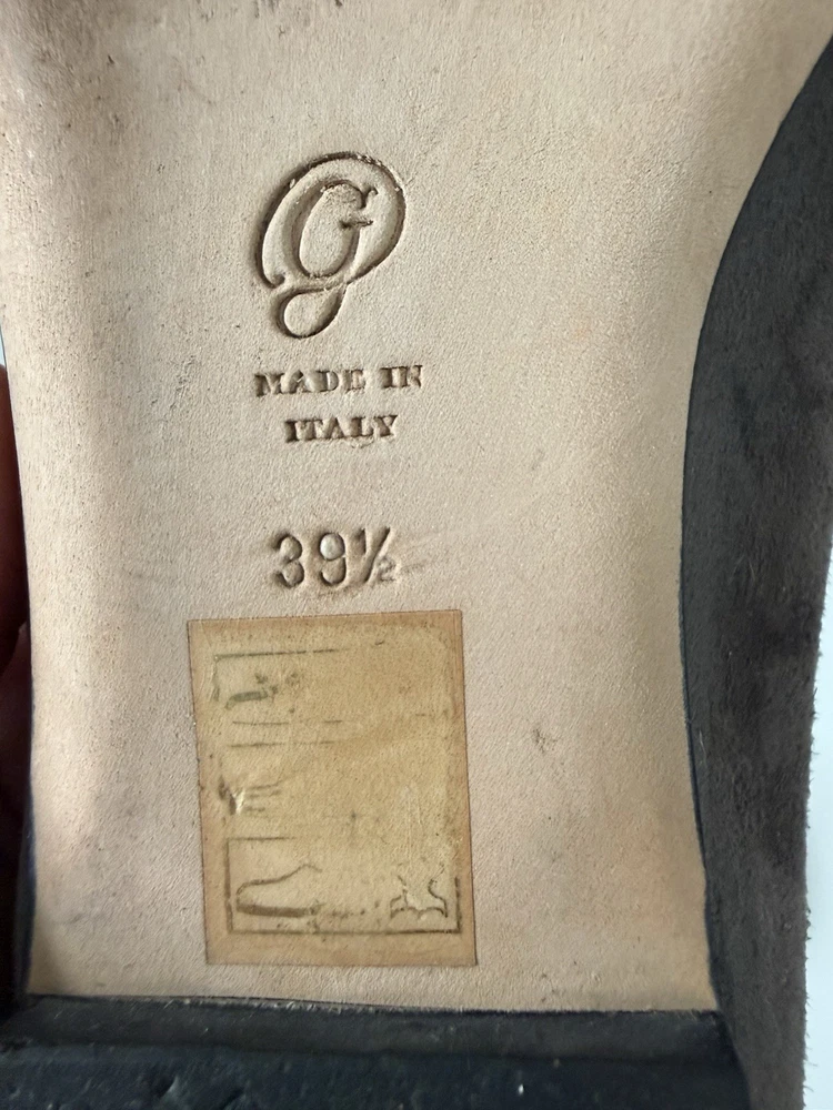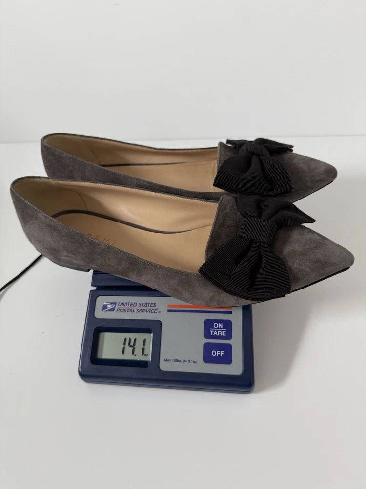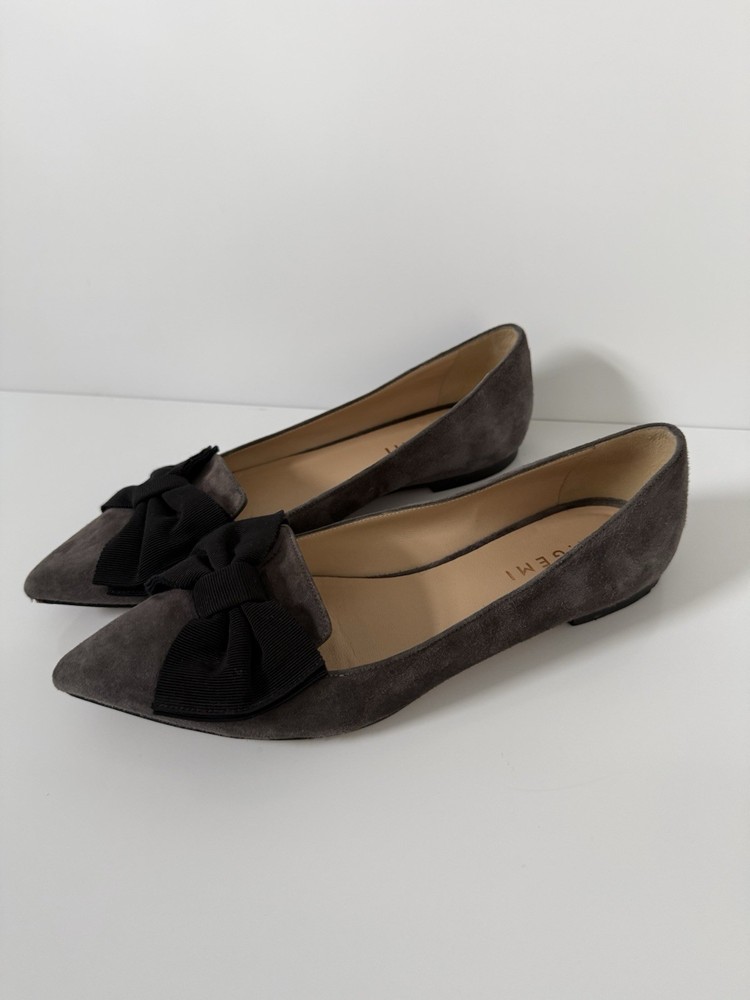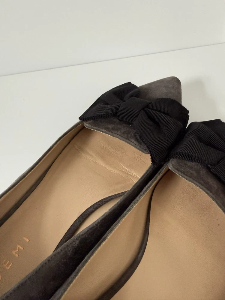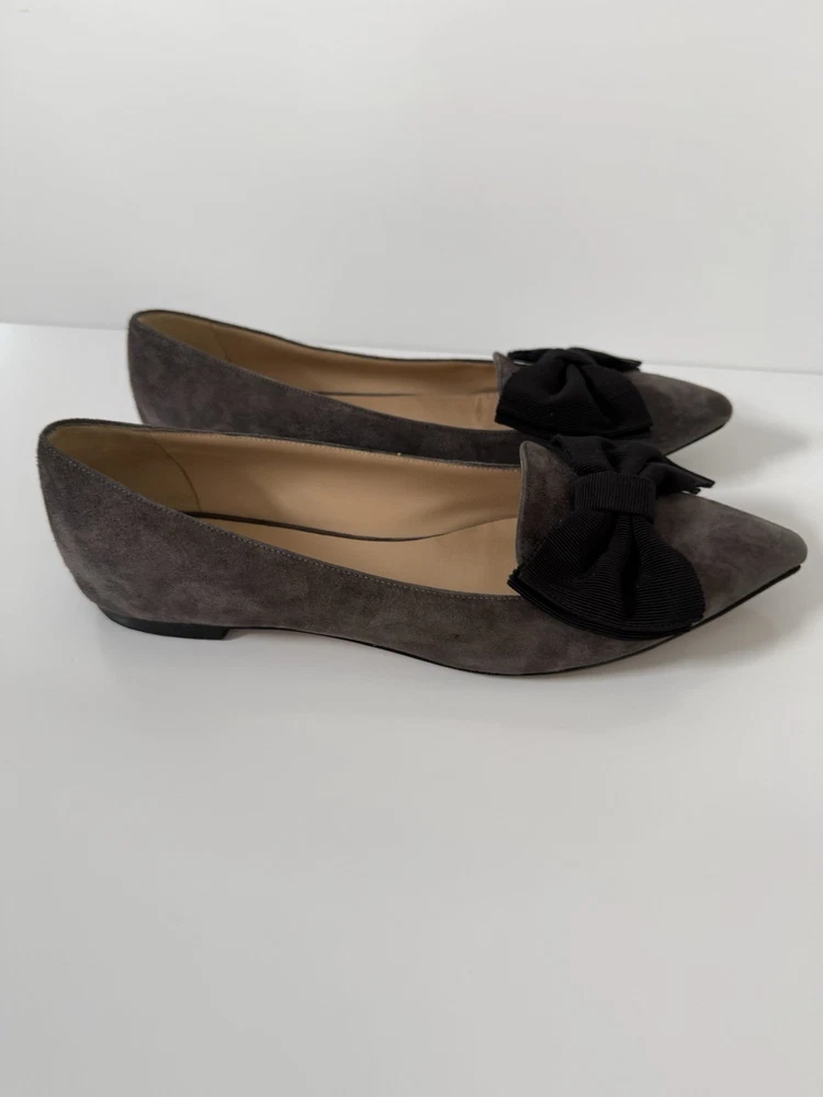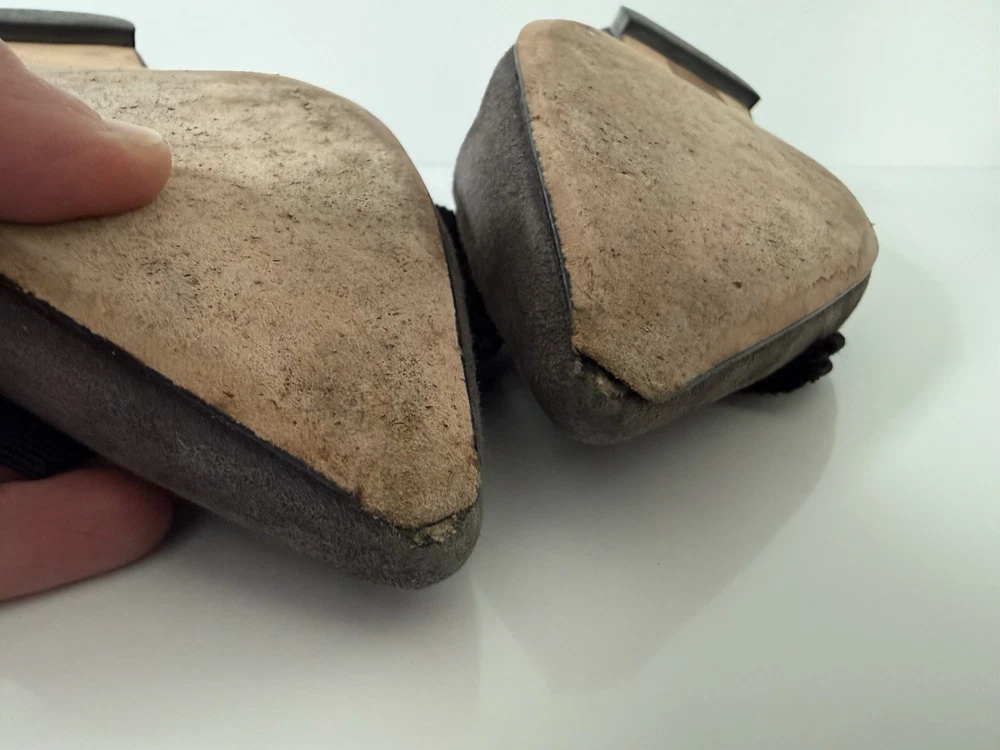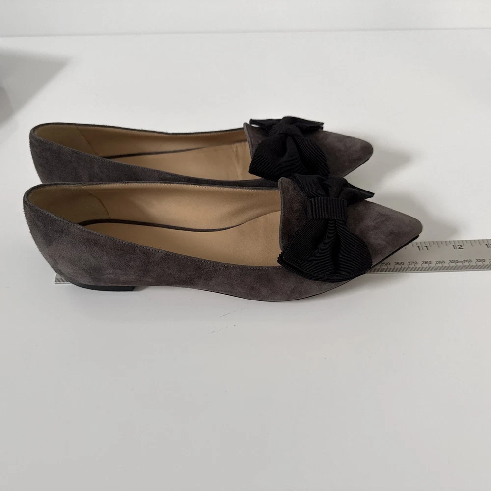 The M. GEMI Grey Suede Pointed Toe Flat Shoes with Black Bow are a stylish and elegant choice for women. Made in Italy with high-quality suede, these shoes feature a slip-on closure and a pointed toe design. With a UK size of 7.5 and US size of 9.5, these flats are a timeless addition to any woman's wardrobe. They have a very professional elegant look to them. There are some creases in the interior. And the bottom leather has some wear. Especially near the tip of the pointed toe. Nothing that that can be seen or that affect the aesthetic.