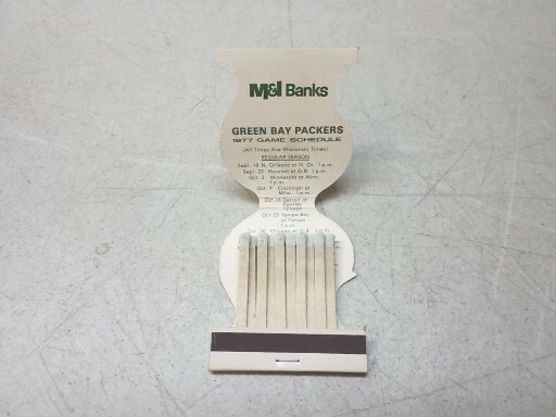 M & I Banks 1977 Green Bay Packers Schedule Wisconsin Matchbook Vintage Advertising Selling as used but appears in very nice condition overall with matches present Measures approximately 2" W x 2.25" L Location 3170 Lot 48 Free Shipping is for contiguous USA only. If item is shipping anything other then first class and you live in Alaska, Hawaii, or PR please contact us for a shipping confirmation before purchasing as we do ship there but not oversize items. We try to do our best to inspect each item although mistakes can happen so please message us before you purchase to ask questions and we will do our best to work with you. Our Feedback is automated through E-bay and will be automatically left after positive feedback is received if for some reason you cant leave positive feedback please contact us so we can resolve any problems. Shipping: We ship Monday-Friday only. Orders placed FRI-SUN will ship Monday. All other orders will ship the next day. We do not ship on Holidays. Any questions please ask before purchasing and we will gladly try to help.