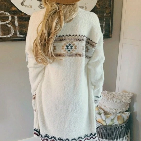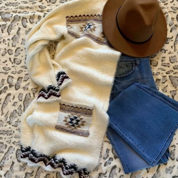 Cozy Boutique Labeled New Native Ethnic Print Soft Cardigan Boho Sweater + Open Front + Front Pockets + Oversized Cozy Fit + Acrylic Poly Blend Yarn + Model is 5'8" / 140 lbs and modeling a size Medium Ships fast from our studio in Washington State! Approx. Measurements: XL: Pit to pit: 24.5", Length: 38" ** Double pit to pit for total bust measurement Brand New With Tags! Combined Shipping Discount: Check out my other sweaters up for auction at up to 80% off retail! Each additional item purchased the same day ships for $1.00 each! Check out our other auctions: Check out my eBay Store! ** Bid With Confidence ** 20 Years on eBay with a Top Rated Status **