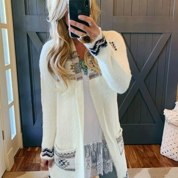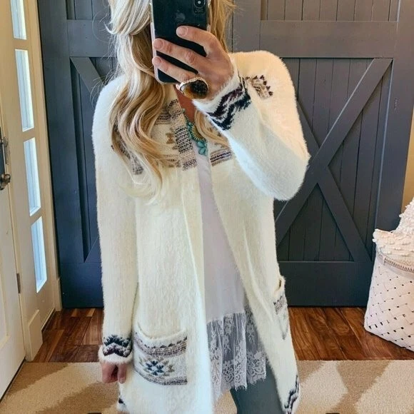 M New Boutique Azec Long White Boho Cozy Cardigan Southwest Womens MEDIUM