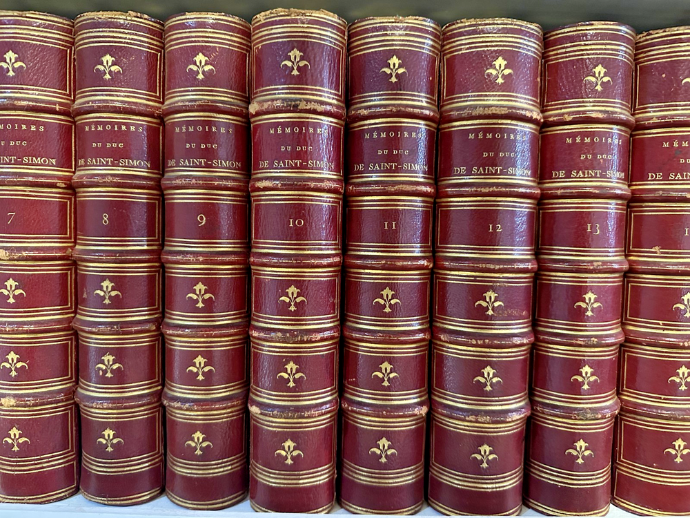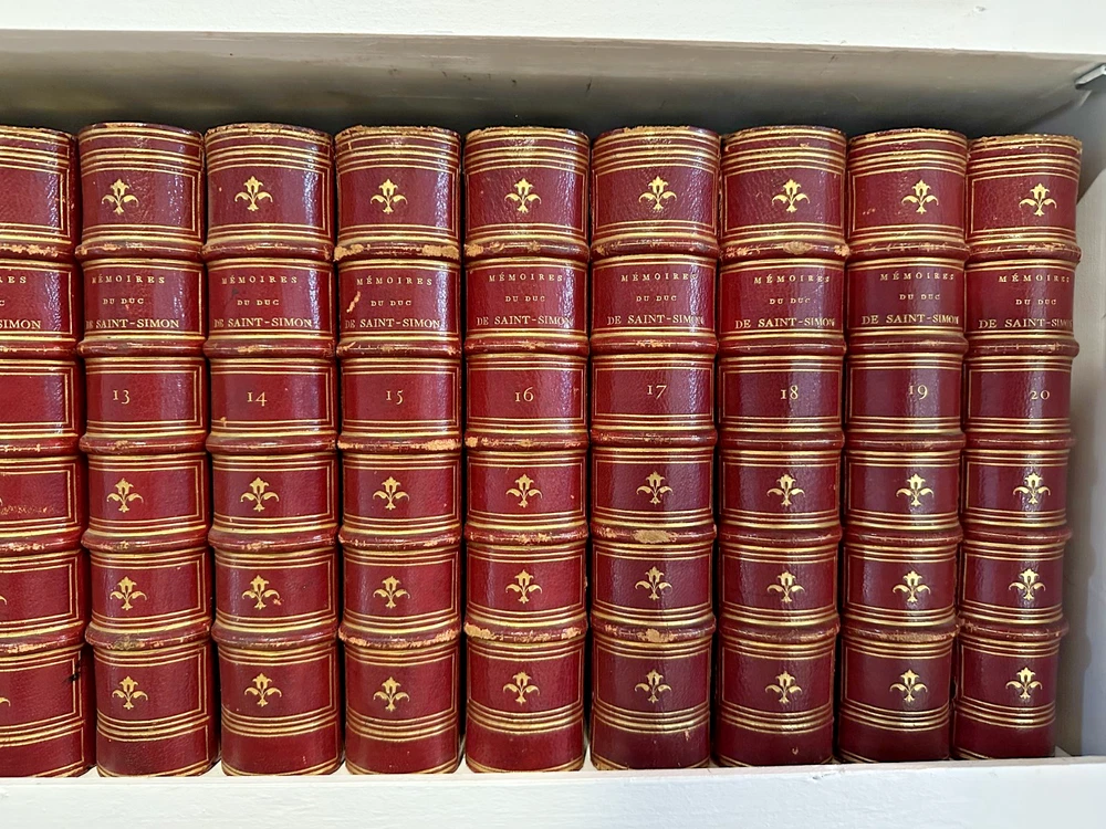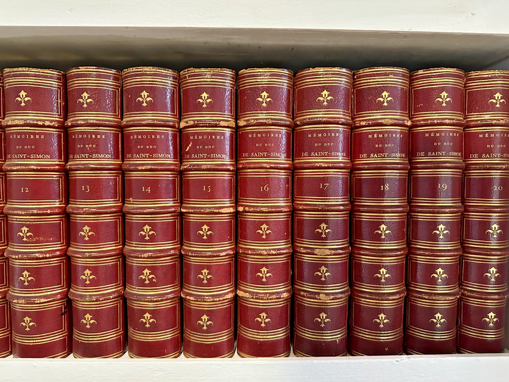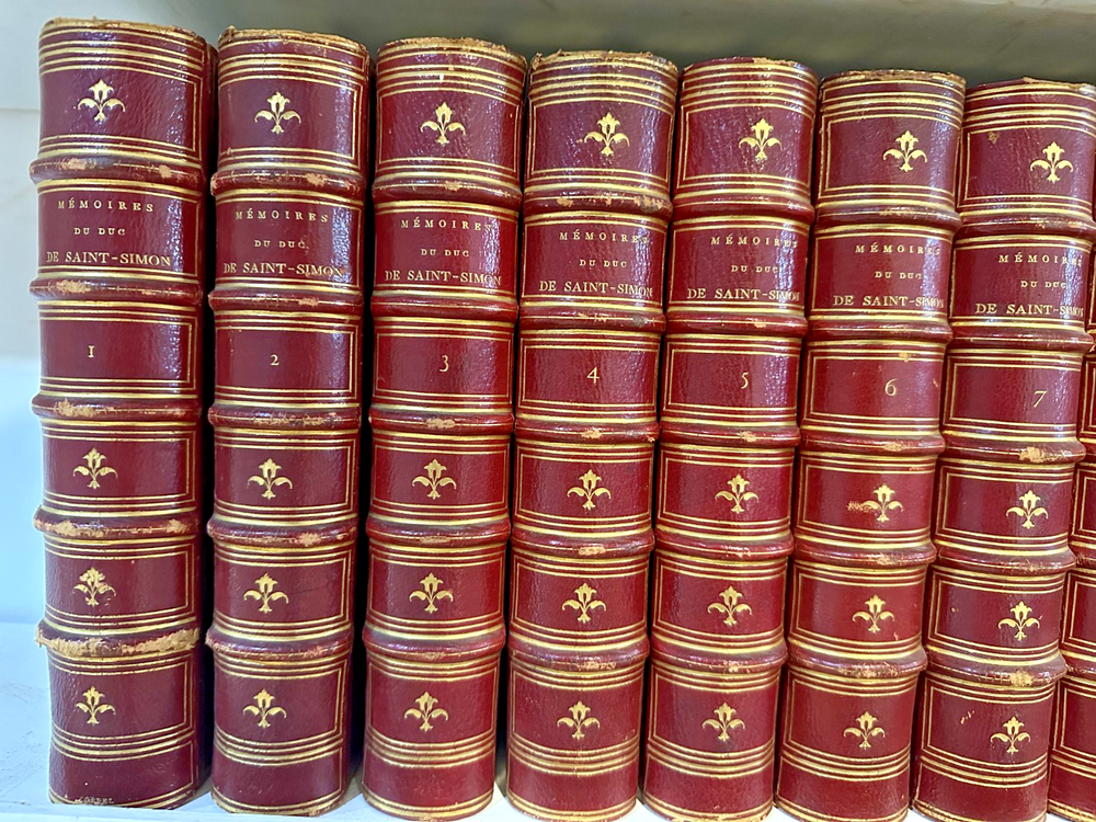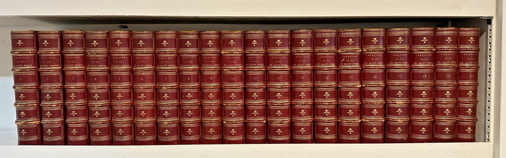 Beautiful, red leather bound, complete 20-volume set published in 1856 in Paris, France. Uniformly bound in red morocco or calf, gilt spines with fleur-de-lis tooling, raised bands and gilt page edges. Louis de Rouvroy, duc de Saint-Simon was a French diplomat most-remembered for his extensive memoires. These ‘ Memoires’ were a collection of essays, thoughts, articles, and stories, which describe his military enemies, the lives of his peers, and his legal disputes. Scholarly 19th Century Edition collated from the original manuscripts, with introduction by Sainte-Beuve. This 1856 edition was edited and annotated by M. Cheruel, beautifully bound in 20 red-leather bound tomes. The 1856 Hachette edition edited by Adolphe Chéruel was the first complete scholarly edition collated with the original manuscripts , with an introduction by the literary critic Charles‑Augustin Sainte‑Beuve . Strong decorative and scholarly presence. Offered as a complete set only. Note that this is a 20 volume set and will be shipped in separate boxes.