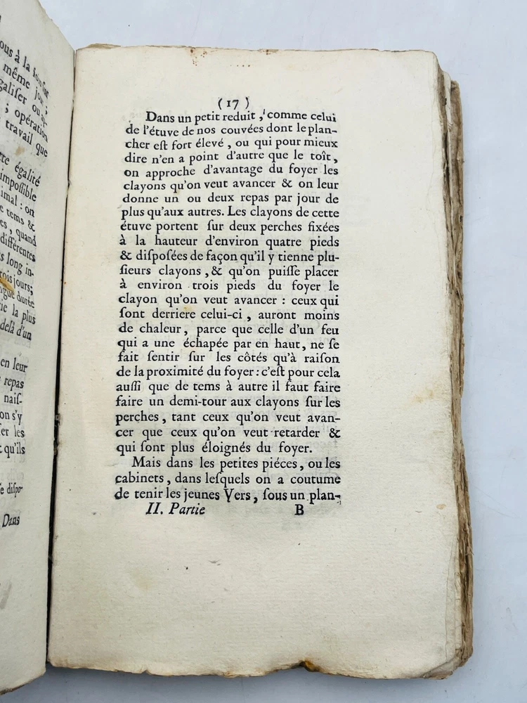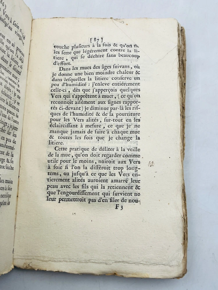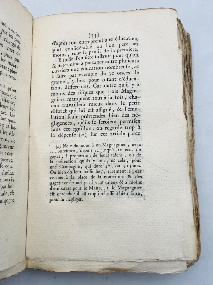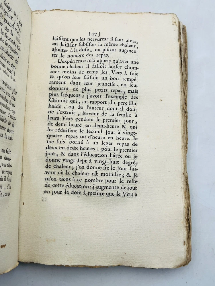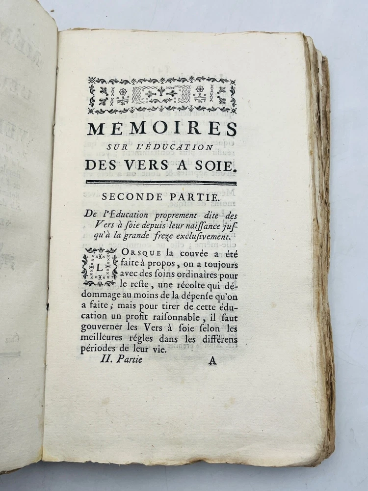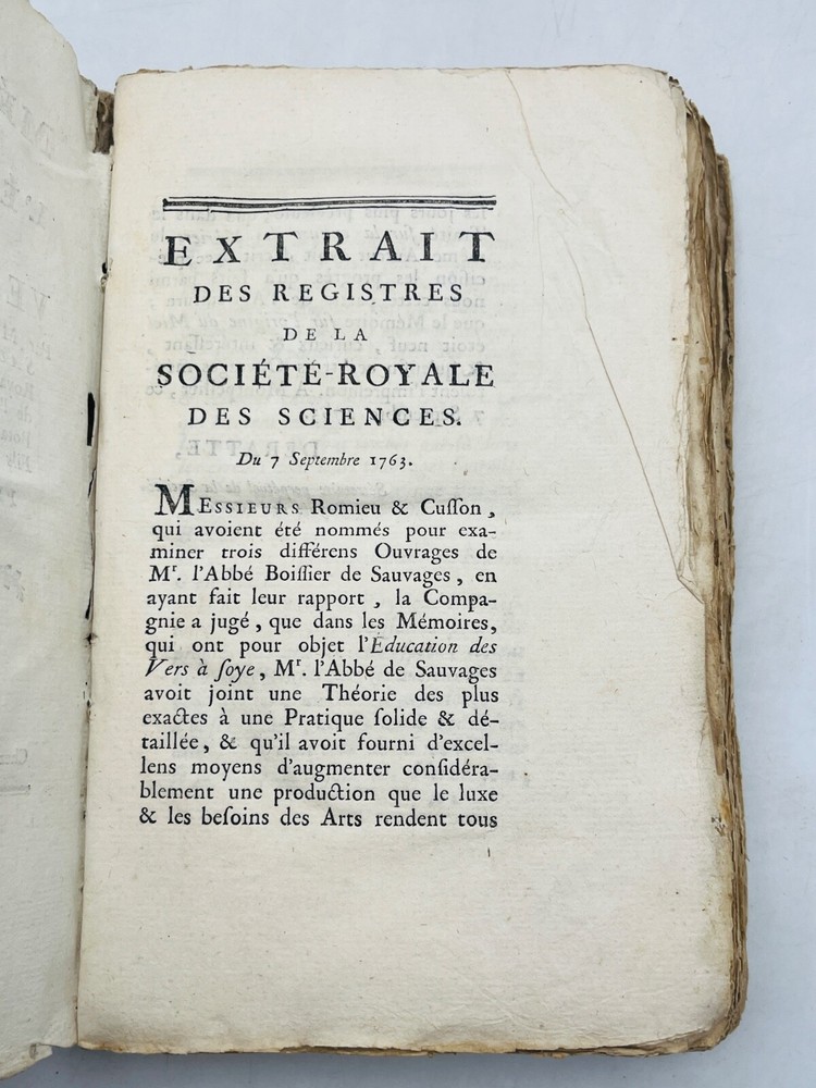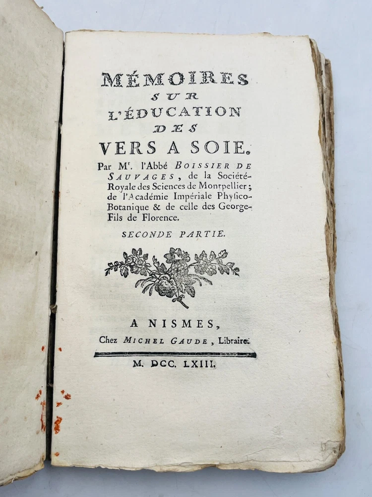 Mémoires sur l’éducation des vers à soie. Par M. l’abbé Boissier de Sauvages , de la Société Royale des Sciences de Montpellier ; de l’Académie Impériale Physico-Botanique & de celle des George-Fils de Florence. Première partie. À Nismes, Chez Michel Gaude , Libraire. M. DCC. LXIII. Edition originale imprimée à Nîmes en 1763, cet ouvrage de l’abbé Boissier de Sauvages, éminent membre des sociétés savantes de Montpellier et de Florence, constitue une contribution pionnière à la sériciculture. L’auteur y expose avec rigueur les méthodes d’élevage des vers à soie, abordant les conditions optimales d’élevage, l’alimentation, ainsi que la prévention des maladies. L’exemplaire présenté est conservé dans sa brochure d’origine, en papier dominoté bleu, très représentatif des productions provinciales de l’Ancien Régime. L’ouvrage est imprimé avec soin par Michel Gaude, libraire nîmois actif au milieu du XVIIIe siècle. D12