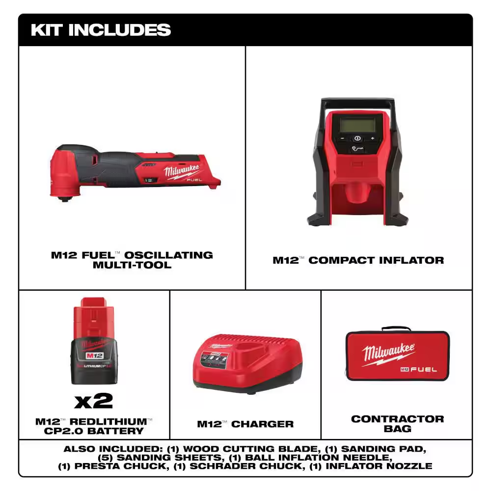 Fast Shipping On All Items 30 Days Money Guarantee Customer Support Excellent Service 100% Satisfaction Satisfaction Guaranteed M12 FUEL 12V Lithium-Ion Cordless Oscillating Multi-Tool Kit W/ 4.0 Ah Battery, Charger, Accessories, Bag & Inflator Specification Accessory Change System Tool Free Accessory Compatibility Accessory Adapter (Included): Compatible with most competitive accessories Batteries Included Yes Battery Amp Hours 4 Ah Battery Power Type Lithium Ion Battery Size 12-volt,M12 Charger Included Charger Included Color Family Red Condition New Cordless Tool Type Oscillating Tool Cordless/Corded Cordless Included Battery Included,Charger,Tool Bag Motor Type Brushless Number of Total Batteries Included 1 Oscillation Arc Range (Degrees) 3.9 Oscillations Per Minute (OPM) 10,000-20,000 Power Tool Features Keyless Chuck,Variable Speed Product Weight (lb) 2.29 lb Returnable 90-Day Tool Only| Kit Kit Tools Product Type Power Tool Voltage (V) 12 V Certifications and Listings UL Certified Manufacturer Warranty 5 Year Tool and 3 Year Battery Product Depth (in) 11.22 in Product Height (in) 3.77 in Product Width (in) 2.29 in 2.29 inches x 11.22 inches x 3.77 inches. Weight: 2.29 lb Item Description Fills car, LT truck and compact equipment tires Comes with a 3-year limited warranty Fastest 12V Cut Speed, Lowest Full Tool Vibration The MILWAUKEE M12 FUEL Oscillating Multi-Tool Kit generates the fastest 12V cut speed, lowest full-tool vibration, and delivers tool-free blade change for faster accessory changes and no misplaced tools. The POWERSTATE Brushless Motor delivers 10,000 to 20,000 OPM while maintaining its speed under load better than the competition to provide the fastest cuts of any 12V competitor. The vibration isolating tool design minimizes vibration making their cuts more comfortable with less fatigue. REDLINK PLUS Intelligence ensures unmatched levels of performance, protection, and compatibility. The M12 REDLITHIUM XC4.0 battery delivers most work of any 12V battery on the market. The M12 FUEL Oscillating Multi-Tool has a 12-Setting Dial allowing users to adjust the speed to the application, and an integrated LED light for maximum visibility. About us We offer the best prices around on high quality products. Our E-store includes media such as books, movies, music and games while offering electronics, toys, sporting apparel, clothing, tools, general home, garden items and more. Shipping We are always working hard to ensure your package arrives as soon as possible. Please understand that some factors like weather, high postal traffic, and the performance of shipping companies are outside of our control. We offer free shipping to the lower 48 states and ship within 2-3 business days of payment, usually sooner. We do not accept P.O. Boxes. Please provide a physical address. For shipping outside of the continental USA, we only use eBay's Global Shipping Program.The item is shipped to KY and then sent to the rest of the world. International customers are responsible for all duties and taxes. Continue to check out to calculate costs for shipping the item to your country. Messages regarding eBay's Global Shipping Program MUST be directed at eBay EXCLUSIVELY. Returns We offer a 30-Day Return Policy on items in which you are not completely satisfied with. You have the option of a full-refund or an exchange of the item. No returns are available on items shipped outside of the USA Satisfaction We try over very best to make sure every customer is completely satisfied. If there's a problem, message us! We're happy to help. Payment Options Shop With Confidence