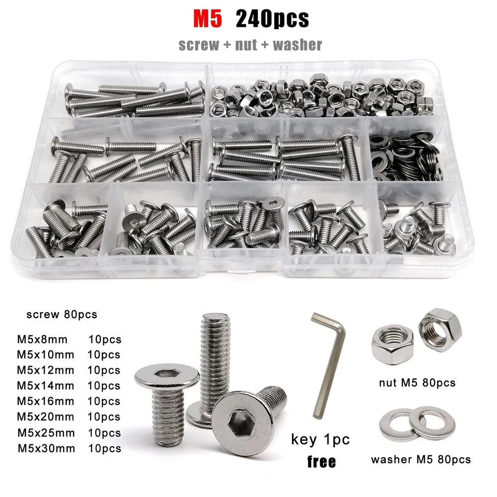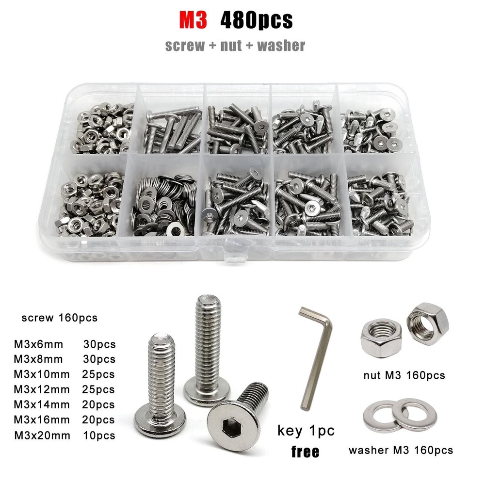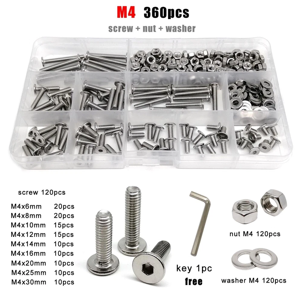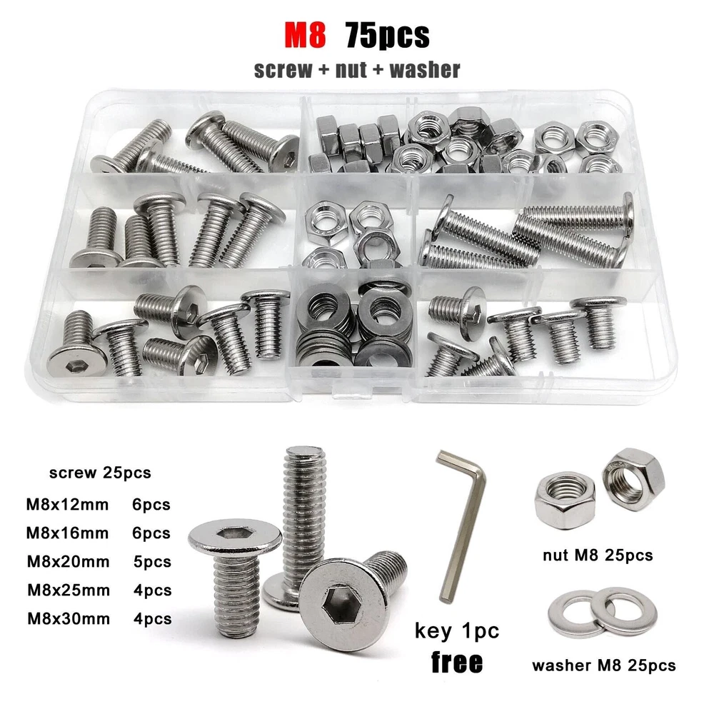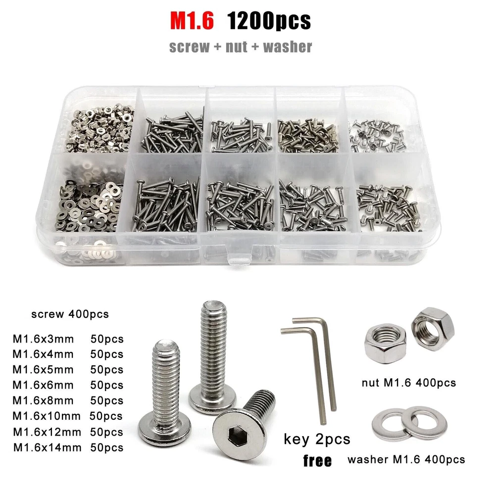 Material 304 (A2-70) stainless steel Box include M1.6 : total 1200pcs + 2pcs screw driver (free) screw 400pcs + nut 400pcs + washer 400pcs + driver 2pcs M2 : total 660pcs + 2pcs screw driver (free) screw 220pcs + nut 220pcs + washer 220pcs + driver 2pcs M2.5 : total 600pcs + 1pc screw driver (free) screw 200pcs + nut 200pcs + washer 200pcs + driver 1pc M3 : total 480pcs + 1pc screw driver (free) screw 160pcs + nut 160pcs + washer 160pcs + driver 1pc M4 : total 360pcs + 1pc screw driver (free) screw 120pcs + nut 120pcs + washer 120pcs + driver 1pc M5 : total 240pcs + 1pc screw driver (free) screw 80pcs + nut 80pcs + washer 80pcs + driver 1pc M6: total 150pcs + 1pc screw driver (free) screw 50pcs + nut 50pcs + washer 50pcs + driver 1pc M8 : total 75pcs + 1pc screw driver (free) screw 25pcs + nut 25pcs + washer 25pcs + driver 1pc On Jan 9, 2026 at 03:49:58 PST, seller added the following information: