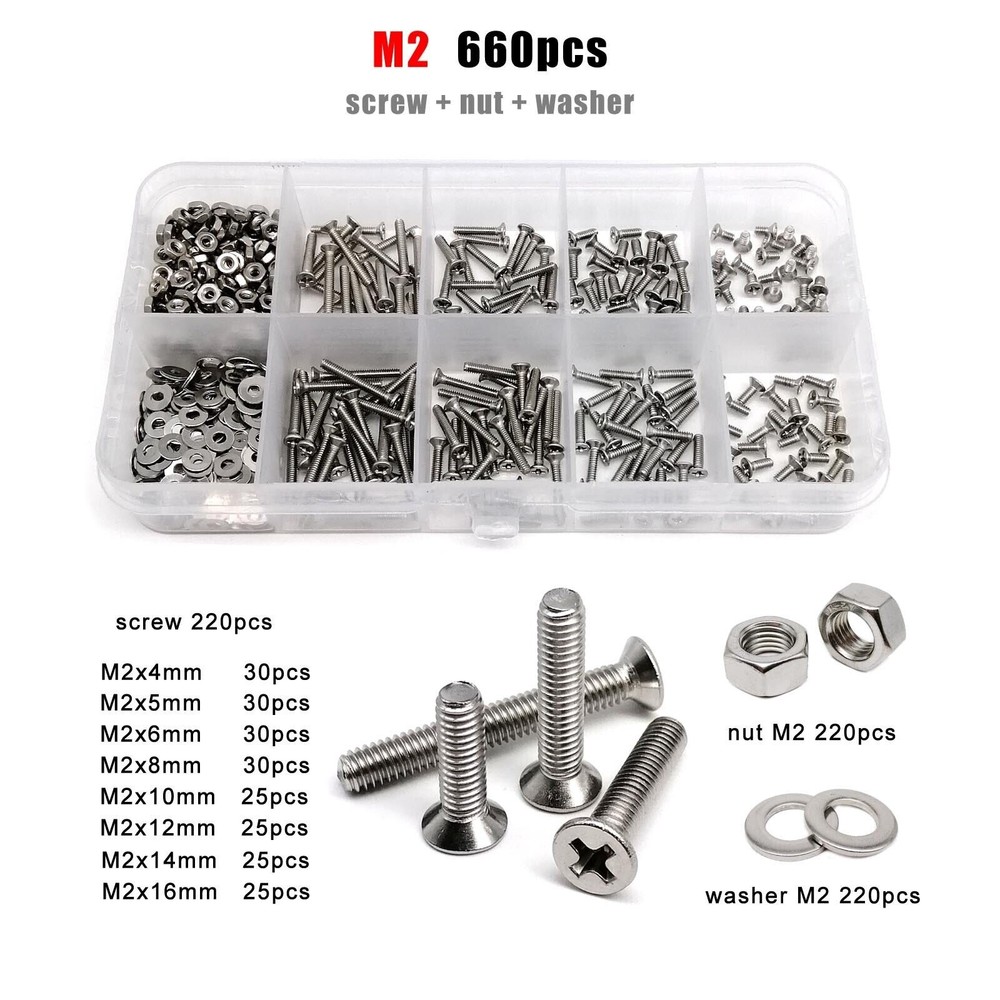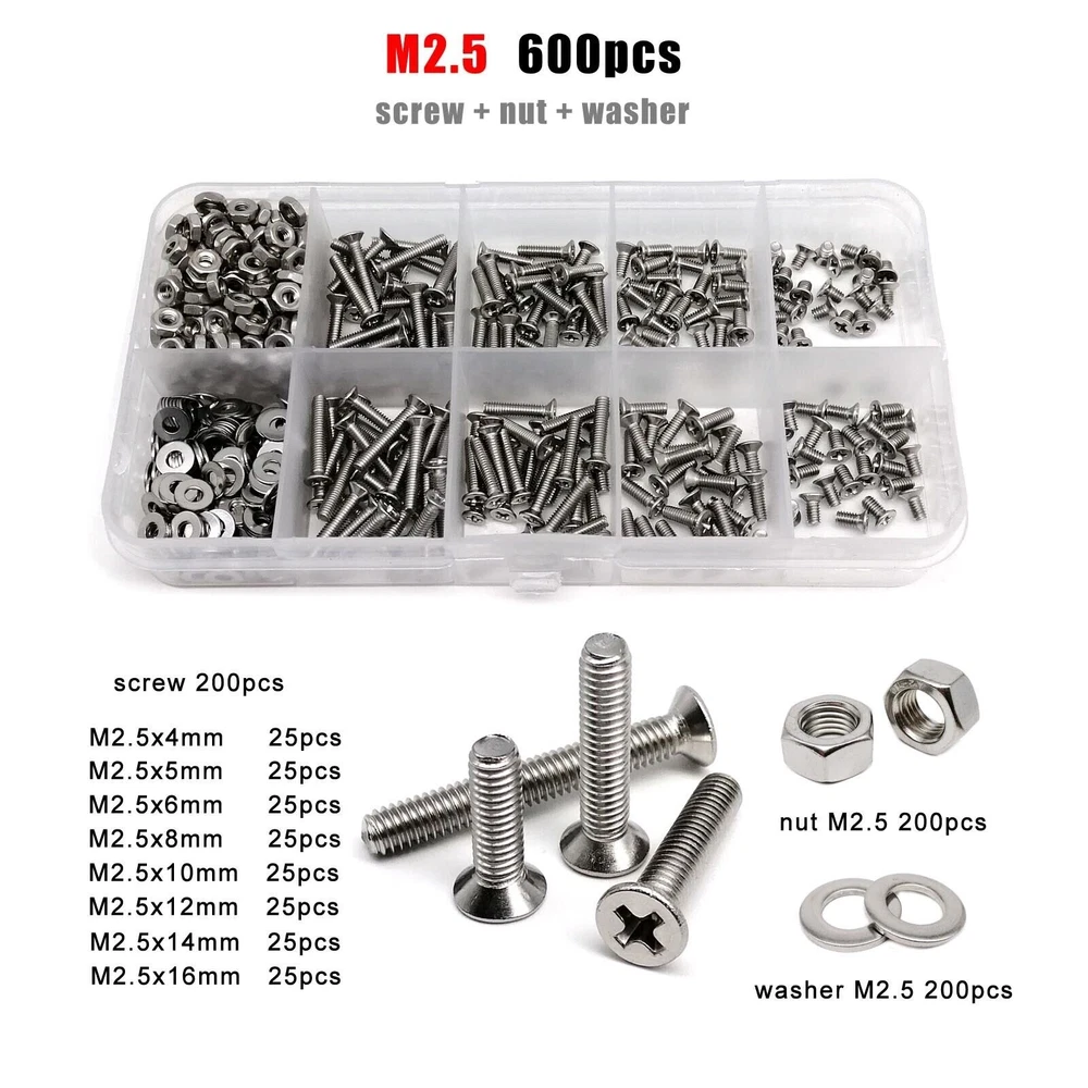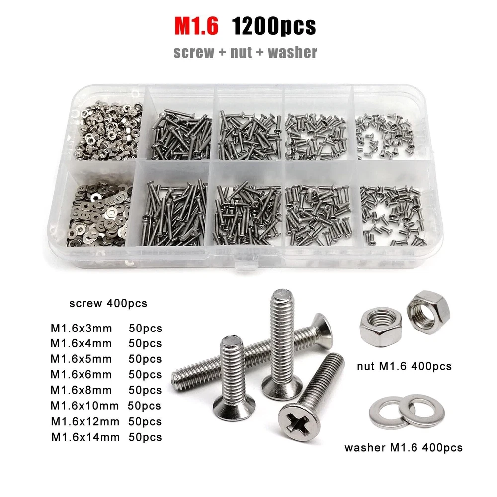 Material 304 (A2-70) stainless steel Box include M1.6 : total 1200pcs + 2pcs screw driver (free) screw 400pcs + nut 400pcs + washer 400pcs + driver 2pcs M2 : total 660pcs + 2pcs screw driver (free) screw 220pcs + nut 220pcs + washer 220pcs + driver 2pcs M2.5 : total 600pcs + 1pc screw driver (free) screw 200pcs + nut 200pcs + washer 200pcs + driver 1pc M3 : total 480pcs + 1pc screw driver (free) screw 160pcs + nut 160pcs + washer 160pcs + driver 1pc M4 : total 360pcs + 1pc screw driver (free) screw 120pcs + nut 120pcs + washer 120pcs + driver 1pc M5 : total 240pcs + 1pc screw driver (free) screw 80pcs + nut 80pcs + washer 80pcs + driver 1pc M6: total 150pcs + 1pc screw driver (free) screw 50pcs + nut 50pcs + washer 50pcs + driver 1pc M8 : total 75pcs + 1pc screw driver (free) screw 25pcs + nut 25pcs + washer 25pcs + driver 1pc On Jan 9, 2026 at 03:40:59 PST, seller added the following information: