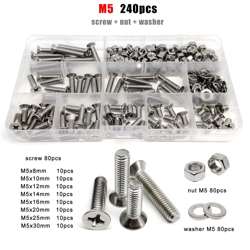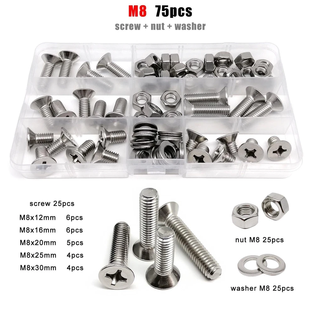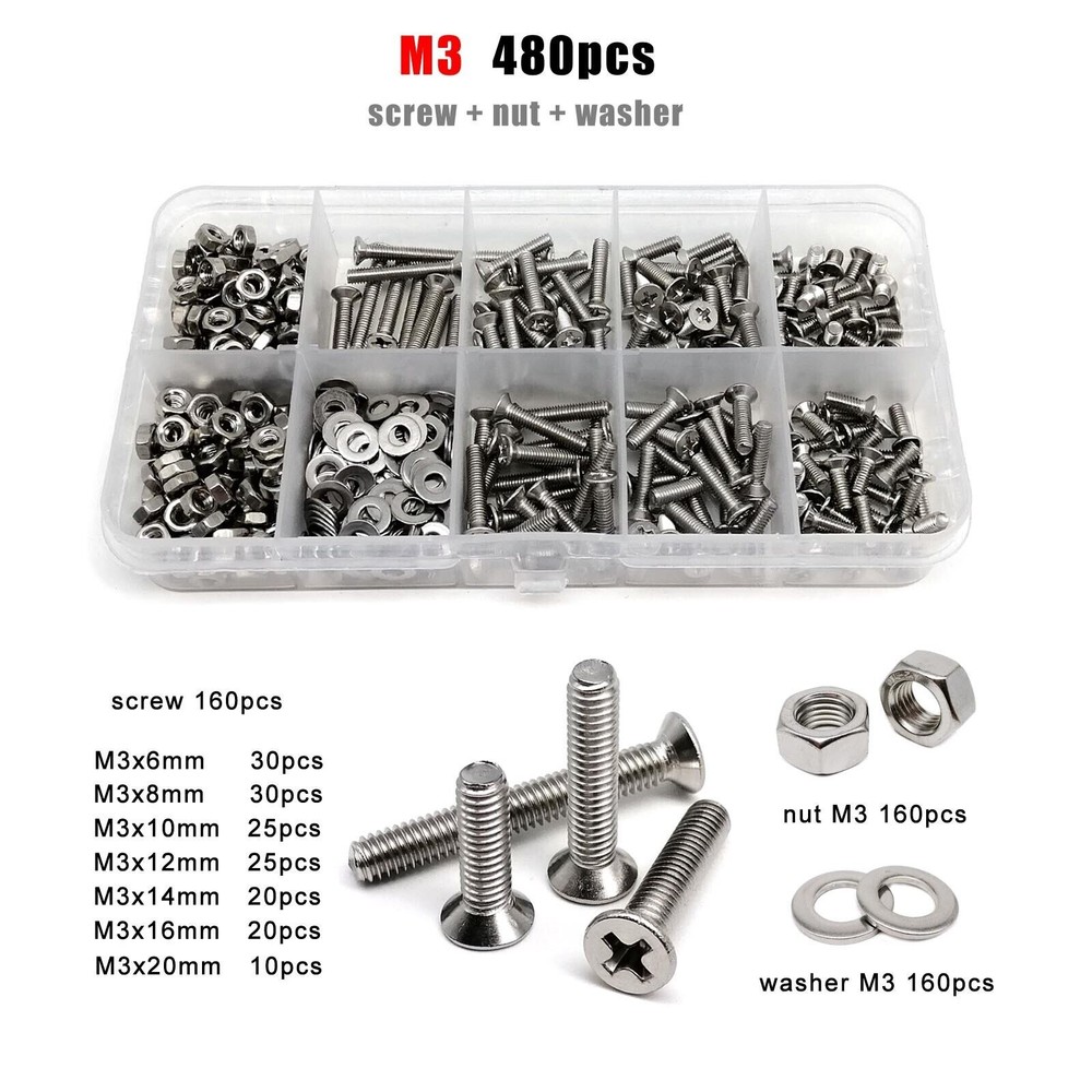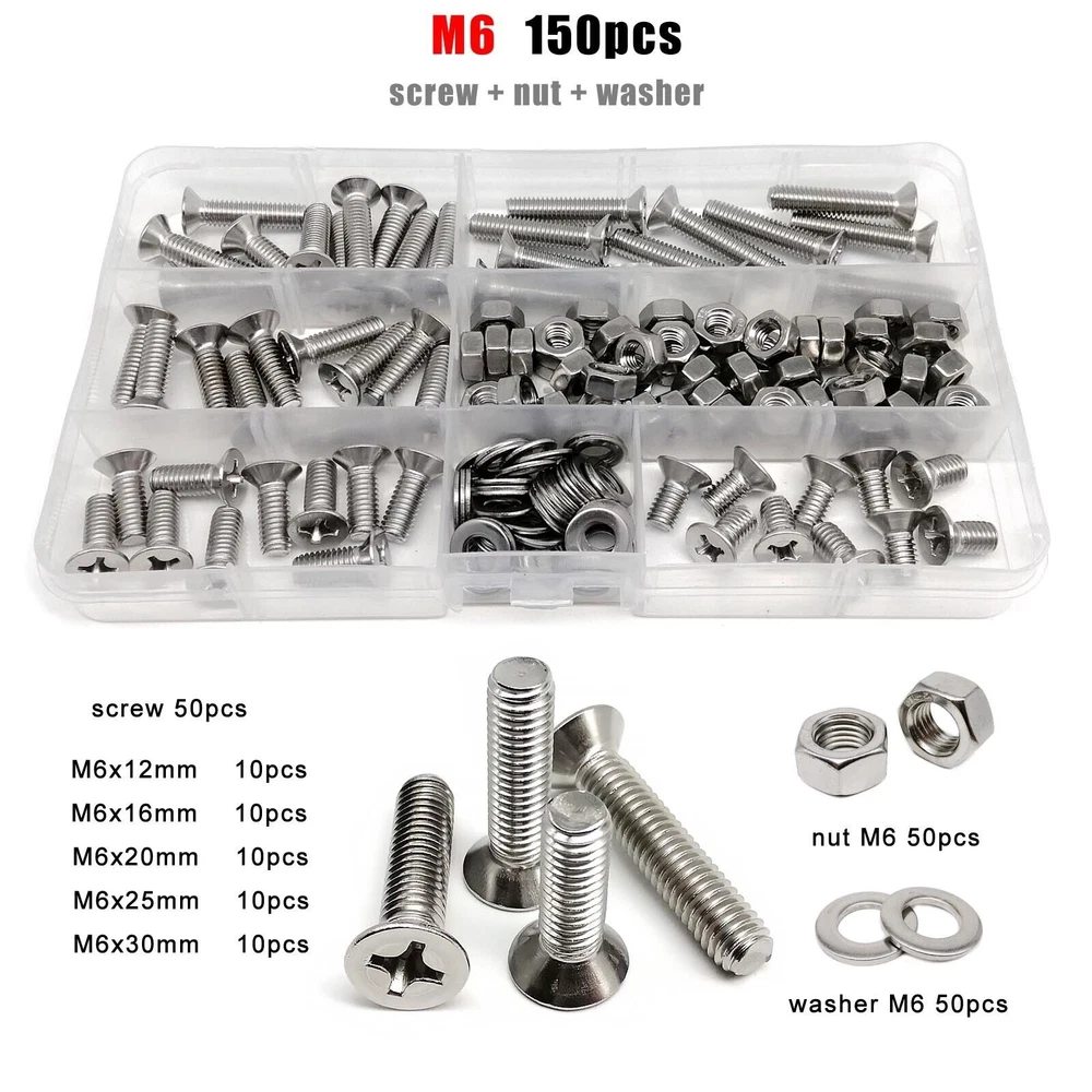 Material 304 (A2-70) stainless steel Box include M1.6 : total 1200pcs + 2pcs screw driver (free) screw 400pcs + nut 400pcs + washer 400pcs + driver 2pcs M2 : total 660pcs + 2pcs screw driver (free) screw 220pcs + nut 220pcs + washer 220pcs + driver 2pcs M2.5 : total 600pcs + 1pc screw driver (free) screw 200pcs + nut 200pcs + washer 200pcs + driver 1pc M3 : total 480pcs + 1pc screw driver (free) screw 160pcs + nut 160pcs + washer 160pcs + driver 1pc M4 : total 360pcs + 1pc screw driver (free) screw 120pcs + nut 120pcs + washer 120pcs + driver 1pc M5 : total 240pcs + 1pc screw driver (free) screw 80pcs + nut 80pcs + washer 80pcs + driver 1pc M6: total 150pcs + 1pc screw driver (free) screw 50pcs + nut 50pcs + washer 50pcs + driver 1pc M8 : total 75pcs + 1pc screw driver (free) screw 25pcs + nut 25pcs + washer 25pcs + driver 1pc On Jan 9, 2026 at 03:40:59 PST, seller added the following information: