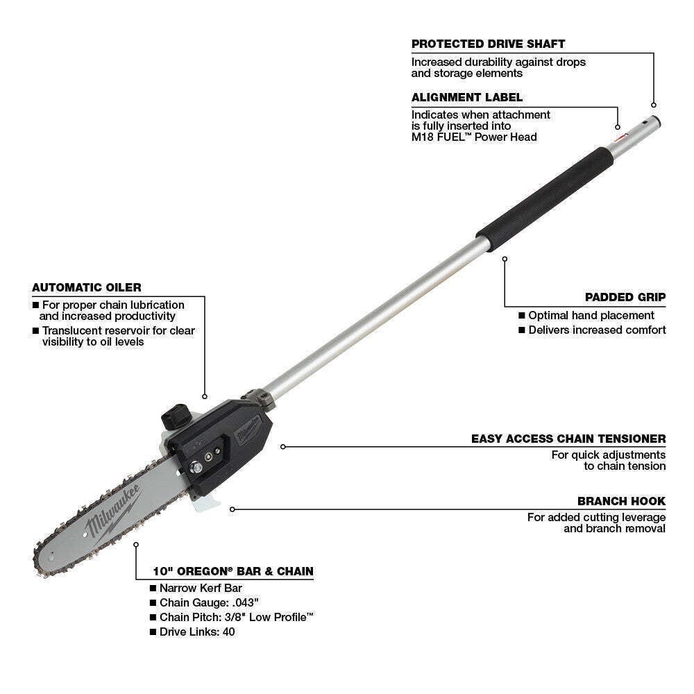 You may also like Dewalt 20V Max Brushless Cordless Edger Bare Tool DCED400B NEW US 179.55 USD 189.0 USD Free shipping 5% off DEWALT DCG418X1 FLEXVOLT 60V MAX* Angle Grinder Kickback Brake Kit 4-1/2-Inch US 284.05 USD 299.0 USD Free shipping 5% off Milwaukee M18 Compact Vacuum Model 0882-20 High Performance Motor Bare Tool US 122.55 USD 129.0 USD Free shipping 5% off DEWALT DCST922B 20V MAX Li-Ion 14 in. Cordless String Trimmer L Shaft Bare Tool 170.99 USD 179.99 USD Free shipping 5% off Buckeye Fire Equipment 50000 Fire Extinguisher,2.5 Gal Capacity, Class A Ul NEW 157.69 USD 165.99 USD Free shipping 5% off Milwaukee 2528-21G1 12V M12 1 Gallon Handheld Sprayer Kit NEW US 179.55 USD 189.0 USD Free shipping 5% off DEWALT 20V Max 550 PSI Power Cleaner Bare Tool Model DCPW550B New US 137.74 USD 144.99 USD Free shipping 5% off Dewalt DWST08530 2.0 DXL 30" Heavy Duty Dolly NEW 179.55 USD 189.0 USD Free shipping 5% off DeWALT DCS520ST1 60V 6-1/2-Inch Cordless Track Saw Kit w/ Track NEW US 645.05 USD 679.0 USD Free shipping 5% off Makita XTS01Z 18-Volt 3/8-Inch Cordless Lithium-Ion Crown Stapler Bare Tool NEW 226.1 USD 238.0 USD Free shipping 5% off You may also like Dewalt 20V Max Brushless Cordless Edger Bare Tool DCED400B NEW US 179.55 USD 189.0 USD Free shipping 5% off DEWALT DCG418X1 FLEXVOLT 60V MAX* Angle Grinder Kickback Brake Kit 4-1/2-Inch US 284.05 USD 299.0 USD Free shipping 5% off Milwaukee M18 Compact Vacuum Model 0882-20 High Performance Motor Bare Tool US 122.55 USD 129.0 USD Free shipping 5% off DEWALT DCST922B 20V MAX Li-Ion 14 in. Cordless String Trimmer L Shaft Bare Tool 170.99 USD 179.99 USD Free shipping 5% off Buckeye Fire Equipment 50000 Fire Extinguisher,2.5 Gal Capacity, Class A Ul NEW 157.69 USD 165.99 USD Free shipping 5% off Milwaukee 2528-21G1 12V M12 1 Gallon Handheld Sprayer Kit NEW US 179.55 USD 189.0 USD Free shipping 5% off DEWALT 20V Max 550 PSI Power Cleaner Bare Tool Model DCPW550B New US 137.74 USD 144.99 USD Free shipping 5% off Dewalt DWST08530 2.0 DXL 30" Heavy Duty Dolly NEW 179.55 USD 189.0 USD Free shipping 5% off DeWALT DCS520ST1 60V 6-1/2-Inch Cordless Track Saw Kit w/ Track NEW US 645.05 USD 679.0 USD Free shipping 5% off Makita XTS01Z 18-Volt 3/8-Inch Cordless Lithium-Ion Crown Stapler Bare Tool NEW 226.1 USD 238.0 USD Free shipping 5% off Features RPM: 4,600 Bar Length: 10" Chain Gauge: .043" Chain Pitch: 3/8" Low Profile Compatible with the M18 FUEL Power Head w/ QUIK-LOK Automatic Oiler: For Proper Chain Lubrication and Increased Productivity Easy Access Chain Tensioner: Quick Adjustments to Chain Tension Translucent Oil Reservoir: Clear visibility to oil levels Branch Hook: For Added Cutting Leverage and Branch Removal Padded Grip: For Optimal Hand Placement and Increased Comfort What's in The Box 10-Inch Pole Saw QUIK-LOK Attachment Power Head Sold Separately Battery and Charger Sold Separately Owner's Manual Warranty 3-Year Limited Factory Warranty 30 Day Satisfaction Guaranteed Specifications Sku 49-16-2720 Brand Milwaukee Voltage 18V Bar Length 10 in. No Load Speed 4,600 Rpm Chain Gauge .043 in. Chain Pitch 3/8 in. Low Profile Length 50.25 in. Width 3.5 in. Height 5.75 in. Product Weight 4.2 lbs. Shipping Weight 6 lbs.