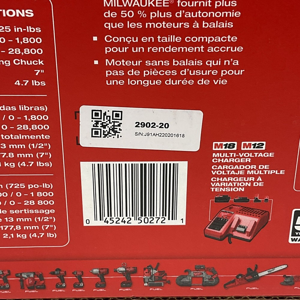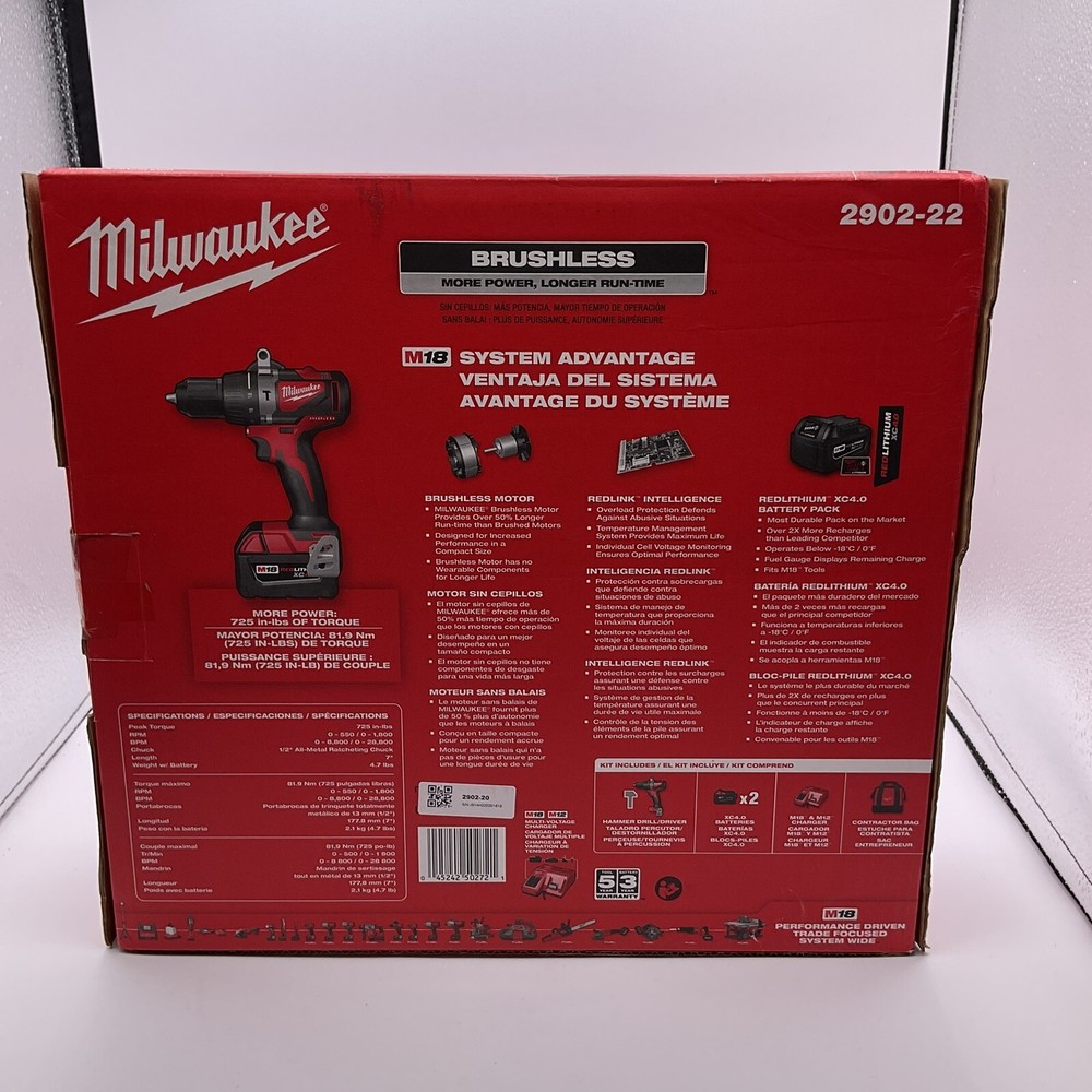 You are looking at a new sealed Milwaukee 2902-22 M18 1/2" Brushless Hammer Drill Kit is a powerful and compact cordless drill kit that can handle a variety of drilling tasks. With a maximum torque of 725 in-lbs and a maximum working torque of 60.4 ft-lb, this drill kit can handle up to 3 1/2" in wood and up to 5/8" in concrete. It features a brushless motor, 18 clutch settings, and a speed of 1200 RPM, allowing for efficient and precise drilling. The kit includes two batteries with a battery capacity of 4.0 Ah and a voltage of 18V, as well as a charger and cordless drill class compact. Please notice you will receive pictured item. About Us Customer service is our #1 priority! If for any reason you are dissatisfied with your purchase we offer a 30 day money back guarantee unless otherwise noted in the listing (AS-IS/For Parts - No returns.) We only accept items back in the condition that they were sent to you. Items that are listed AS-IS are not eligible for this money back guarantee. If you are unhappy with your purchase PLEASE contact us BEFORE leaving feedback or contacting eBay so we can work with you to resolve any problems. Shipping When we charge shipping to our customers we only pass on to our buyers exact shipping costs - no added fees. We offer combined shipping for multiple items purchased, so if you purchase more than 1 item from us, please wait for us to combine shipping costs. We require signature confirmation on all items that sell for $750.00 & more per eBay's selling policy. We also insurance all items that sell for $250.00 & more. PLEASE NOTE: WE DO NOT WORK/SHIP ON HOLIDAYS OR WEEKENDS! We use the eBay Global Shipping program for international shipping. DLLR License #991 Please note, we are not an authorized distributor or manufacture's representative of this item. *This product may contain a chemical known to the state of California to cause cancer and birth defects or other reproductive harm* Track Page Views With Auctiva's Counter