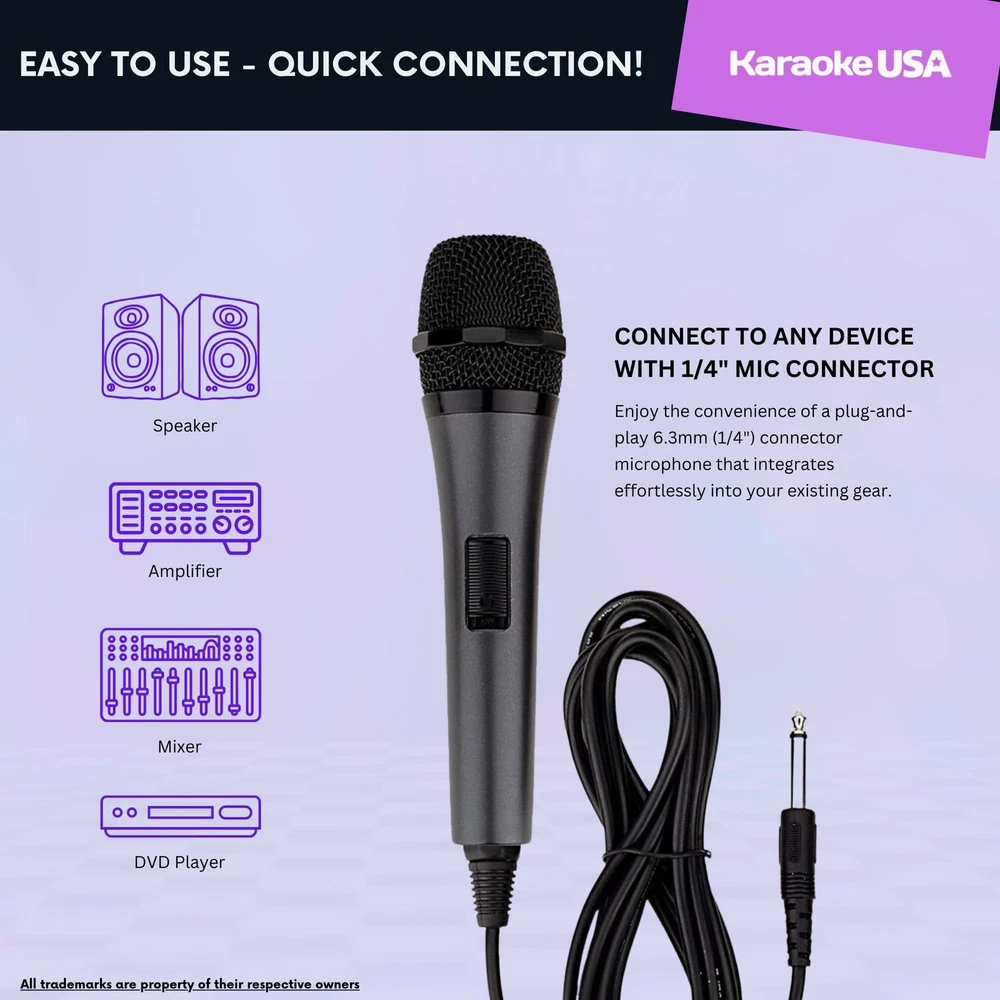"M187 UPC: 879408007115 Title: Professional Dynamic Microphone (Corded) Features: Professional Dynamic Microphone is an economical solution to have an extra microphone on hand. It's also the perfect microphone to hand to your rowdy party guests instead of your expensive microphone. Professional Microphone (Corded) Microphone Type: Dynamic Frequency Response: 80Hz~11kHz Sensitivity: -72dB +/- 3dB (1kHz) Output Impedance: 620 ohms +30% (1kHz) Cord: 4.5mm x 6 feet 7 inches Connector: 6.3mm (1/4") Unbalanced Signal" Professional Microphone (Corded) Microphone Type: Dynamic Frequency Response: 80Hz~11kHz Sensitivity: -72dB +/- 3dB (1kHz) Output Impedance: 620 ohms +30% (1kHz)