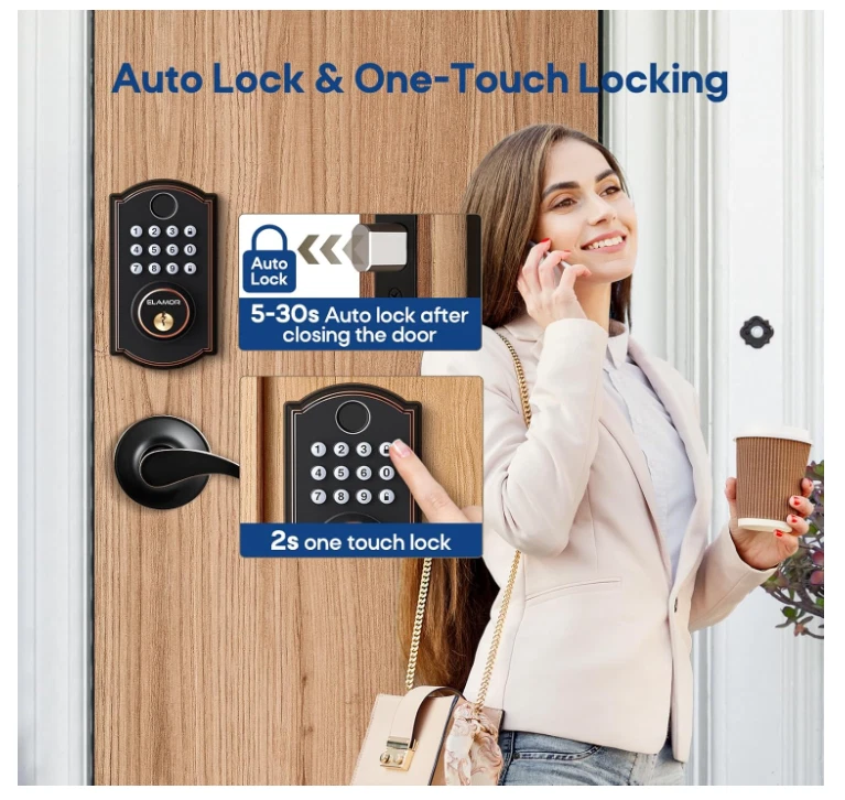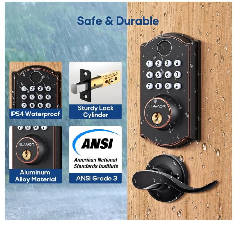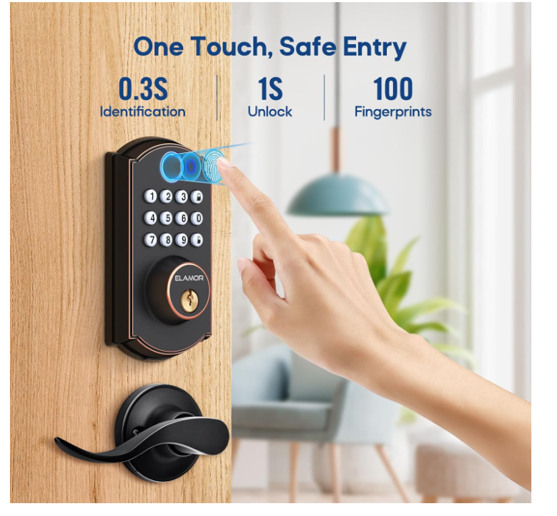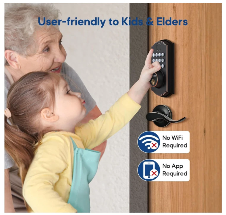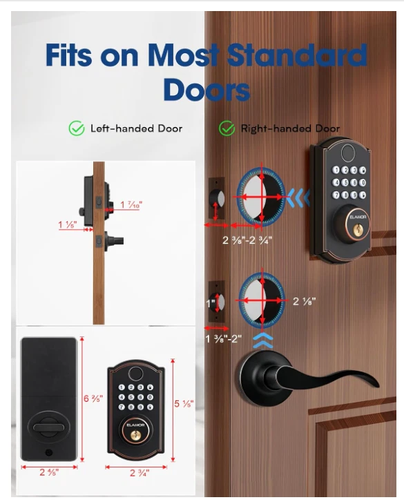 Advanced Fingerprint Unlock: Equipped with cutting-edge biometric recognition, our smart door lock identifies fingerprints in 0.3 seconds and unlocks in 1 second with a 99.99% accuracy rate, ensuring fast and reliable access. 3-in-1 Keyless Unlock: Our fingerprint door lock with 2 Lever handles supports up to 100 fingerprints and 50 PIN codes, perfect for large families or shared spaces. It includes 2 backup keys for emergencies, and no app or Wi-Fi is needed—your finger is the key to unlocking. Auto Lock & One-Touch Locking: The automatic locking feature secures your door 5–30 seconds after unlocking, ensuring safety even if you're distracted. One-touch locking adds convenience for quick and secure closure. Durable & Long-Lasting: Built with a robust aluminum alloy, IP54 waterproofing, and a durable lock cylinder, the front door handle sets includes a low-battery LED indicator and emergency USB Type-C power supply, offering lasting reliability and protection. Easy to Install: Install in minutes with a basic screwdriver. The adjustable design fits most door frames, with a center distance range of 2-3/8" (60mm) to 2-3/4" (70mm) for seamless integration.