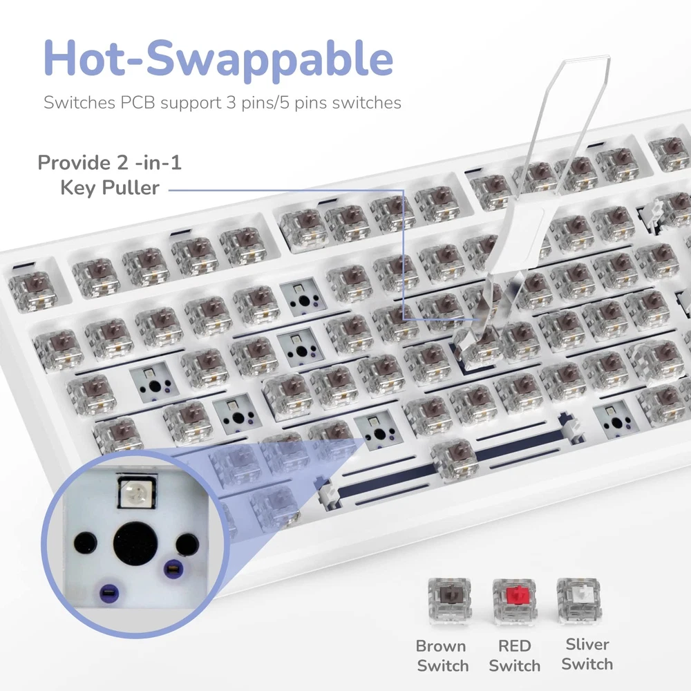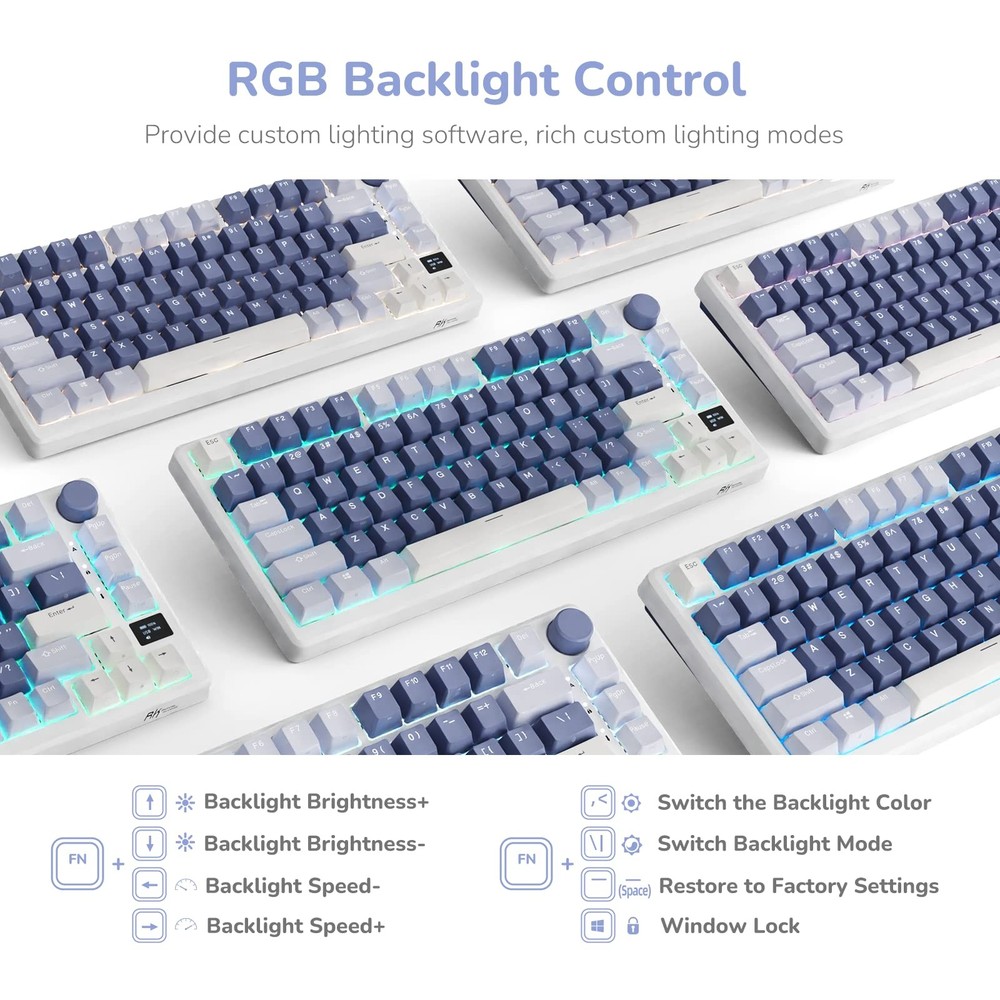 has a professional engineering and technical staff and R and D team to provide you with high-quality design and production. We are dedicated to improving the sense of gaming experience for every player. This gaming keyboard with the Fast Silver Switch is suitable for the starters of a gaming keyboard. Since the establishment of the brand, we have always gained many loyal followers with excellent product quality and good customer experience. -RK M75 wireless gaming keyboard, which is 75% layout with 81 keys, which saves 25% of the wireless keyboard space and makes the desktop more concise. -This wireless keyboard has an OLED screen and rotary knob. And it dispays battery level, WIN/MAC, wired/2.4G/Bluetooth mode, volume level. You could rorate the knob for choosing switch machine and adjusting the volume. -RK M75 wireless keyboard is coming with triple mode connection, which supports USB-C wired mode, 2.4G wireless mode and Bluetooth 5.1 mode. Up to 3 devices can be connected via Bluetooth at the same time, and can be easily switched by the knob. -High-quality PCB of this wireless keyboard supports 3/5-pin hot-swappable, so you can make your own unique wireless keyboard without soldering. -RGB Backlight: this gaming keyboard supports 18 RGB backlight modes, 8 monochrome backlight modes and 1 full-color backlight. You could C=customizable RGB lighting, which provides you with cool and attractive lighting. will always bring you different ideas, from constant innovation and improvement, whether you are a keyboard novice or a gaming enthusiast, you can find the most suitable keyboard for you. Size: 327.6(L)×138.5(W)×42(H)±2 Layout: 81 keys Backlight: Single light/RGB Switch: Mechanical switch Package Included 1 x RK M75 mechanical keyboard 1 x 2.4GHz daptor 1 x type-C-USB cable 1 x keycap&switch puller 1 x user manual 4 x replace switches Multi-function OLED Smart Display & Knob: RK M75 keyboard features a built-in OLED screen and rotary knob; Display battery level, connection mode, and volume, while the knob adjusts volume, switches modes, and powers the keyboard Gasket-Mount Keyboard: RK M75 mechanical keyboard features a gasket structure with four layers of sound-absorbing material, which enhance typing comfort by reducing key noise and vibration Hot-swappable Fast Silver Switch: High-quality PCB supports 3/5-pin hot-swappable switches for easy customization; The silver switches deliver improved accuracy, reduced false touches, and faster triggering; Ideal for long gaming sessions and gamers Multi-device Connection: This 75% keyboard supports seamless bluetooth connectivity for up to 3 devices simultaneously, allowing you to switch seamlessly using the knob RGB Backlight: With 18 dynamic RGB lighting modes, 8 elegant monochrome options and a vibrant full-color setting, you can personalize your keyboard's ambiance to suit your style with RK software