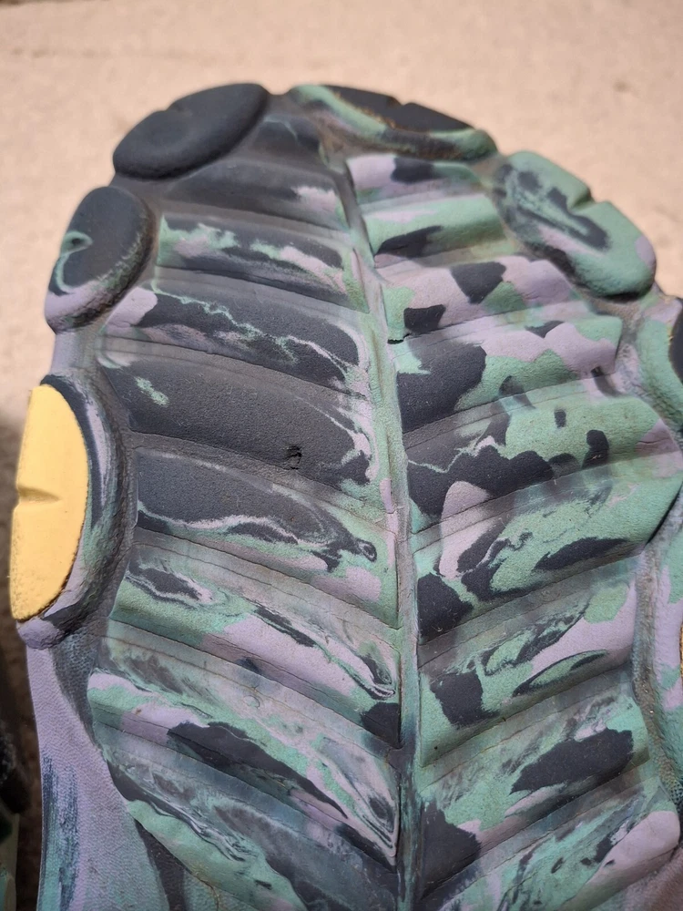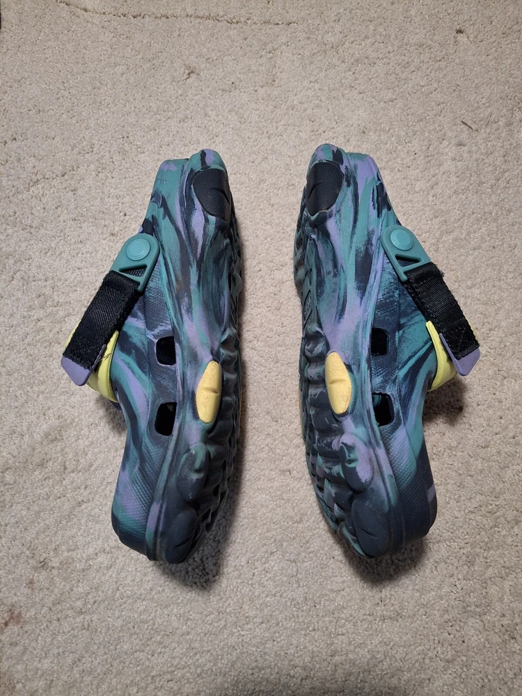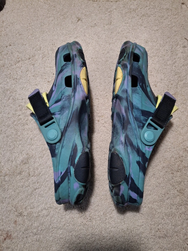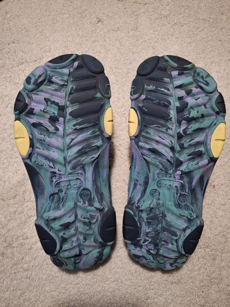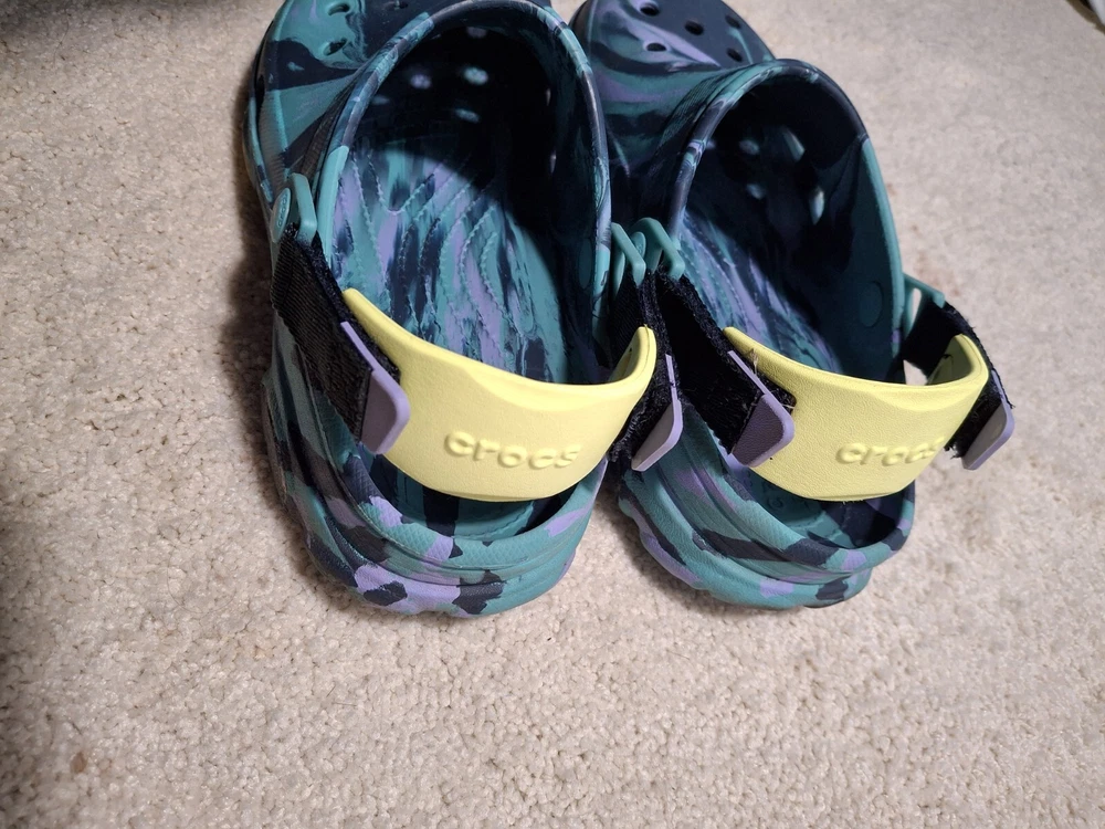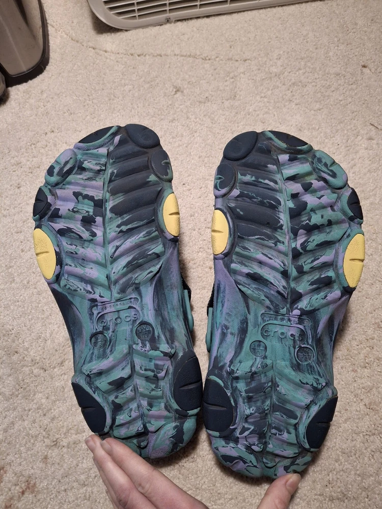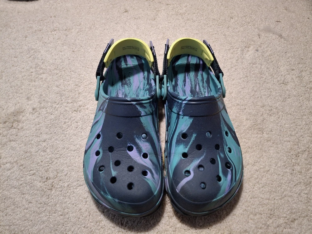 M/8 W/10 Navy/Multi Crocs Unisex-Adult Classic All Terrain Clogs. The biggest imperfections are shown in the 5th picture. Tread is very good. Good Condition. Please let me know if you need more pictures! Thanks for looking!