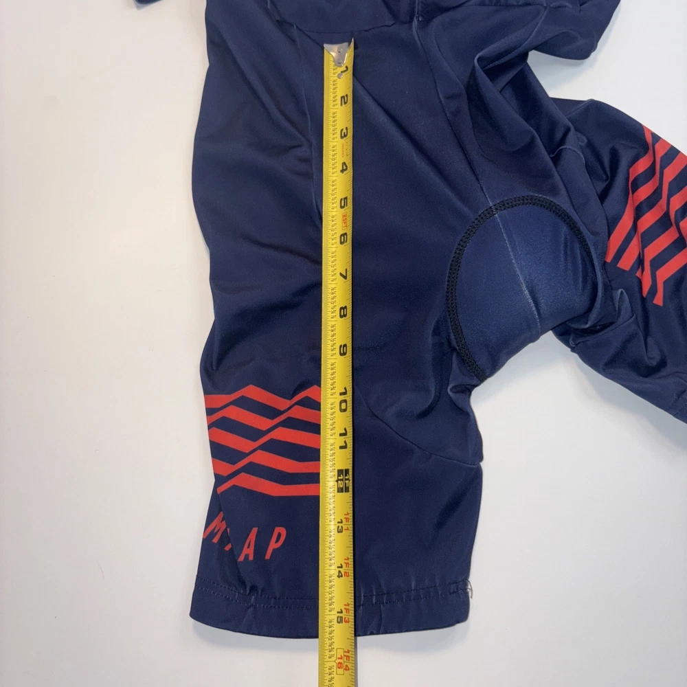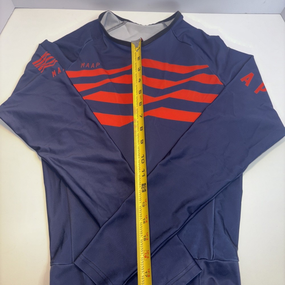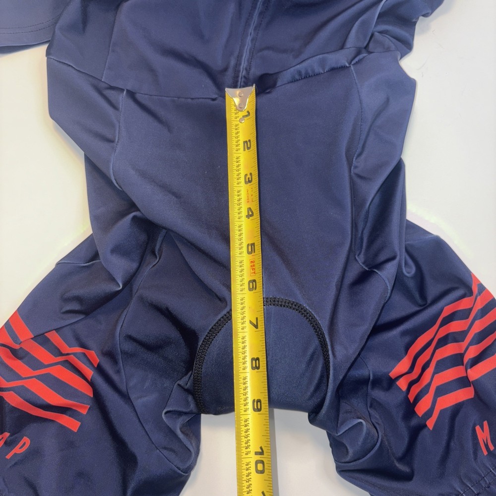 The MAAP Navy Long Sleeve Padded Suit is designed for adult men who enjoy cycling. The suit is made of a polyester blended fabric and features a navy and red color with the MAAP brand name. It has a compression style and is suitable for athletic fit. The suit is perfect for all seasons, including winter, summer, fall, and spring. It has a padded feature, making it comfortable for cycling. The closure is a pull-on style, and it is suitable for activewear occasions. The suit is categorized under Sporting Goods, Cycling, Cycling Clothing, and Shorts. Great overall condition, some color wear in bottom area. Great weather coming up get ready to get on the bike and cycle. BB24410