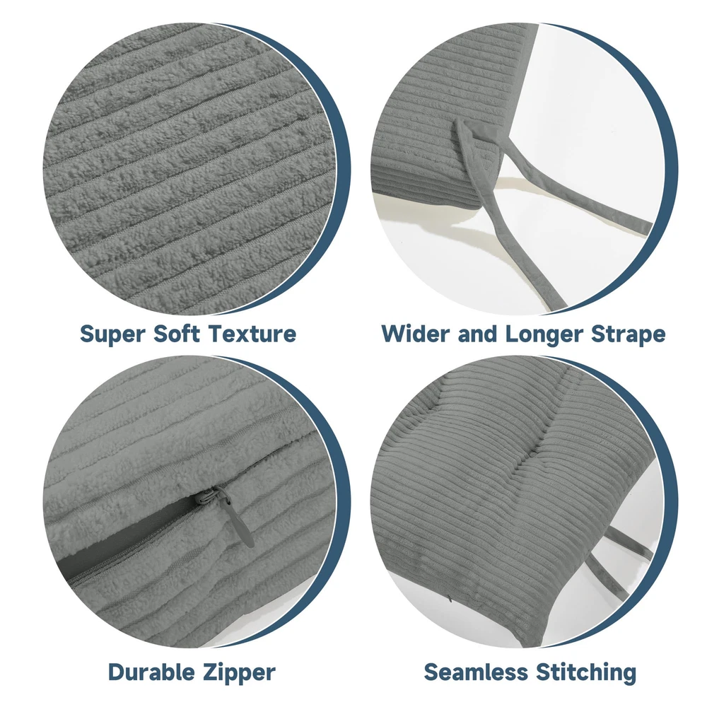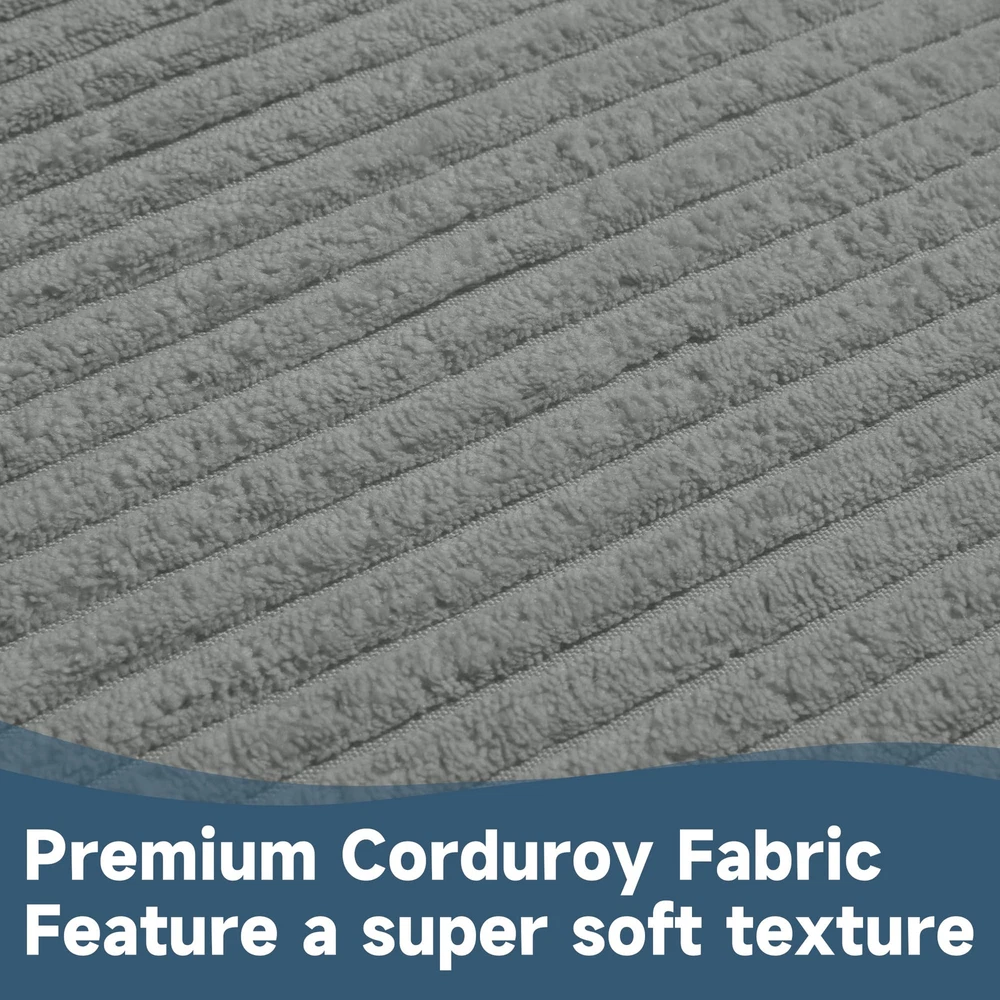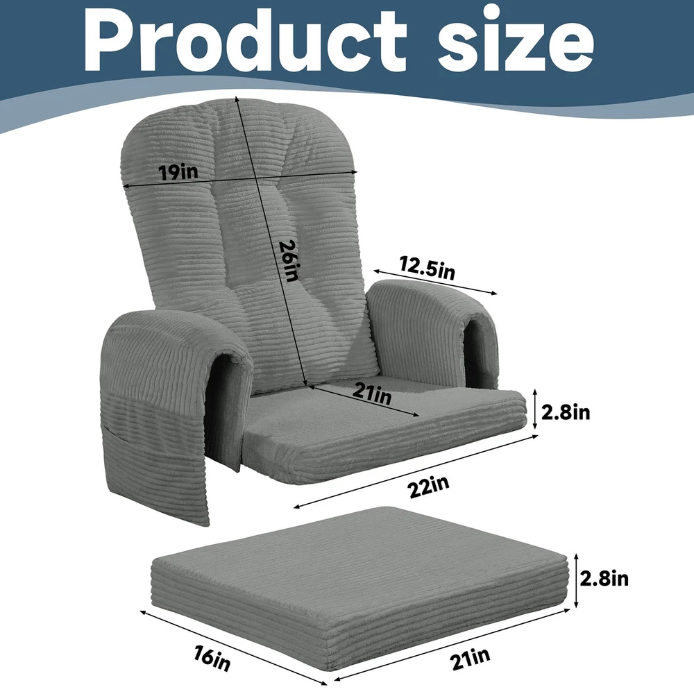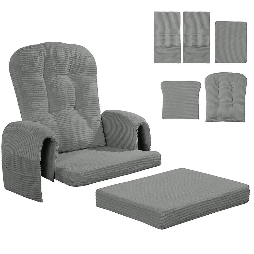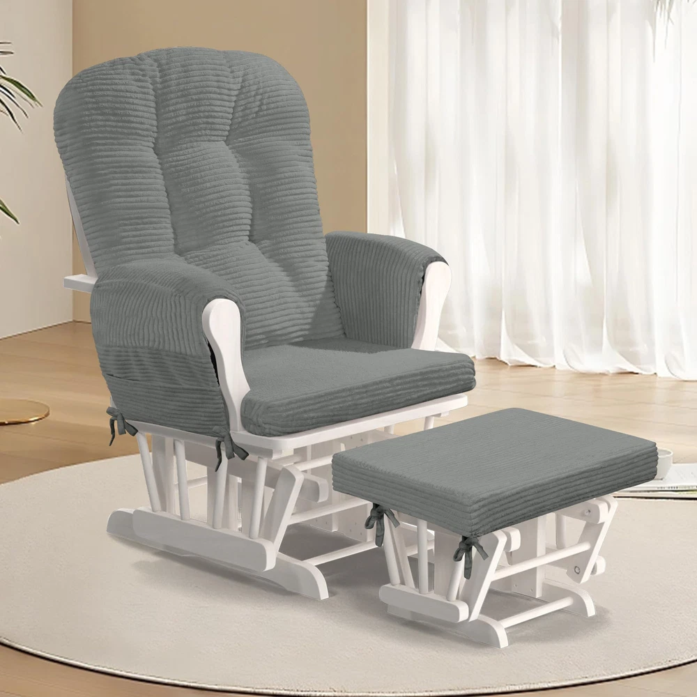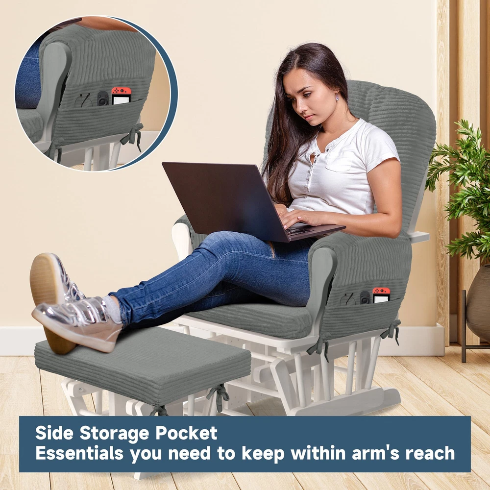 【Set Information】(NO Gliding Chair Included) Include 5 pieces. 1 backrest cushion (26*19 inches). 1 seat cushion (22""W*21""L*2.8""H). 1 ottoman cushion (21""W*16""L*2.8""H). 2 armrest cushions (12.5""L) 【Ergonomic Design】Glider rocker replacement cushions effectively support your spine and arms for a relaxing leisure time. Our glider rocking chair cushions conform better to the curves of your body, relieving pressure on your hips, tailbone, lower back and legs. 【Fabric and Filling】 Made of soft corduroy fabric to touch and very breathable. Filled with supportive solid sponge and microfibre, not collapsing, high resilience, won't flatten and supportive. 【Ingenious Storage Design】 The glider rocker replacement cushion comes with storage side pockets to support your arms and conveniently store books, toys, magazines, TV remotes, and other small items to keep you on the go. 【Ingenious Storage Design】 The glider rocker replacement cushion comes with storage side pockets to support your arms and conveniently store books, toys, magazines, TV remotes, and other small items to keep you on the go.