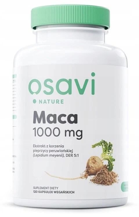 Diet supplement MACA Extract - 1000 mg 120 vegan capsules Dietary supplement in the form of a hard capsule containing an extract of Peruvian peppercorn root (maca), which grows wild in the Andes hills. Maca root helps maintain sexual activity and libido. Maca root supports sexual function in women and men. Maca root helps maintain optimal vitality and physical and mental well-being. What makes capsules stand out? Maca 1000 mg? Ripe extract maca root . Maca growing wild in Peru , where it is an endemic species growing in the Andes. Extract with a strength equivalent to 5000 mg of maca root. GMO-free, gluten-free, lactose-free, soy-free. Suitable for vegetarians and vegans. Packaging made of BioPET (30% of the material comes from sugar cane). INGREDIENTS: Peruvian pepper root extract (Lepidium meyenii), shell (hydroxypropyl methylcellulose), inulin. RECOMMENDED DAILY INGESTION AND HOW TO USE: Swallow the capsule with some water. We suggest taking 2 capsules after a meal. CONTENTS IN THE DAILY SERVING - 1 CAPSULE / 2 CAPSULES: Peruvian peppercorn root extract (Lepidium meyenii), DER 5:1 - 500 mg / 1000 mg WARNINGS AND STORAGE: Do not exceed the recommended daily dose. Do not use in children, pregnant or lactating women. A dietary supplement cannot be used as a substitute for a varied diet. To maintain proper health, you should eat a varied diet and lead a healthy lifestyle. Store in a dark and dry place at room temperature, out of the reach of small children. PRODUCER: Osavi