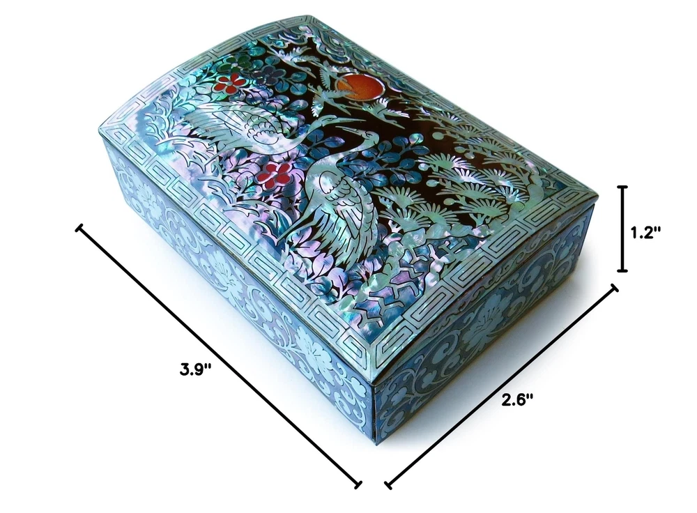 MADDesign Mother of Pearl Jewelry Decorative Trinket Box Handmade Cranes Design Black Purple - Buy Now with Fast Shipping! MADDesign Mother of Pearl Jewelry Decorative Trinket Box Handmade Cranes Design Black Purple Product Details Color: Jade Green, Blue, Red, Black, Purple Brand: MADDesign Mother of Pearl Material: Engineered Wood Style: Asian Special Feature: removable lid, luminious, glossy finish, sea shell inside Recommended Uses For Product: Unique gifts for women, Keepsakes handmade, Bracelet anklet necklace trinket storage, Bird collectibles, Bedroom nightstand dresser decoration, Shelf table decor, Home decor accent See more Product Dimensions: 2.6"D x 3.9"W x 1.2"H Target Audience: Women, Daughter, Wife, Mom, Sister Shape: Rectangular Finish Type: Lacquered Color: Jade Green, Blue, Red, Black, Purple Brand: MADDesign Mother of Pearl Material: Engineered Wood Style: Asian Special Feature: removable lid, luminious, glossy finish, sea shell inside Recommended Uses For Product: Unique gifts for women, Keepsakes handmade, Bracelet anklet necklace trinket storage, Bird collectibles, Bedroom nightstand dresser decoration, Shelf table decor, Home decor accent Product Dimensions: 2.6"D x 3.9"W x 1.2"H Target Audience: Women, Daughter, Wife, Mom, Sister Shape: Rectangular Finish Type: Lacquered Inner Material: mother of pearl Item Weight: 3.5 Ounces Number of Compartments: 1 Jewelry Storage Type: Jewelry Box Number of Items: 1 Manufacturer: Antique craft Occasion: Mother's Day, Christmas, Housewarming, Birthday, Valentine's Day Mounting Type: Table Top Closure Type: top Item Weight: 3.5 ounces Country of Origin: Korea, Republic of Item model number: RA-067 Is Discontinued By Manufacturer: No Specific instructions for use: home decor accent Finish types: Lacquered Number of pieces: 1 Batteries required: No Import: Imported Key Features ✅ Handmade: Korean artisan mother of pearl and lacquer-ware traditional craftsmanship; A functional piece of art ✅ Keepsake: Single storage to store a special jewel trinket gemstone antique or small memento; keeps what matters ✅ Design: Cranes pattern a symbol of longevity; home decor decoration accent to brighten a bedroom or living area table, dresser, nightstand or shelf ✅ Luminosity: Seashell and glossy lacquer finish shine, glitter and reflect colors in light; a unique look at every angle of sight ✅ Gifting: A gift to remember; for mom, sister, daughter, wife, girlfriend, aunt, grandma, bridesmaids or yourself; a present on Christmas, mothers day, valentines, birthday, anniversary Product Description