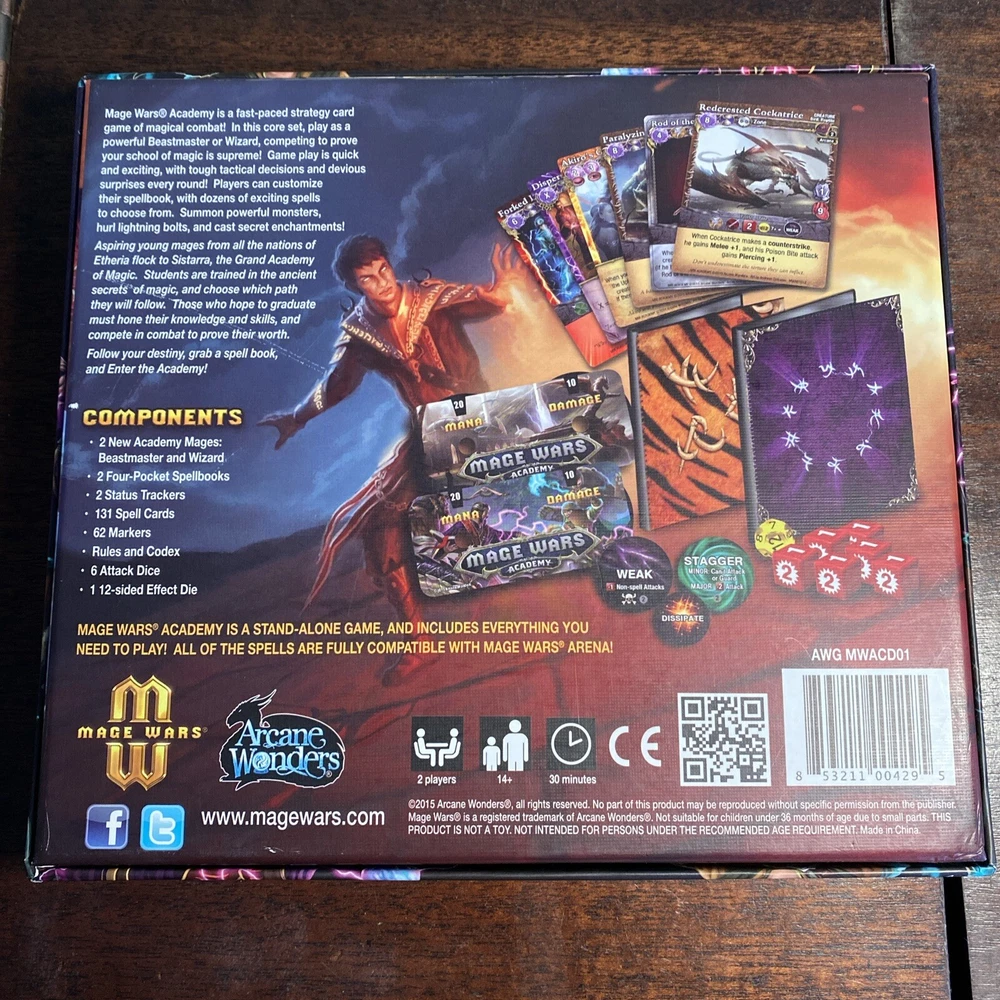 Award:seal of excellence the dice towerType:Complete GameMPN:AWG MWACD01Min. Number of Players:2 playersCountry/Region of Manufacture:ChinaCustom Bundle:NoGame Type:Board GameFeatures:CORE SETYear:2015gtin13:853211004295Character Family:WizardsTitle:Mage Wars ArenaGame:Mage Wars AcademyAge Level:12-16 Years, 17 Years & UpGender:AnyGame Title:Mage WarsRecommended Age Range:14+Theme:FantasyVintage (Yes/No):NoModified Item:NoBrand:Arcane WondersUPC:853211004295