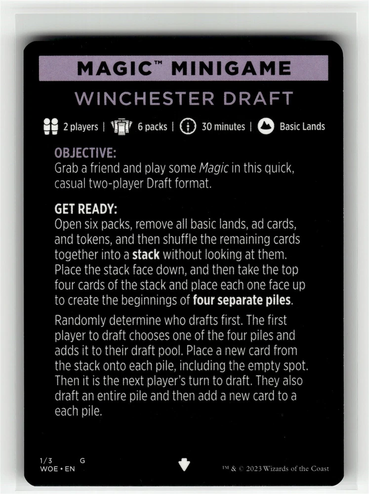 Note: All Listings are for ONE card. The number in the title is the card number. Price: $1.04 Condition: This card was sleeved directly from opening the pack or box and is in mint condition. Mint condition does not apply to centering or refer to grading eventuallities. (Near mint or better) Game: Magic: The Gathering Card Name: Magic Minigame: Winchester Draft Finish: BASE Set: Wilds of Eldraine Set Code: WOE Card Number: 1 Rarity: Special To make it simple, all cards listings are of the same condition. Different conditions are listing under a seperate listing. (See below link for more listings of more conditions if interested): More listings of this card in another condition, different set or different finish/parallel: --- Magic Minigame: Winchester Draft --- More listings from this set: --- Wilds of Eldraine --- All listings from this game: --- Magic: The Gathering --- We highly recommend the upgraded shipping option of "Ground Advantage" if you would like the best protection for your shipping option. Please take serious consideration into benefits of the "Ground Advantage" shipping option. +++ "Ground Advantage" has added weight minimum limitations and dimensions allow us to further protect your cards. +++ "Ground Advantage" bubble mailer adds yet another layer of added security. +++ "Ground Advantage" has better tracking. +++ "Ground Advantage" has more realistic time for delivery estimates and stays within that expected time frame for delivery. - - - A downside is that it is more expensive Our experience with "eBay Standard Envelope for Trading Cards, Stamps, Postcards & Coins up to $20" for your information. - - - "eBay Standard Envelope for Trading Cards, Stamps, Postcards & Coins up to $20" can only provide as much insulation and protection as we are afforded within very limited requirements. - - - "eBay Standard Envelope for Trading Cards, Stamps, Postcards & Coins up to $20" time estimates are best guesses at best (from eBay, not us). - - - "eBay Standard Envelope for Trading Cards, Stamps, Postcards & Coins up to $20" tracking may or may not reflect correctly as it depends on scans in machines and envelope orientation for this machine (USPS, not us). - - - We cannot make any more adjustments for "eBay Standard Envelope for Trading Cards, Stamps, Postcards & Coins up to $20" that will make things more secure, timely, or traceable. +++ The upside is it is more cost effective. ** Note on TCG Pictures: Scans are representations of cards. We scan one card per listing which may or may not be the card that remains or is sent. We have no problem scanning all available cards for you to choose from if you would like to see all available cards for that listing ahead of purchase. Scans are all done with penny sleeves on. If you see scratching and it is labeled as Near Mint, it is from the sleeve. No Near Mint cards will have scratching unless it was missed completely. If it was missed, our team will more than likely catch it on the shipping and notify you before sending. In the case that it is still missed, please notify us for a full return and refund. Scans are done by Commons and Uncommons, by hand. Do not use this as a grading assumption as we are not graders. If you receive your card and don't feel that we have listed it as the condition it was advertised in, feel free to return the card for a full refund no matter the reason. If this is a more expensive card and you would like better, closer, angled, or slightly different scan or picture... feel free to send me a message and we will be happy to pluck all of the variations and send pictures of each. If you receive your card and don't feel that we have listed it as the condition it was advertised in, feel free to return the card for a full refund no matter the reason. We may have labeled it incorrectly. We may have sent the wrong version accidentally. We view the card in a different condition standard than you. ** Note on how to read the title for Trading Card Games (Sports and Novelty Card May be Different). Magic the Gathering = CardName (CardNumber) SetName SetCode (Base/Foil/Special) Condition (ShortGameNameforInventory) eBay Card Condition Guidelines: Please refer to the below link for guidance on how card condition labeling is done. Obviously, this is subjective in nature and these conditions are subjective to begin with. If you are looking for specific conditions for grading purposes, we do not promise any specific grades for cards with any specific conditions. Cards that we have labeled as "NM+" have gone directly into sleeves after opening boxes / packs and were opened by Commons and Uncommons LLC. https://pages.ebay.com/cardconditions/ Shipping Details: All eBay Standard Envelope for Trading Cards can be replaced with other USPS shipping options. This replaces a normal white envelope with a 7 x 9 x 1 bubble mailer. All eBay Standard Envelope for Trading Cards and USPS Ground Advantage can be replaced with expedited shipping. Single Cards Under $20: · eBay Standard Envelope for Trading Cards, Stamps, Postcards & Coins up to $20 (3 to 6 business days). · Cards are sleeved, put into semi-rigid card loaders, and taped to promote moisture resistance, wrapped in packing slip and put into a normal envelope. Multiple cards may go into one loader depending on card type, card thickness and weight. · If special arrangements need to be made so there is no combined shipping, please contact us ahead of the purchase. · Card Saver 1 can be replaced with Top Loaders if desired. There will be an up-charge depending on the card amount purchased. Singly priced cards under $20 in which a combined order is less than $50. · eBay Standard Envelope for Trading Cards, Stamps, Postcards & Coins up to $20 (3 to 6 business days). · We will always attempt to fit larger orders in smaller envelope counts to reduce my shipping costs. · If special arrangements need to be made so there is no combined shipping, please let me know. · Cards are sleeved, 