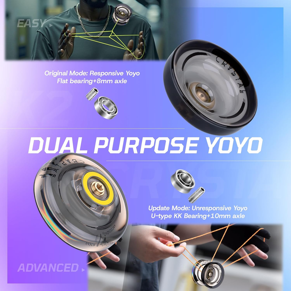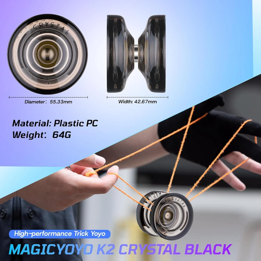 Store New Arrivals Add to Favorite View Feedback Contact MAGICYOYO K2 Crystal Black Yoyo Professional, Responsive Yoyo for Kids Beginners with Extra Unresponsive Yo Yo Bearing, Pro Plastic Trick Yo Yo for Adults+12 Stings+Bearing Removal Tool+Storage Bag Description Manufacturer Minimum Age (MONTHS) 168.0 Style Black Product Dimensions 2.17"L x 1.67"W Item Weight 2.36 ounces Manufacturer recommended age 14 years and up Skill Level All Manufacturer Maximum Age 840.0 Manufacturer MAGICYOYO π PREMIUM YOYO PROFESSIONAL - Plastic yoyo K2 made of high quality PC material.Durable and sturdy, not easy to be damaged. Adopt crystal black color, when you receive the yoyo K2 crystal, it more beautiful than pictures, you will feel surprised. π RESPONSIVE YOYO FOR KIDS BEGINNERS - When you receive the yoyo K2 package, yoyo K2 is a responsive yoyo. Great beginner yoyo for kids to practise basic string tricks 1A 3A 5A. Responsive yoyo will return your hand easily when you just a gentle tug on the string. π UNRESPONSIVE YOYO PROFESSIONAL - Responsive yoyo K2 come with extra unresponsive concave bearing. You can change the flat yoyo bearing to KK bearing (attached), then you will get a new unresponsive yoyo, no need to buy another yo-yo. Only need buy one yoyo that can meet your different need, more cost-effective. π IDEAL CHRISTMAS GIFT CHOICE - Yoyo ball is a cool and interesting toy for kids or adults. They can enjoy this yoyo in their spare time. Playing yoyo will exercise your hands and finger reaction ability. Yoyo is a perfect gift for your kids that can keep kids engaged in hands-on fun and away from the screens. π VALUE YO YO PACKAGE - Included 1 x MAGICYOYO K2 Crystal Black, extra 12 x Yoyo strings (random color), 1 x Yo-yo storage bag, 1 x professional bearing removal tool, 1 x KK bearing (Unresponsive Bearing), 1 x M4*10mm axle (use for unresponsive), 1 x Glove. Product description MAGICYOYO K2 CRYSTAL YOYO - DUAL FUNCTION YOYO PROFESSIONAL(BLACK) PLASTIC TRICK YOYO K2 - GREAT BEGINNER YOYO FOR KIDS (Crystal Black) Yoyo K2 is one of the MAGICYOYO's top recommended entry-level plastic yoyo made from durable PC, keeps the good feeling, light weight to help hold stability. MAGICYOYO K2 is a pretty responsive yoyo for kids beginner. Style string trick (1A, 3A, 5A). It plays fast with a super solid stability and surprise spin power. Easy to play basic yoyo tricks. Responsive Yoyo K2 is a dual function yoyo, come with replacement unresponsive yoyo bearing. It can be swith to unresponsive yo yo. Meet your need from a beginner to be an advanced yoyo player. NOTE: Yoyo K2 after changed to unresponsive yoyo mode, it canβt return back when you tug the string gently, you have to do a trick called a "Bind" to return your yoyo. You can learn this yoyo trick "how to return yoyo" on YouTube. The video showcases the product in use. The video guides you through product setup. The video compares multiple products. The video shows the product being unpacked. k2 Crystal Black Merchant Video Yoyo K2 Crystal Black Plastic Yoyo MAGICYOYO K2 - Dual Function Yoyo: 1. Responsive Yoyo : Trick Yoyo K2 adopting slim flat bearing. Good for kids beginner learners. Silicone response system for superior play. 2. Unresponsive Yoyo : Comes with KK bearing, you can replace the responsive yoyo bearing to a professional unresponsive yoyo bearing, just simply use our extra professional removal bearing tool! Please Note : When screwing back, the bearing & Axle must be straight and correct, align the screw thread and screw it in place with appropriate force. BEST CHRISTAMS GIFT FOR KIDS - HAVE FUN WITH YOUR FAMILIES Playing yoyo not only exercise hand-eye coordination, also enhance the parent-child relationship. A good way to keep kids away from the screens. MAGICYOYO K2 Crystal yoyo is not only fun to use, but it also comes with everything you need to get started. Responsive Yoyo & Unresponsive Yoyo Mode HOW TO MAKE YOUR YOYO RETURN? 1. RESPONSIVE YOYO MODE: Yoyo responsive can be return back easily when you tug the yoyo string gently. Beginner yoyo to play basic yoyo tricks. 2. UNRESPONSIVE YOYO MODE: When the yoyo K2 after changed to unresponsive yoyo, it will not return back to your hand when you tug the yoyo string. You need play trick "Bind" to return it back to your hand. HOW TO CHANGE THE YOYO BEARING? 1. Unscrew the yo yo. 2. Take out the original bearing and the axle by bearing removal tool. 3. Put the new yoyo bearing into the yo yo. 4. Screw up the yo-yo, finish! HOW TO TIE THE YOYO STRING? 1. Take out the end of the yoyo string 2. Loosen the yo yo string 3. Put the end of the twisted yo-yo string in the yoyo ball 4. Twist the yo-yo string back to its original tightness MAGICYOYO K2 CRYSTAL BLACK SPECIFICATIONS Yoyo Body Material Premium PC Style String Trick (1A, 3A, 5A) Weight 64g Diameter 55.33 mm Width 42.67 mm Gap Width 4 mm Yoyo Bearing Regular Flat Bearing (for responsive yoyo mode) Extra Yoyo Bearing Concave Bearing (for unresponsive yoyo mode) Axle Size M4*8 mm Extra Axle Size M4*10 MM String Material 100% Polyester Yoyo String Length 110cm Body Shape Butterfly For Age 8 years up ABOUT US We offer the best prices around on high quality products. Our E-store includes media such as books, movies, music and games while offering electronics, toys, sporting apparel, clothing, tools, general home, garden items and more. SHIPPING We are always working hard to ensure your package arrives as soon as possible. Please understand that some factors like weather, high postal traffic, and the performance of shipping companies are outside of our control. We offer free shipping to the lower 48 states and ship within 2 business days of payment, usually sooner. We do not accept P.O. Boxes. Please provide a physical address. RETURNS We offer a 30-Day Return Policy on items which you are not completely satisfied with. You have the option for a full-refund or an exchange of the item. No returns are available on items shipped outs