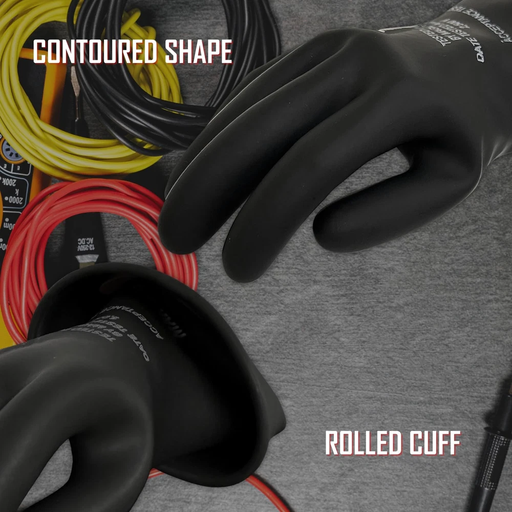 ELECTRICAL INSULATING LINEMAN GLOVES: Insulating gloves protect against electrical hazards; Ideal for lineman, electricians, field service work and more. CLASS 00: Designed for low-voltage applications; Electrical safety gloves protect up to 500 Volts AC/750 Volts DC. NON-CONDUCTIVE RUBBER MATERIAL: Gloves are made from dielectric natural rubber latex; Superior dielectric properties and improved flexibility. PROTECTIVE LENGTH: Gloves measure 11” long for extended coverage beyond the wrist; Features a straight cuff with a rolled edge for easy wear and removal MEETS INDUSTRY STANDARDS: Complies with ASTM D120-09 standards, OSHA 29C FR 1910.269 standards and NFPA 70E standards.