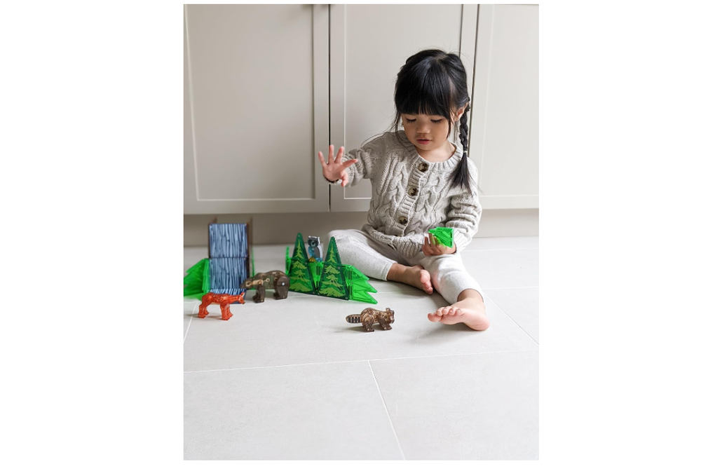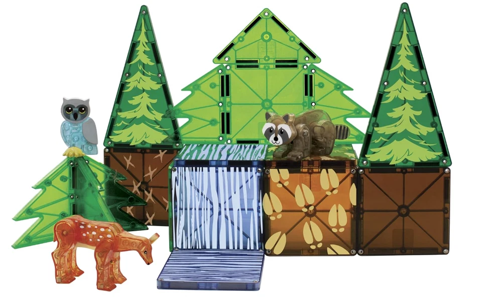 Go for a walk on the wild side! The new MAGNA-TILES Forest Animals 25 piece set is designed for hours of screen-free, frustration-free fun and STEAM learning opportunities. Explore the wonderful wilderness with four forest animal friends; Raccoon, Owl, Bear and Dear as they play together amongst the towering trees and bubbling streams. INCLUDES: 25 pieces: 4 forest animal figurines Raccoon, Owl, Bear, and Dear, 11 classic small squares, 6 tree/leaf pieces, 2 classic right triangles, and 2 classic isosceles triangles. INTRODUCE STEAM TO YOUNG LEARNERS: Sparks a curiosity for STEAM topics. MATERIAL: Made from only the good stuff, none of the icky stuff (we only use food-grade ABS plastic that’s free from BPAs, phthalates, and latex). GROW IMAGINATIONS: Features tree, stream, and footprint tiles with realistic details encouraging imaginative play, storytelling and creativity. DIMENSIONS: Largest Piece: 5-1/2" x 3" Smallest Piece: 2-1/2" x 3" Box: 12-1/2" x 2-1/2" x 12" inches CHOKING HAZARD: Small parts. Not for children under 3 years.