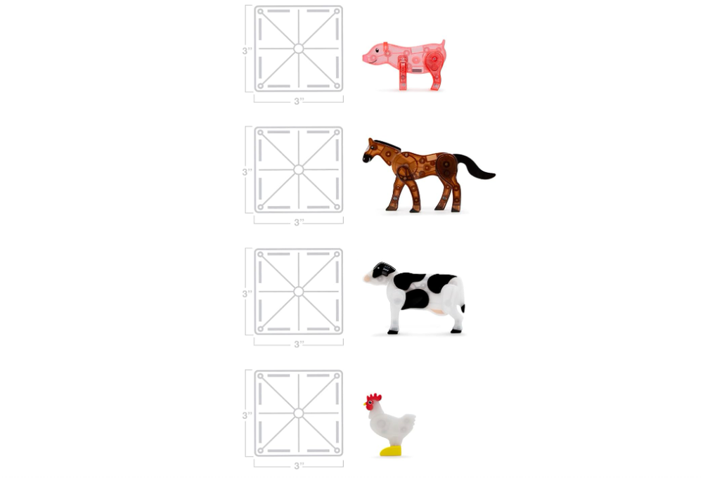 The rooster is crowing! It’s time to join us down on the farm as we bring imaginative play to life with the new Farm Animals set, part of the Magna-Tiles Animal Collection. Little hands will enjoy caring for animals through hands-on, screen-free playtime. Better roll up your sleeves because your kids will want to play “pasture” bedtime with the four, unique barnyard buddies, realistic barn and hay tiles, and the first-ever magnetic fence pieces. What’s Included: 4 Farm Figurines (Chicken, Horse, Cow and Pig), 4 Small Squares, 5 Rectangles (2 Large, 3 Small), 2 Right Triangles, 10 Fences LET IMAGINATIONS RUN WILD: Encourages imaginative play, storytelling and creativity. MATERIAL: Made from only the good stuff, none of the icky stuff (we only use food-grade ABS plastic that’s free from BPAs, phthalates, and latex). DIMENSIONS: 12-1/2 x 2-1/2 x 12 inches
