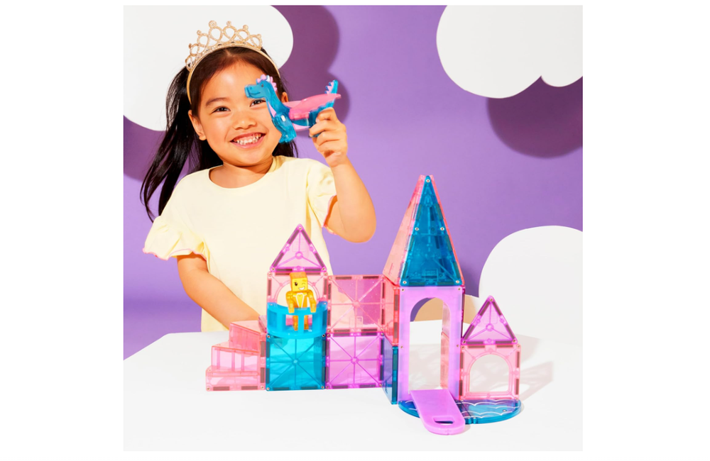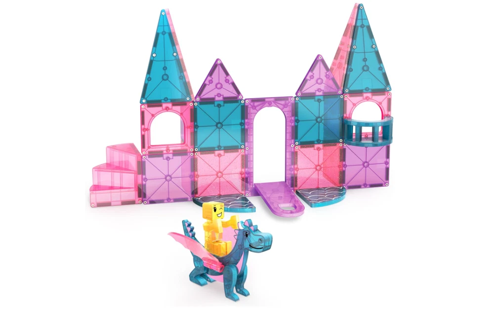 Bring fairy tale dreams to life with the MAGNA-TILES® Castle - 25 pieces! Featuring a working drawbridge, exclusive dragon and royalty figures, spiral staircase, balcony, and glitter tiles, this set inspires magical storytelling and hands-on construction fun. With endless possibilities for imaginative play, children can create their own enchanting kingdoms while developing essential skills. WHAT’S INCLUDED: This 25-piece set includes 1 drawbridge, 1 dragon figure, 1 royalty figure, 1 spiral staircase, 1 balcony, 2 windows, 2 equilateral triangles, 2 quarter circles, 4 isosceles triangles (2 glitter, 2 standard), and 10 squares (4 glitter, 6 standard). UNIQUE FEATURES: Includes the first-ever working drawbridge, spiral staircase, and balcony, along with exclusive dragon and royalty figures, redesigned windows, and glitter tiles for added enchantment. SUPPORTS DEVELOPMENT: Encourages exploration of cause and effect, logic, hand-eye coordination, and fine motor skills, all while fostering creativity through imaginative play. COMPATIBLE WITH ALL MAGNA-TILES®: Fully integrates with all MAGNA-TILES® sets, including sparkling Stardust and Classic sets, for endless expansion and creativity. SAFE AND DURABLE: Made from food-grade, non-toxic MABS plastic with a secure lattice design and fastening rivets to keep magnets safe and ensure long-lasting play.
