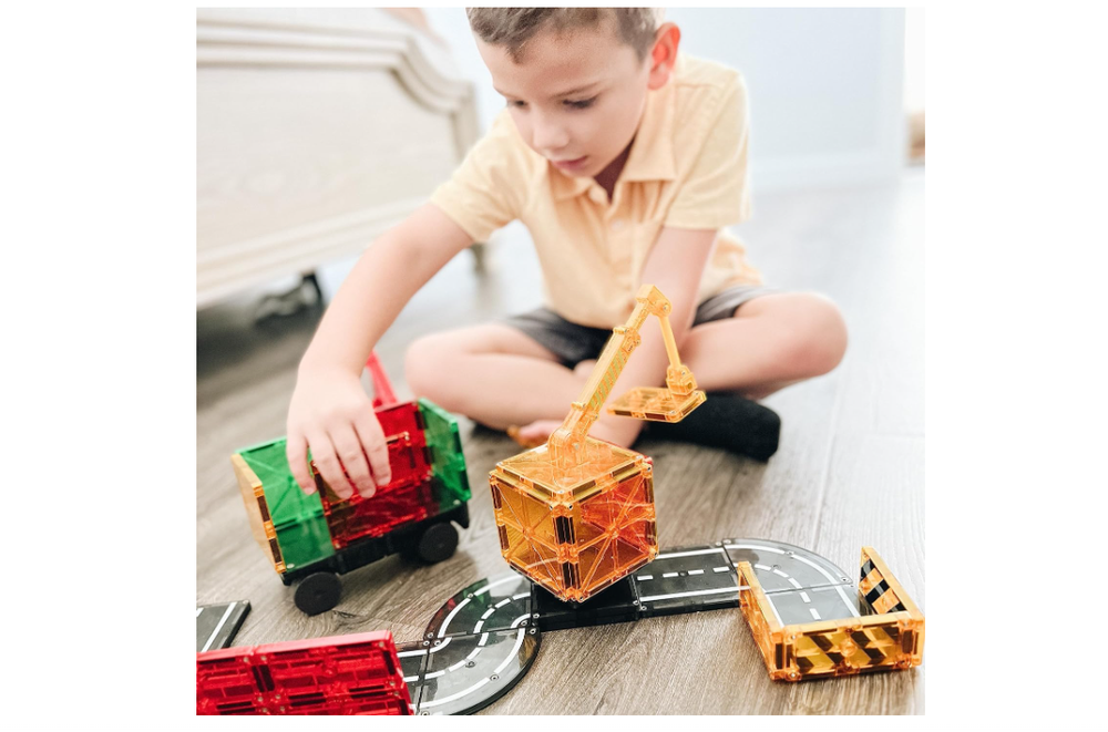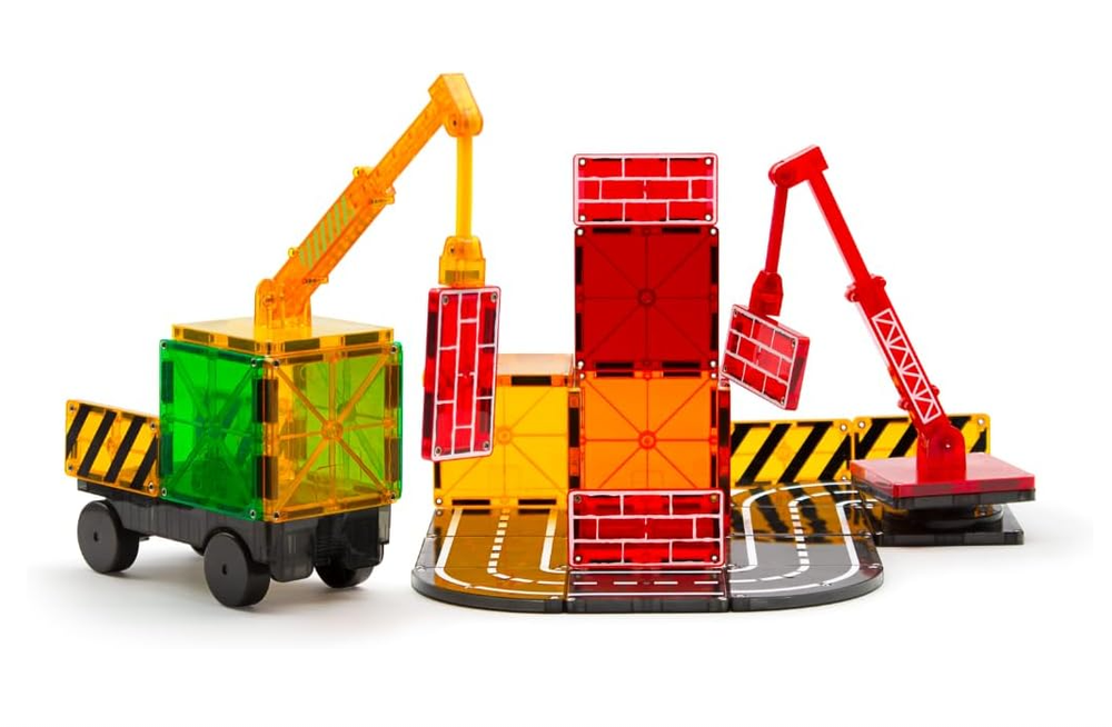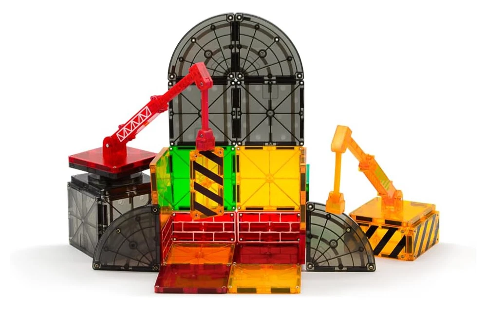 Watch your child’s imagination and STEAM learning soar to new heights with the fan-favorite Builder 32-Piece set, only in the MAGNA-TILES system of play. Extend and swivel the first-ever magnetic crane to move bricks around your MAGNA-TILES creation. Click together roads for your magnetic construction vehicles or favorite toy cars. Whether at home or in the classroom, if you can dream it, you can build it with Builder! INCLUDES: 32 pieces: 10 road squares, 8 small rectangles, 6 classic small squares, 4 road quarter circles, 2 extendable cranes, 1 car chassis, and 1 spinner. INTRODUCE STEAM TO YOUNG LEARNERS: Sparks a curiosity for STEAM topics. MATERIAL: Made from only the good stuff, none of the icky stuff (we only use food-grade ABS plastic that’s free from BPAs, phthalates, and latex). GROW IMAGINATIONS: Features extendable magnetic cranes and popular Road pieces that ignite children’s imaginations. DIMENSIONS: Largest Piece: 5-3/4" x 2-3/4" Smallest Piece: 1-1/2" x 3" Box: 12-1/2" x 2-1/2" x 12" inches CHOKING HAZARD: Small parts. Not for children under 3 years.
