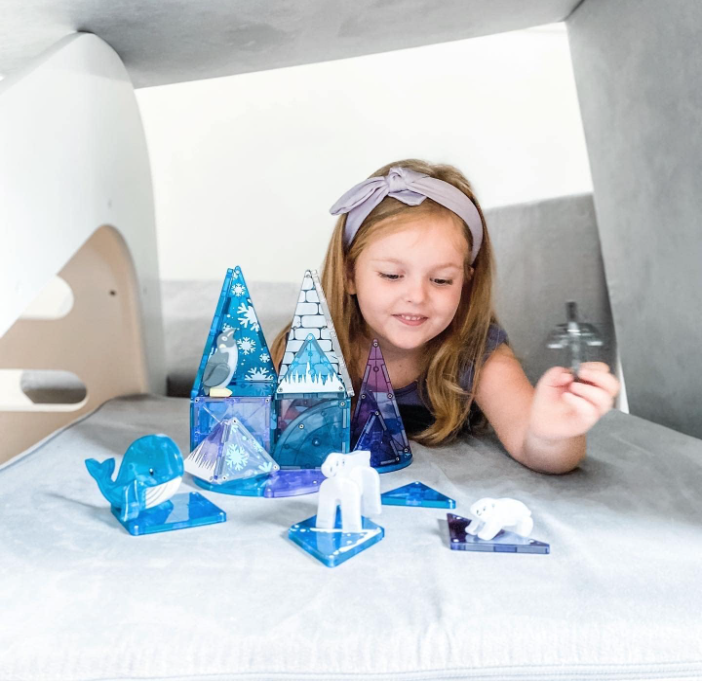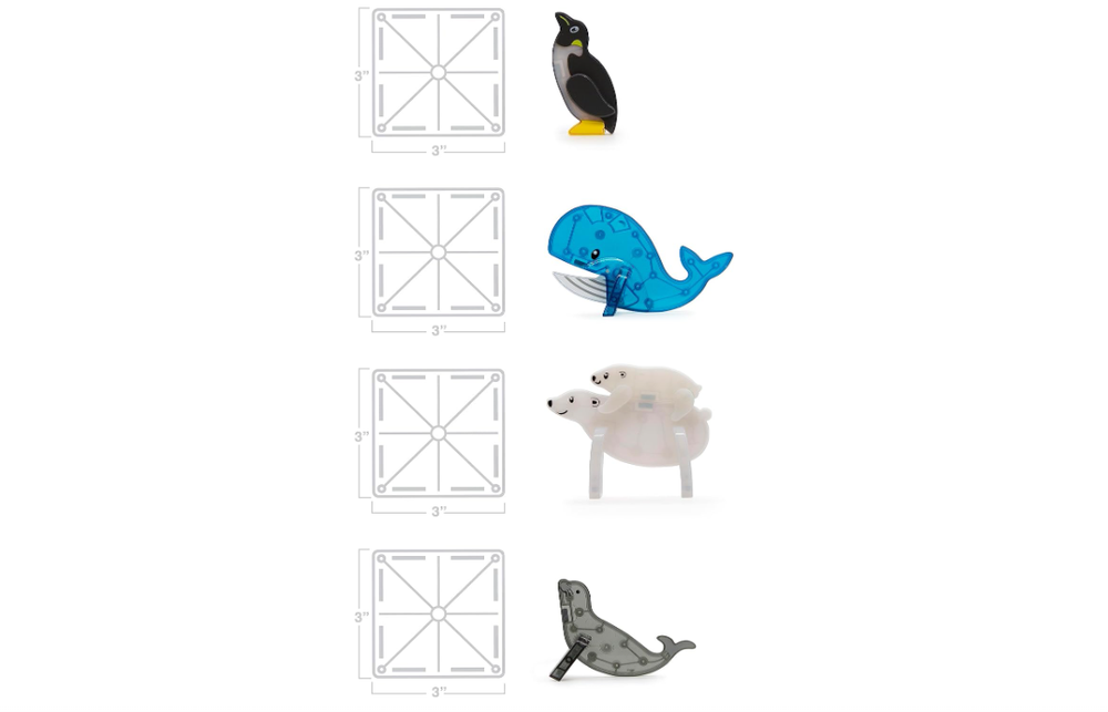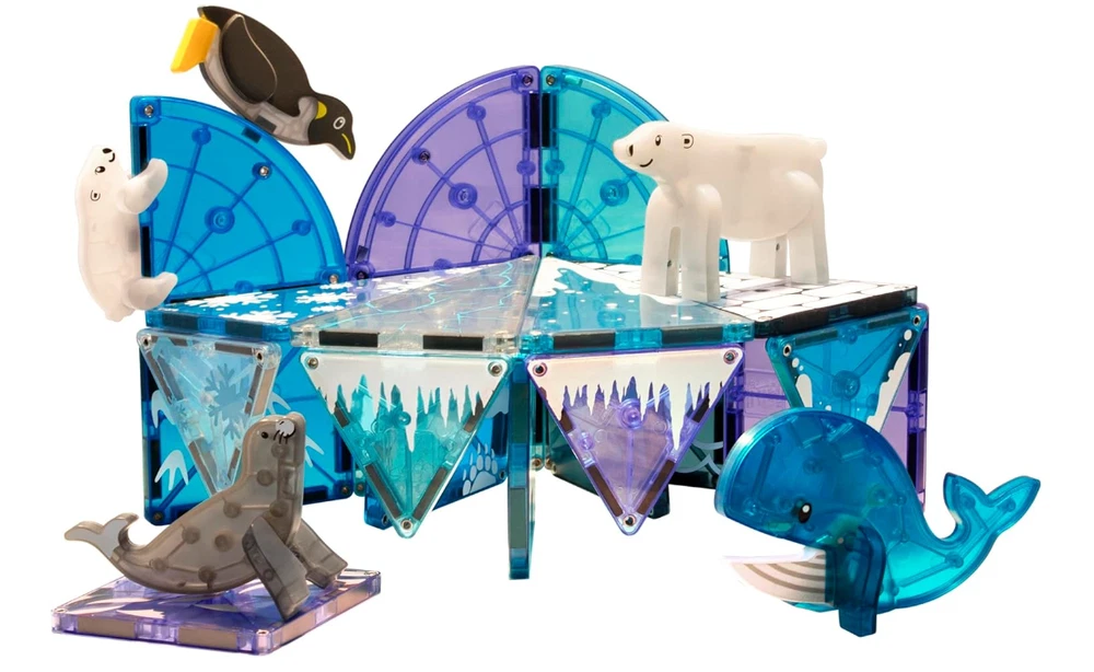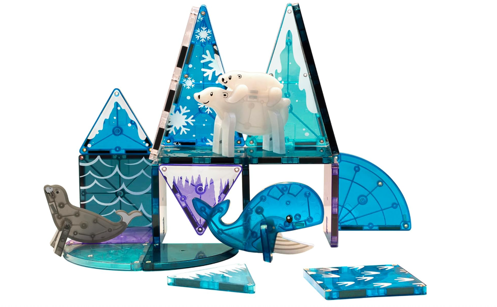 Grab your little explorers and chill out. The Arctic Animals set is a pop-polar choice for kids to play, build, and pretend with five arctic animal friends and their frozen habitat. You’re sure to have a whale-y good time as you slip, slide, and splash your way through icy mountains and glaciers. Encourages STEAM learning and screen-free fun. Young explorers can follow the footprints of penguins and polar bears to their native habitats, chill out with the seals by the shore, and go on exciting whale watches. Using the click-together shapes, kids can create their own environments filled with glaciers, mountains, and animals native to colder climates. ENCOURAGES OPEN-ENDED PLAY: Free of instructions, our magnetic building toys foster creativity, engagement, and STEM learning. Teachers and parents find Magna-Tiles an excellent educational resource for playrooms, homeschoolers, and classrooms. KID-APPROVED: From the translucent tiles to the adorable animals, each piece in this playset is designed for little hands and active imaginations. The shapes connect with an audible “click,” so kids can design environments and adapt their habitats as new ideas take shape. WORKS WITH YOUR COLLECTION: A great gift, the Magna-Tiles Arctic Animals set is compatible with others from the Magna-Tiles family. You can mix and match with current collections or use this one as a springboard to find a whole new way to play inside or outdoors. DEVELOP YOUNG MINDS: Encourages open-ended/unstructured play, storytelling, and creativity INCLDUES: Five happy arctic animals, including Penguin, Seal, Baby Polar Bear, Polar Bear and Whale.