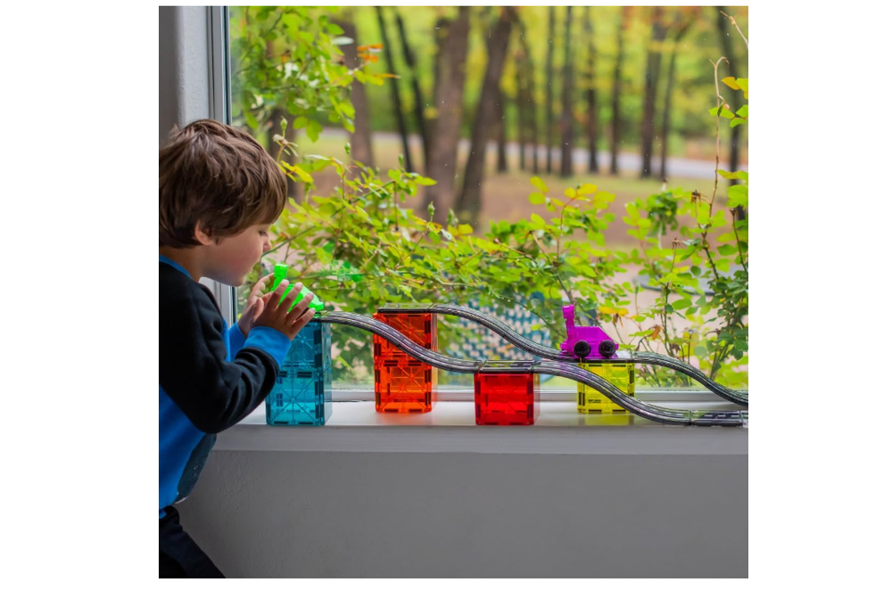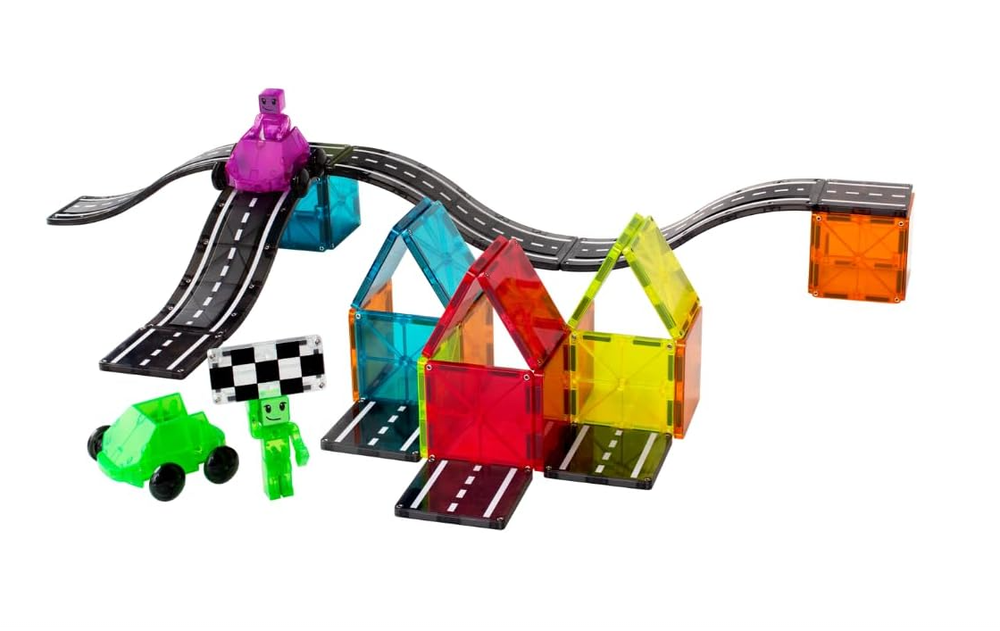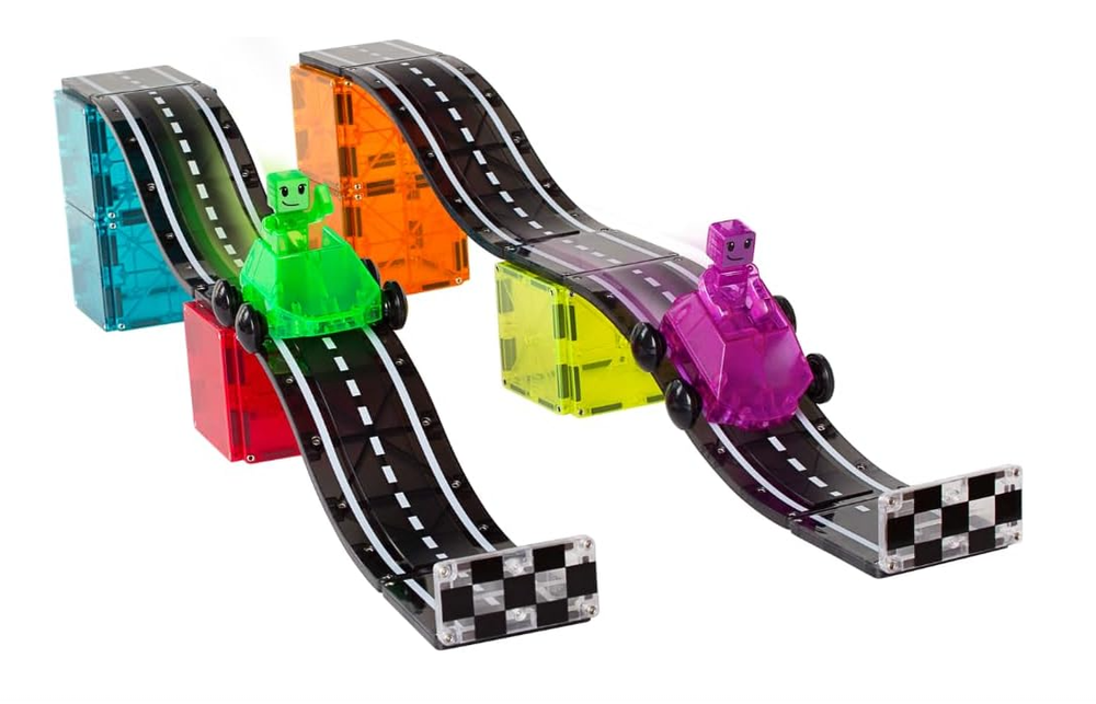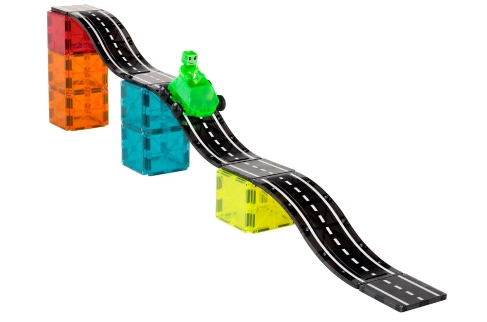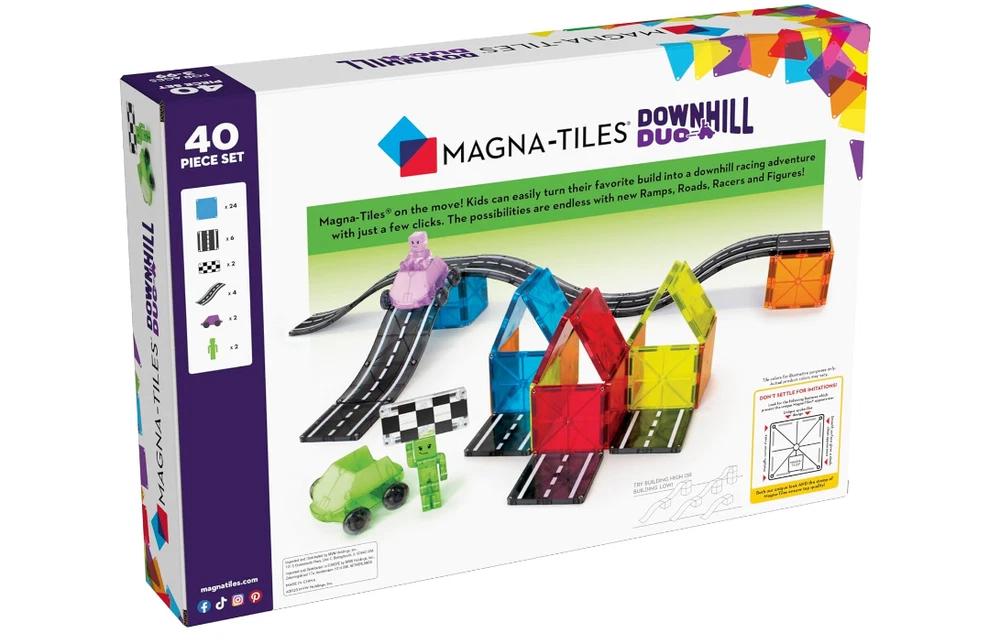 Car-loving kiddos, we have something for you! Introducing MAGNA-TILES Downhill Duo 40-Piece set, the first fully magnetic racing adventure that’s designed for little hands and big imaginations. Looking for a new way to inspire their creativity, build their motor skills, and support their STEAM learning? Buckle up and imagine the possibilities with new Ramps, Roads, Dashers and Figures! INCLUDES: 40 magnetic pieces, - 4 Ramps 9-1/4" x 2-3/4", 2 Vehicles 3-1/2" x 3-3/8" x 1-3/4" (Green and Purple), 2 Figures 1-1/4 x 1/2" x 2-3/4" (Green and Purple), 6 Road Squares 2-3/4" x 2-3/4", 2 Finish Line Rectangles 2-3/16" x 1-3/8" x 3/16" and 24 Squares 2-3/4" x 2-3/4". UNIQUE DESIGN FOR MOTION: Dashers are uniquely designed to ride along traditional Squares, Ramps, and Roads, offering a frustration-free way to introduce motion and STEAM learning. They seamlessly integrate with existing MAGNA-TILES sets. ENCOURAGES DEVELOPMENT: Playing with Dashers helps children explore cause and effect, develop hand-eye coordination, and enhance fine motor skills. It's a fun and educational tool that promotes learning through play. GREAT FOR GIFTING: This set makes an excellent gift for car-loving kids aged 3 and up. It's a delightful addition to any MAGNA-TILES collection, providing endless hours of creative and imaginative play. SUPERIOR QUALITY AND SAFETY: Made from food-grade, non-toxic MABS plastic, MAGNA-TILES pieces are BPA, phthalate, and latex-free. Designed to withstand extensive play, the secure lattice and fastening rivets ensure durability and safety for children.
