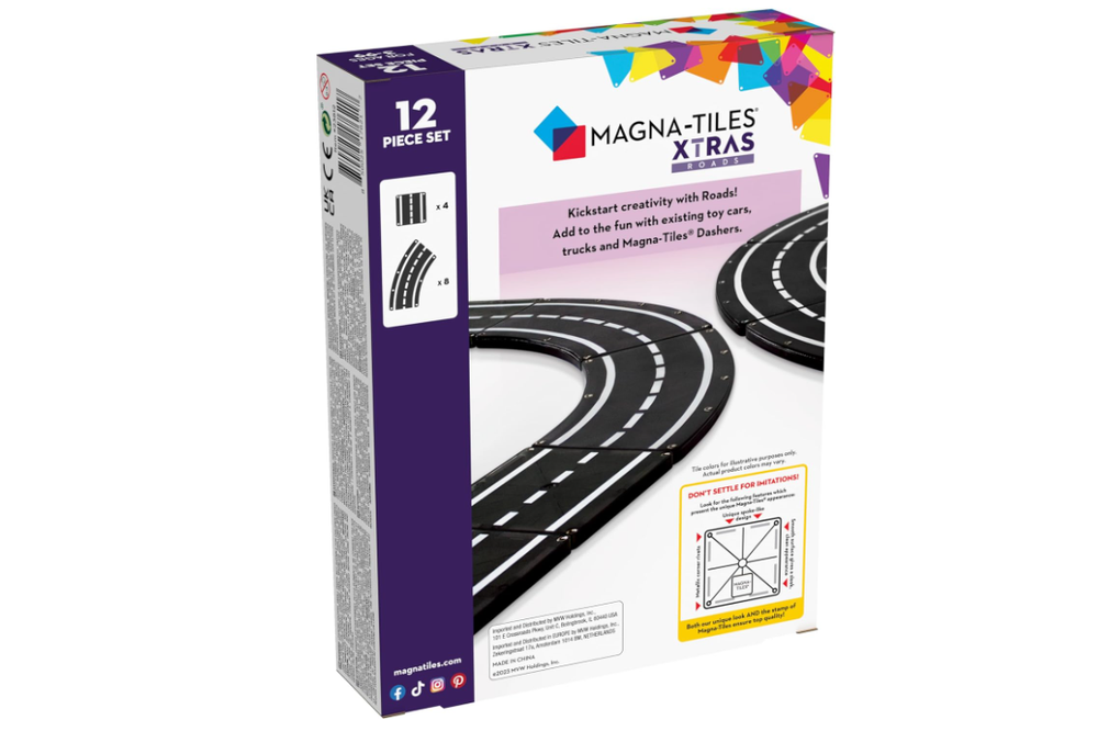 Ages 3+ / Grades PreK+ WARNING: CHOKING HAZARD – Small parts. Not for children under 3 years. Some ideas just click. More Roads equals more adventures, more imagination and more fun! Kids can connect their MAGNA-TILES worlds with these fan-favorite, multi-purpose pieces. Includes Square and Curved pieces for a variety of building options and racing fun! INCLUDES: 12 magnetic pieces - 8 Road Curves 7" x 4" (45-Degrees) and 4 Road Squares 2-3/4 x 2-3/4". UNIQUE DESIGN FOR MOTION: Includes the fan-favorite magnetic Roads pieces, the easiest way for kids to build highways, racetracks and more. They seamlessly integrate with existing MAGNA-TILES sets. ENCOURAGES DEVELOPMENT: Encourages children to learn through play, exploring cause and effect and other logic principles, while fostering the development of hand-eye coordination and fine motor skills. GREAT FOR GIFTING: This set makes an excellent gift for car-loving kids aged 3 and up. It's a delightful addition to any MAGNA-TILES collection, providing endless hours of creative and imaginative play. SUPERIOR QUALITY AND SAFETY: Made from food-grade, non-toxic MABS plastic, MAGNA-TILES pieces are BPA, phthalate, and latex-free. Designed to withstand extensive play, the secure lattice and fastening rivets ensure durability and safety for children.