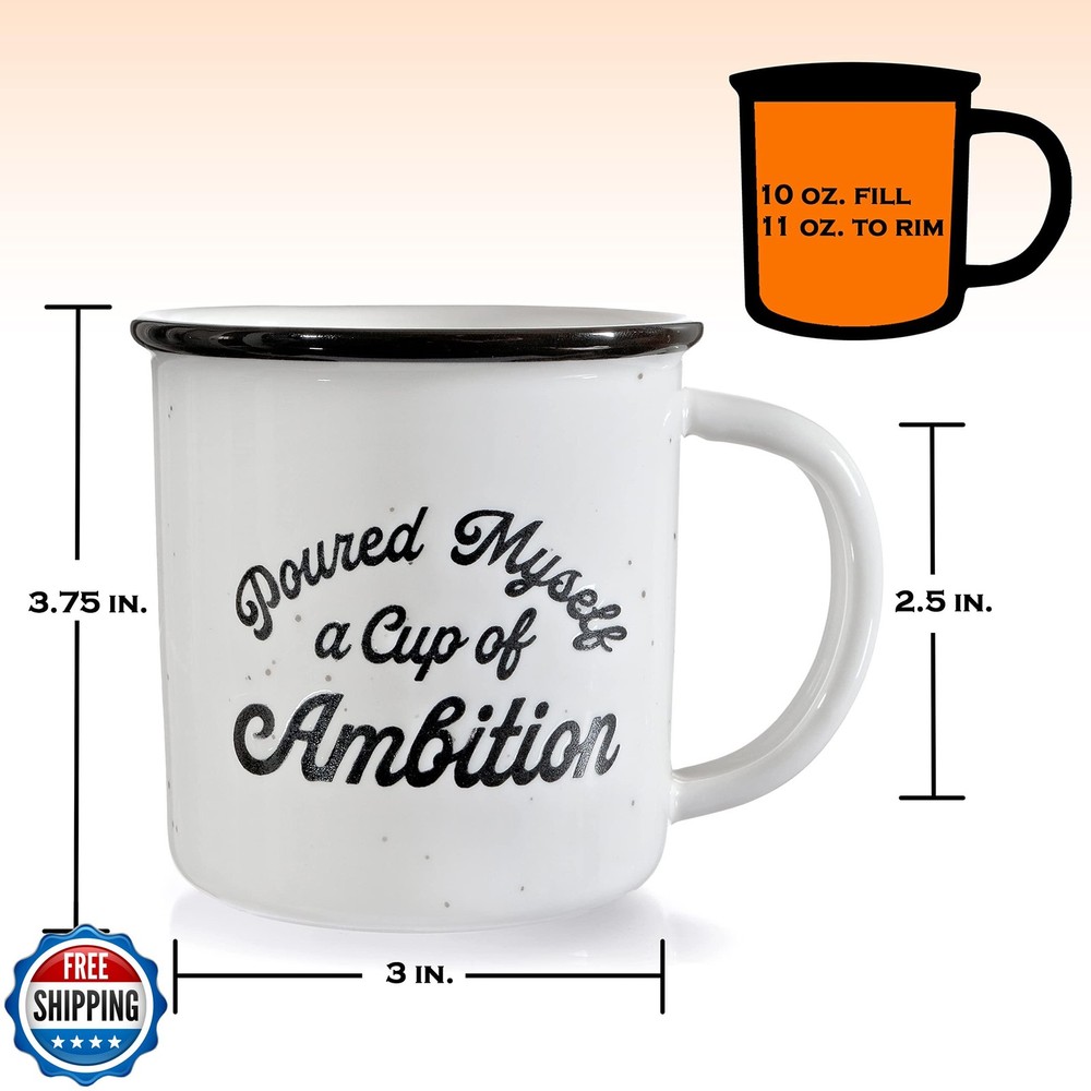 MAINEVENT Pour Myself a Cup of Ambition Mug 11 Oz, Funny Ceramic Coffee Mug Gift for Women Features Express your humor to your friends and loved ones with our Pour Myself a Cup of Ambition mug; Spend quality time with them as you sip your favorite beverage using our coffee mug cup ambition The perfect gift for any occasion, our cup ambition coffee mug makes special events and coffee sessions at home or in the office a lot more enjoyable Imprinted text does not fade on our ceramic mug; Our cup of ambition mug with funny saying will help you get through the week Our microwave-safe, dishwasher-safe ambition coffee mug is made of high-quality ceramic that does not easily break Our cup ambition mug designed in the USA and made with the highest quality and safest materials is an ideal campfire mug for hot and cold drinks Shipping Free & Fast Shipping: We offer free shipping to most of the USA with a normal delivery time of 3-7 days. However, due to the current situation, additional delivery time (up to 3 weeks) may be required for some items. Alternative Carriers: We may use alternative carriers (e.g., USPS, FedEx, UPS) to ensure your package arrives safely and on time. Due to the use of multiple carriers, we are unable to provide a tracking number automatically. Handling Time: Orders are processed and shipped within 1-2 business days of receiving cleared payment. Shipping Restrictions: Shipping to Alaska, Hawaii, Puerto Rico, Guam, and other US territories may incur shipping charges or delivery restrictions. Please contact us before ordering, or your order can be refunded/cancelled. State Restrictions: Certain items may not be shipped to California due to state regulations. Contact for Tracking Updates: If you require tracking updates or have any concerns about the delivery of your order, please feel free to contact us, and we will be happy to assist you. Return Policy 30-Day Hassle-Free Returns: If you are not completely satisfied with your purchase, you can return the item for free within 30 days of receiving it for a full refund or exchange. Easy Return Process: Contact us, and we will provide you with a prepaid return shipping label and detailed instructions. No Restocking Fee: There are no restocking fees for returns. However, the buyer is responsible for return shipping costs if the return is not due to a seller"s error. Refund Processing: Refunds will be processed within 1 business day of receiving the returned item in its original condition. Feedback Your feedback is extremely important to us. We strive to provide the best products and customer service possible. If you are satisfied with your purchase, please take a moment to leave us a positive review. If you have any concerns or issues with your order, please contact us before leaving negative feedback. We are committed to resolving any problems and ensuring your satisfaction. Contact Us If you have any questions or concerns, please feel free to reach out to our customer support team. You can contact us through the eBay messaging system. We are available Monday to Friday, 9:00 am to 5:00 pm EST, and we will do our best to respond to your inquiry within 24 hours. Thank you for supporting our small family business!