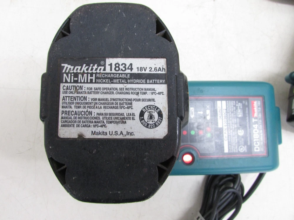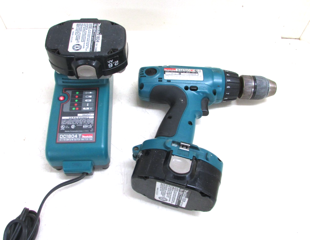 THIS IS A PREVIOUSLY USED ITEM MAKITA 6347D 18V CORDLESS DRILL WITH KEYLESS CHUCK 400 - 1300 RPM INCLUDES: (2) 18V Ni-MH 1834 BATTERIES BATTERY CHARGER, DC1804T BATTERYIES HOLD A CHARGE YOU CAN SEE THE CHARGING LIGHT ON IN THE PHOTOS CHARGING THE BATTERY COMES JUST AS PICTURED GOOD WORKING CONDITION! WE ALWAYS HAVE SEVERAL LISTINGS WITH QUALITY NAME BRAND TOOLS...CHECK THEM OUT! 46-C