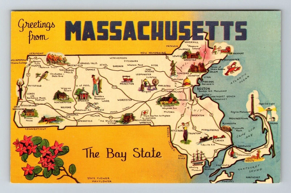 MA-Massachusetts, Scenic Map Greetings, Landmarks, Bay State, Vintage Postcard