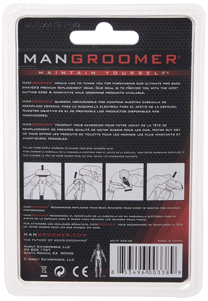 Store New Arrivals Add to Favorite View Feedback Contact MANGROOMER Ultimate Pro Back Shaver Replacement Blade Description Item model number ULTIMATE PRO Product Dimensions 1.8 x 2.3 x 0.6 inches; 0.96 ounces Manufacturer Mangroomer (Marut Enterprises, LLC) The new Ultimate Pro Replacement Blade is for use exclusively with the MANGROOMER Ultimate Pro Back Shaver Ultimate Pro cutting-edge blade design enables extremely close and smooth shave results without the potential of ingrown hairs, plus measures 1.8 inches in width for maximum coverage in fewer strokes Hypoallergenic Stainless Steel Blades designed specifically for sensitive skin and a clean smooth shave Cleans easily by using the cleaning brush provided with your Ultimate Pro Back Shaver or rinsing under running water For optimal results, it is recommended to replace your Ultimate Pro Blade every six months Product Description How To Replace Your MANGROOMER Shaver Blade 1. Lightly press upward with thumbs on Blade with the shaver facing you as indicated in the picture above. 2. Remove the shaver blade. 3. Install new shaver blade with inner power pin aligned to the center of the blade undercarriage. 4. Secure the shaver blade into place with downward pressure on the back of the head. MANGROOMER Ultimate Pro Back Shaver Replacement Blade The MANGROOMER - ULTIMATE PRO Do-It-Yourself Electric Back Hair Shaver Replacement Blade is for use exclusively with the MANGROOMER - ULTIMATE PRO Back Shaver. The new ULTIMATE PRO cutting-edge blade design enables extremely close and smooth shave results without the potential of ingrown hairs, plus measures 1.8 inches in width for maximum coverage in fewer strokes. The Hypoallergenic Stainless Steel Blades are designed specifically for sensitive skin, durability and a clean smooth shave. Cleans easily by using the cleaning brush provided with your MANGROOMER - ULTIMATE PRO Back Shaver or rinsing under running water. For optimal results, it is recommended to replace your blade every six months. Ultimate Pro Replacement Blade is for use exclusively with both the MANGROOMER - ULTIMATE PRO Back Shaver Professional cutting-edge blade design enables extremely close and smooth shave results without the potential of ingrown hairs, plus measures 1.8 inches in width for maximum coverage in fewer strokes Cleans easily by using the cleaning brush provided with your ULTIMATE PRO Back Shaver or rinsing under running water For optimal results, it is recommended to replace your blade every six months Cleans easily by using the cleaning brush provided with your ULTIMATE PRO Back Shaver or rinsing under running water For optimal results, it is recommended to replace your blade every six months Electric blade feels so smooth MANGROOMER ULTIMATE PRO Do-It-Yourself Electric Back Hair Shaver The video showcases the product in use. The video guides you through product setup. The video compares multiple products. The video shows the product being unpacked. Introducing the Mangroomer Ultimate Pro Do-It-Yourself Electric Back Hair Shaver for Back Hair Removal. This is our most advanced back hair shaver ever built with more than ten years of research and development. Manscape your back all by yourself. Maintain Yourself! Ultimate Pro Back Shaver MANGROOMER Shavers Back Shaver Ball Shaver Chest Shaver 2 Shavers in 1 Rechargeable Leg Shaver Underarm Shaver Back Shaver Ball Shaver Chest Shaver 2 Shavers in 1 Rechargeable Leg Shaver Underarm Shaver Lithium Max Body Groomer 2.0 Pro Body Groomer ABOUT US We offer the best prices around on high quality products. Our E-store includes media such as books, movies, music and games while offering electronics, toys, sporting apparel, clothing, tools, general home, garden items and more. SHIPPING We are always working hard to ensure your package arrives as soon as possible. Please understand that some factors like weather, high postal traffic, and the performance of shipping companies are outside of our control. We offer free shipping to the lower 48 states and ship within 2 business days of payment, usually sooner. We do not accept P.O. Boxes. Please provide a physical address. RETURNS We offer a 30-Day Return Policy on items which you are not completely satisfied with. You have the option for a full-refund or an exchange of the item. No returns are available on items shipped outside of the USA. PAYMENT We accept PayPal. CONTACT US This page content is yet to come Please ad us to your favorite seller and visit again later Thank You CUSTOMER SATISFACTION We try our very best to make sure every customer is completely satisfied. If there's a problem, message us! We're happy to help.