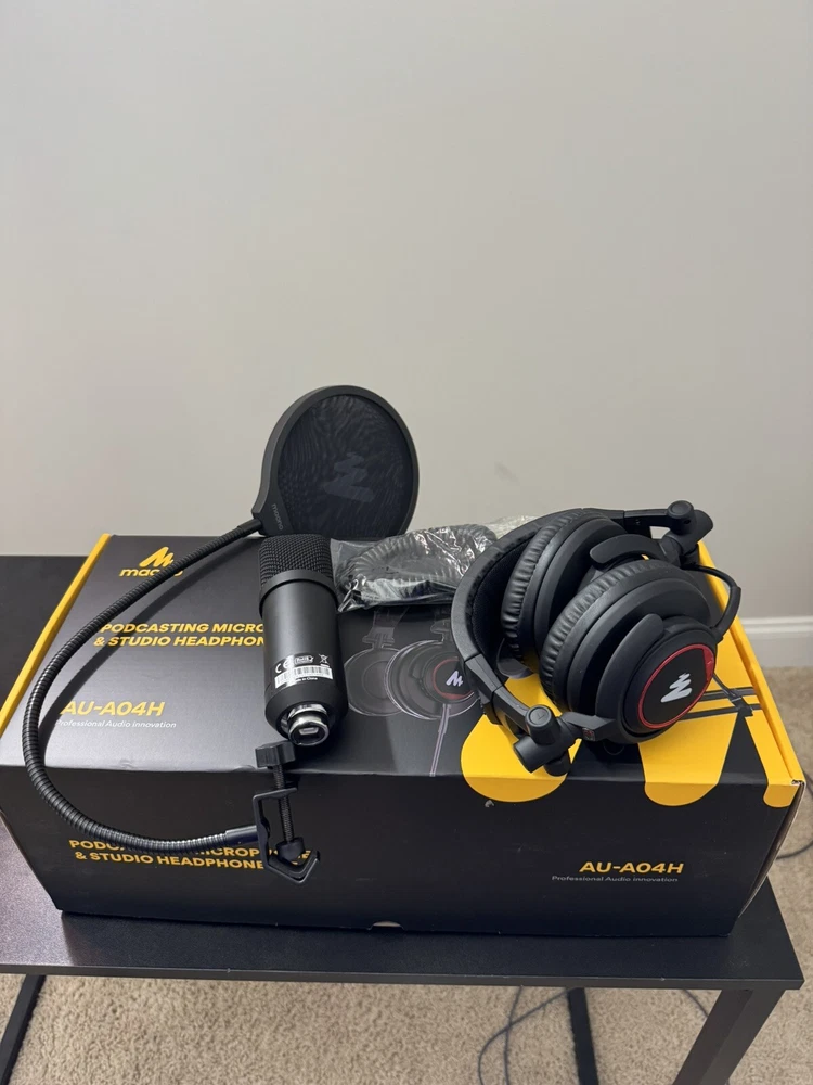 Brand new , never used open boxed!! This bundle includes the MAONO AU-A04 USB Microphone and the AU-MH601 Studio Monitor Headphones. The microphone is a condenser microphone with a cardioid polar pattern and is suitable for music and home recording. It has plug and play functionality and connects using USB or USB-C. The diaphragm size is A04. The headphones are designed for professional monitoring and have a brand name of MAONO.