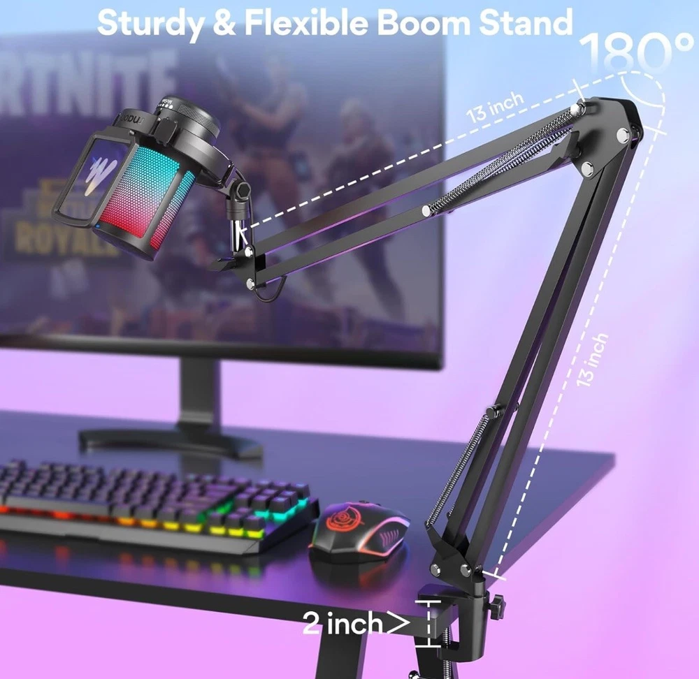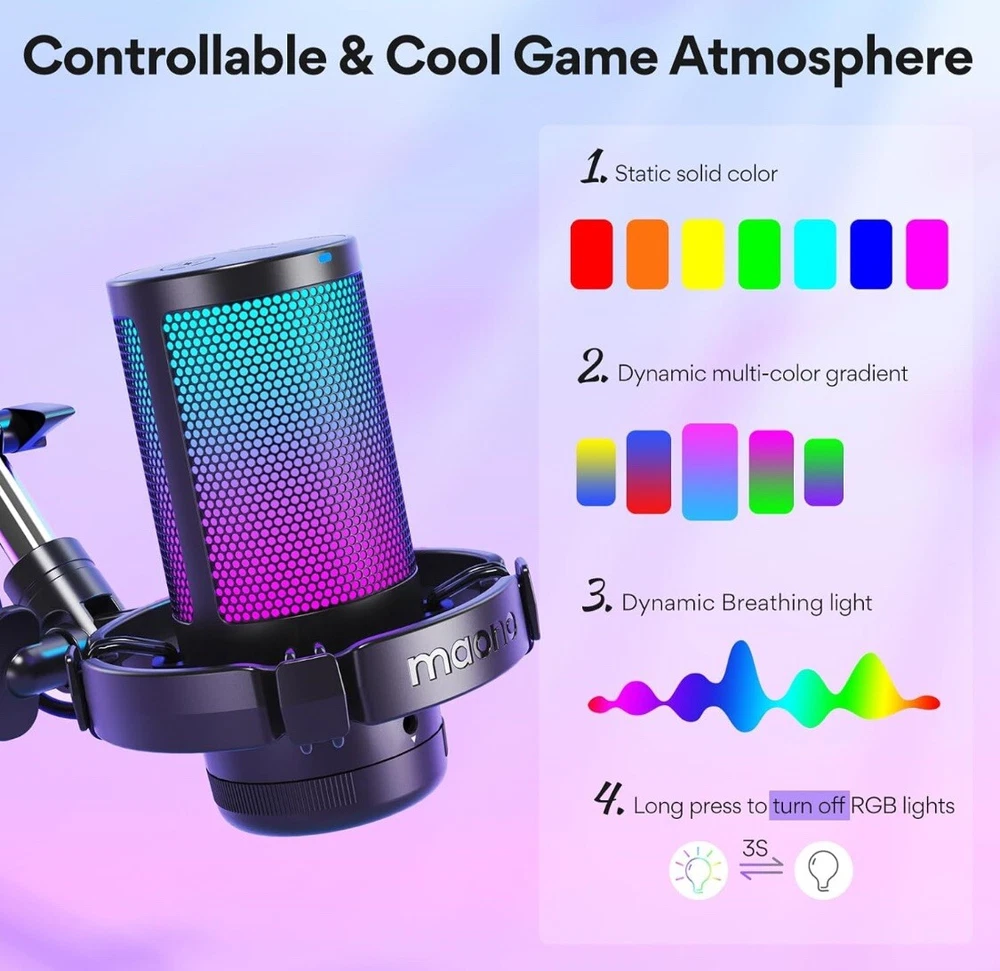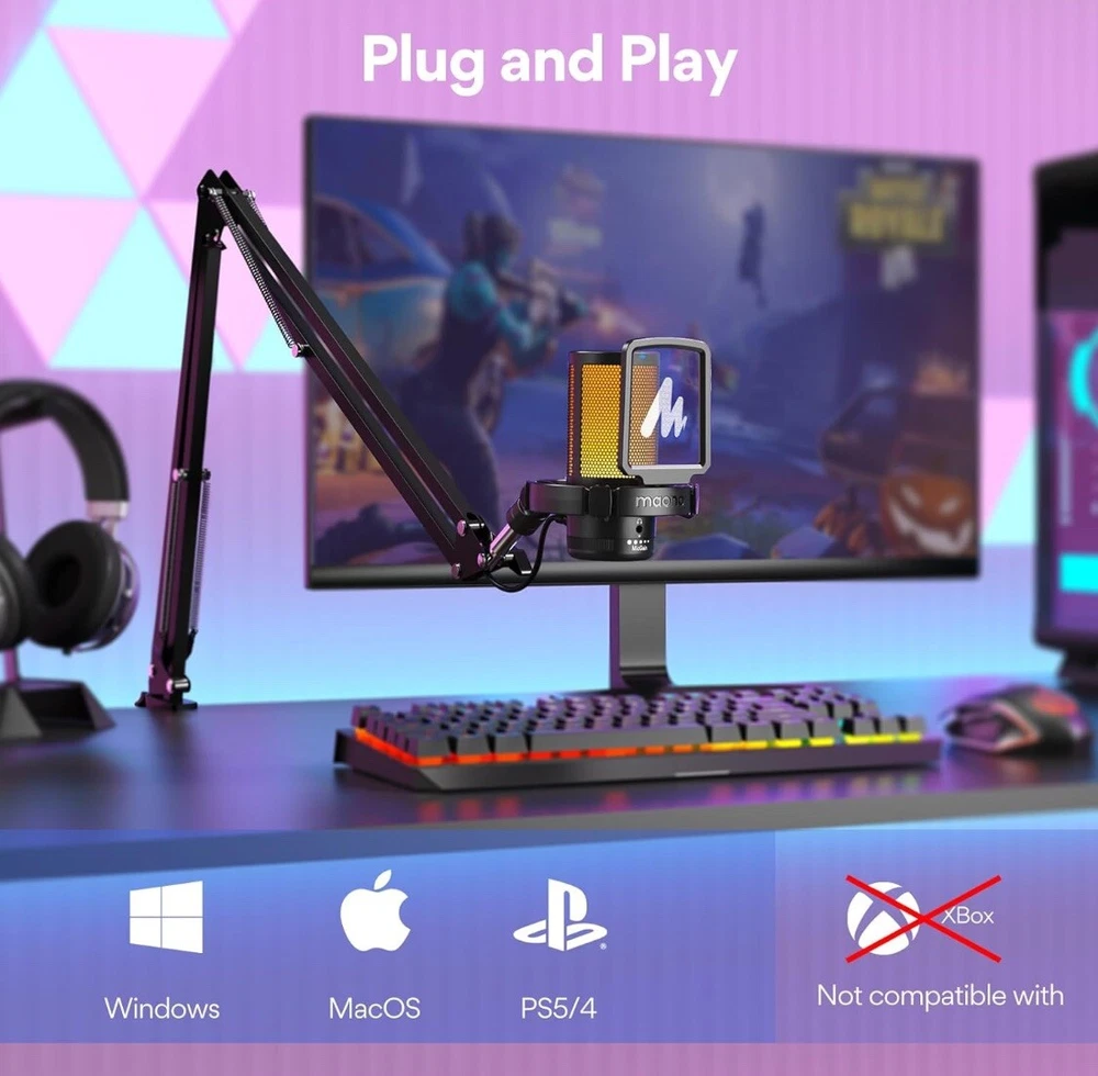 MORE FOCUS AND CLARITY - This gaming microphone with one-click noise cancellation technology, which can effectively eliminate background noise. Whether it's multiplayer online games, cooperative games, or competitive games, the USB microphone can capture game players' voices clearly, thereby enhancing the collaboration and competitiveness of the game. Cardioid pickup focuses more on capturing sound from the mic front, providing better sound quality and accuracy for gaming streaming or voice CONTROLLABLE RGB LIGHTING - You can change the color of RGB lights to match your game streaming aesthetic. The computer microphone has 9 personalized RGB lighting modes, Soft and coordinated lighting effects make your gaming video or gaming live broadcast stand out from the crowd. Long-pressing the RGB button turns off the RGB lights, while a short press turn on the lights and adjusts the light color EASIER MULTIFUNCTION USE - One-click the mute button on top of the PC microphone to turn on mute mode, and you can easily control your game audio. Take control of your on-stream sound with the mic gain knob, you can check if your voice level is too high or too low and adjust accordingly. The zero-latency monitoring allows you to easily maintain professional sound quality with a gaming mic PLUG AND PLAY - The game streaming microphone is compatible with Windows PC computer laptop, Mac, and PS5/4. The gaming USB microphone is ready to capture it when inspiration strikes. Just plug the mic straight into your computer or laptop with the included USB and USB C cable, and you're all set to record or stream, right away, No drivers are required. (Note: Not compatible with XBOX) STURDY & FLEXIBLE ARM STAND - The easy-to-position metal arm stand adjusts to support a variety of setups, You can quickly pull the podcast microphone near your mouth when in use, or fold it away to save more space. The shock mount can further reduce game-induced machine noise and vibration, and the removable pop filter can reduce noise without blocking the gaming computer screen WHAT YOU GET - The USB gaming PC microphone set package includes, USB condenser microphone*1, Metal Boom arm stand*1, Shock mount*1, Pop filter*1, USB and USB C cable*1, Desktop Clamp*1, User's Manual*1
