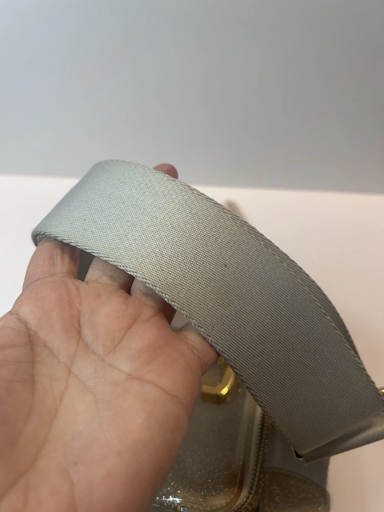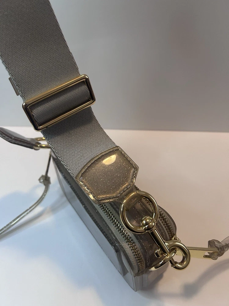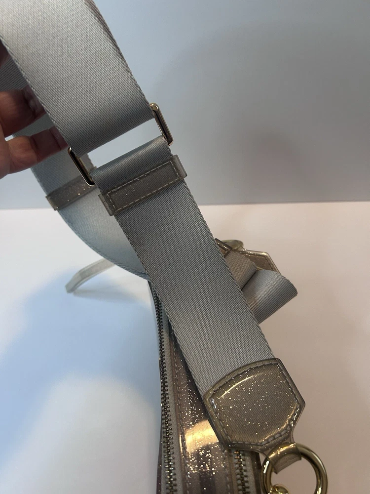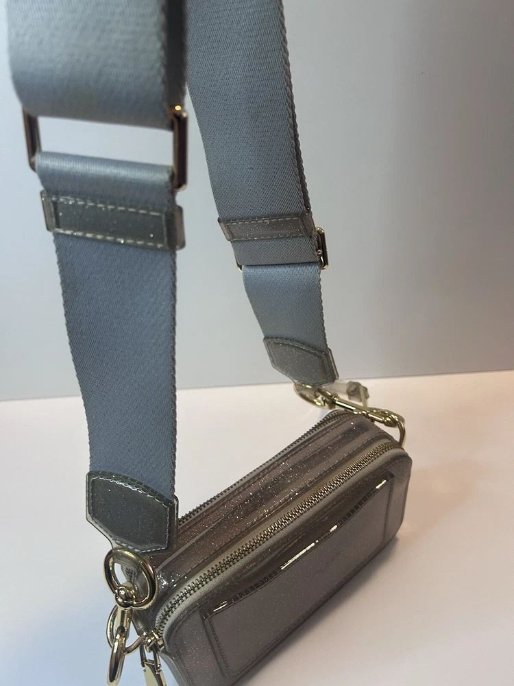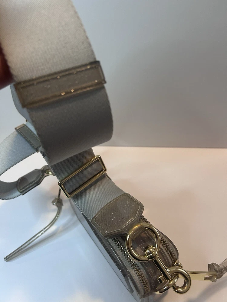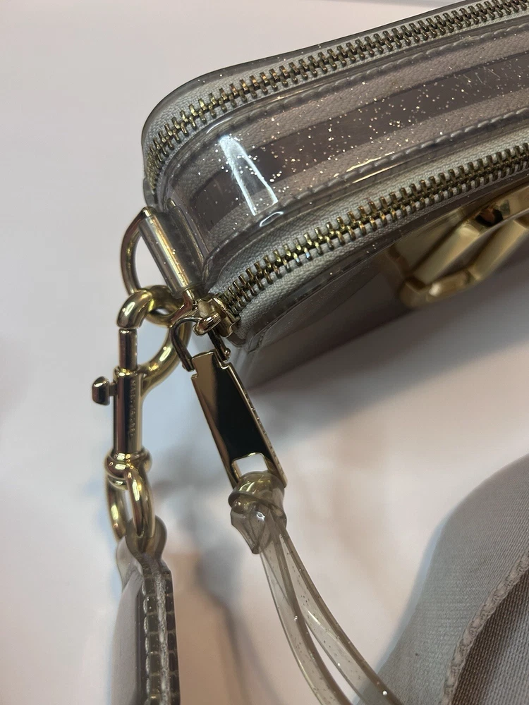 Pls Read The Description before buying it🤗 Gray strap Glittery Clear Slip back pocket Double zipper Closure Two Compartments 7-1/2”Lx4-1/2”x2-1/2”D Gold Hardware Detachable and Adjustable strap Few tiny scratches on logo See the right corner has small stain from lipstick… on PVC Beautiful crossbody bag…