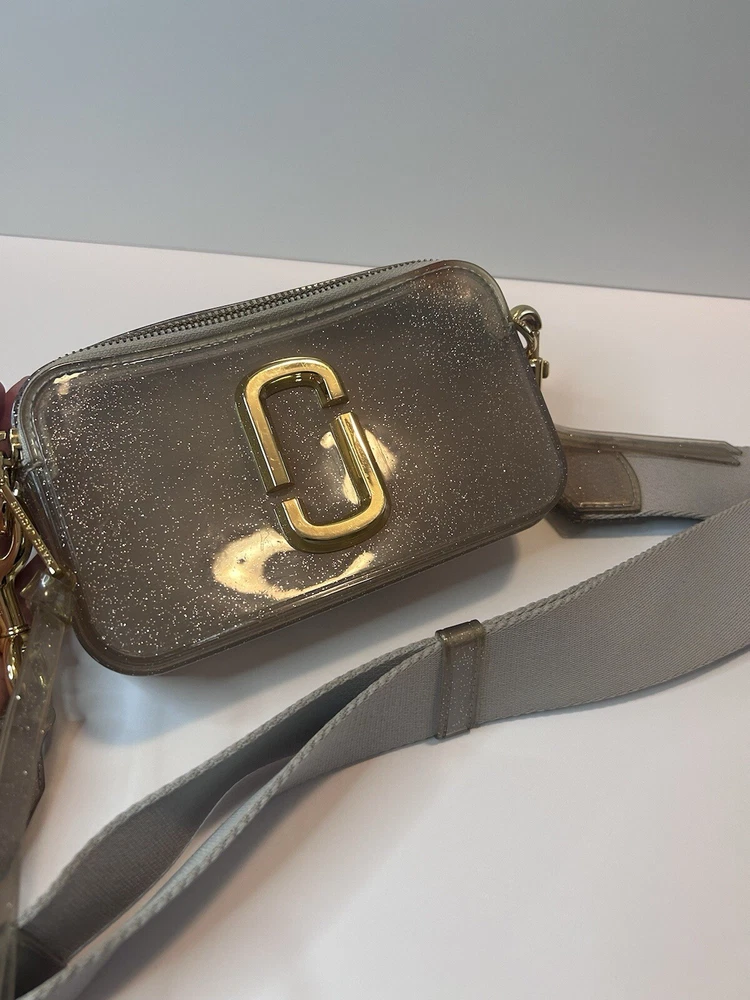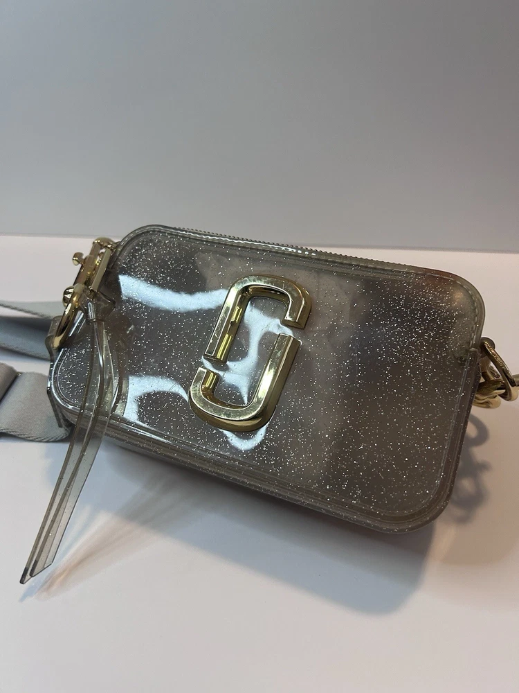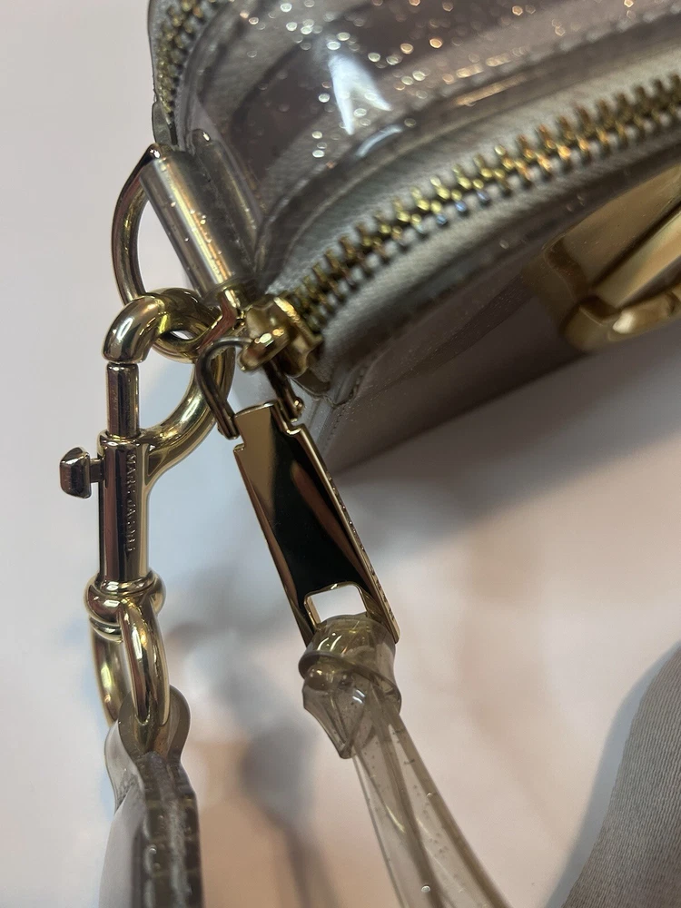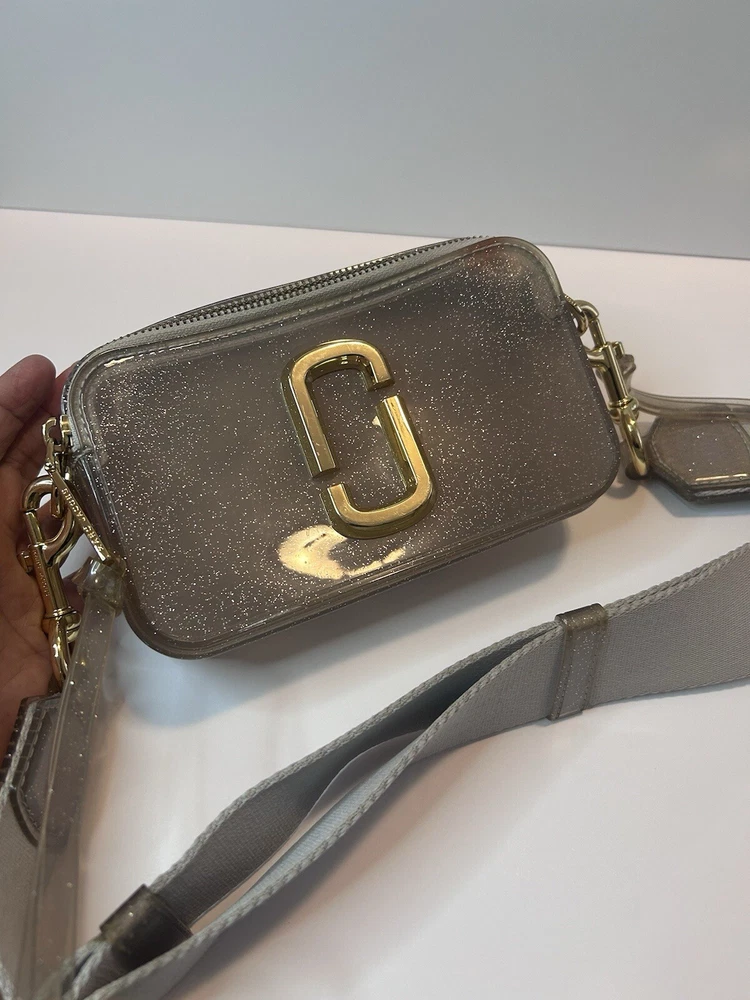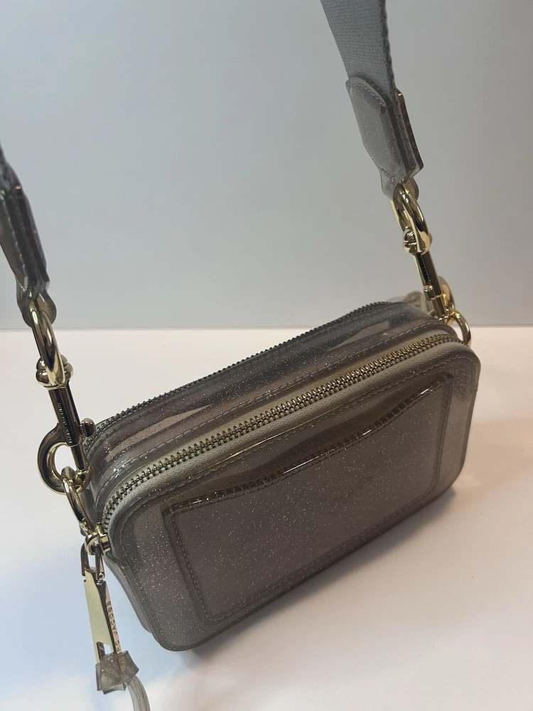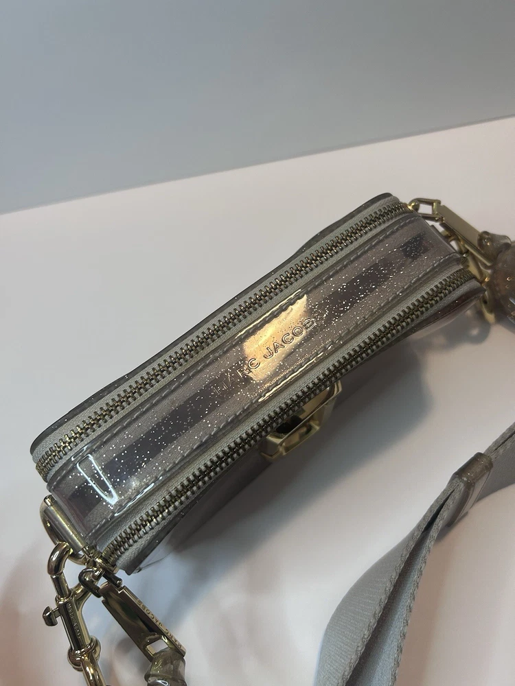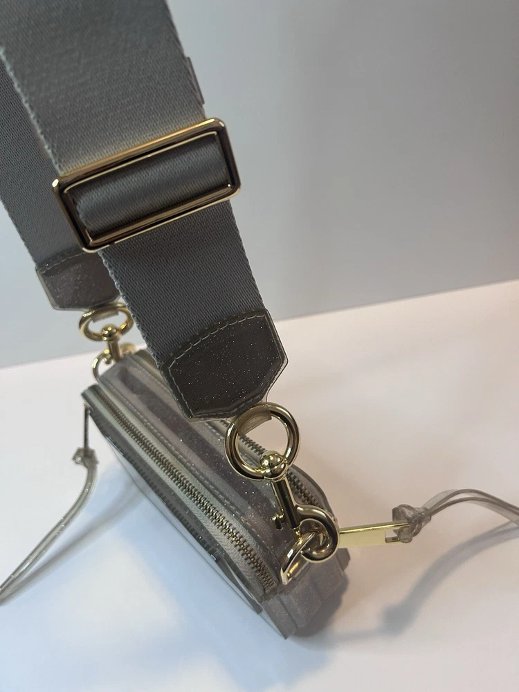 Pls Read The Description before buying it🤗 Gray strap Glittery Clear Slip back pocket Double zipper Closure Two Compartments 7-1/2”Lx4-1/2”x2-1/2”D Gold Hardware Detachable and Adjustable strap Few tiny scratches on logo See the right corner has small stain from lipstick… on PVC Beautiful crossbody bag…