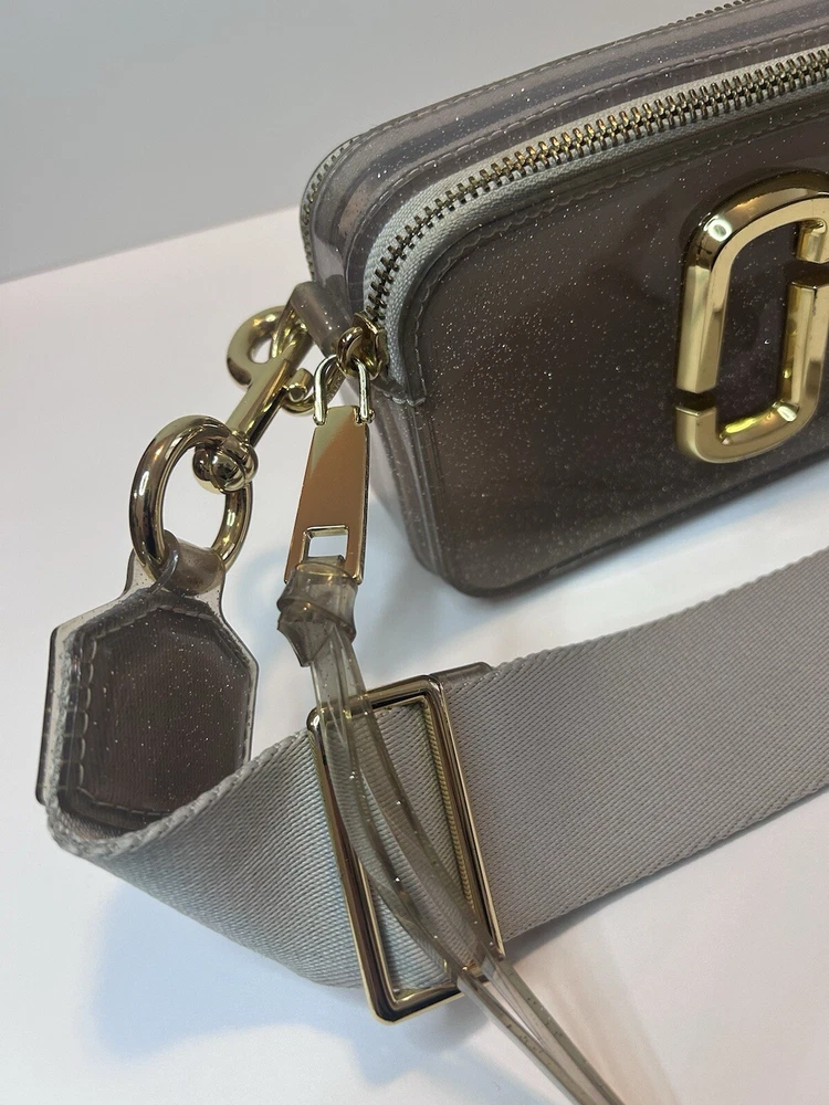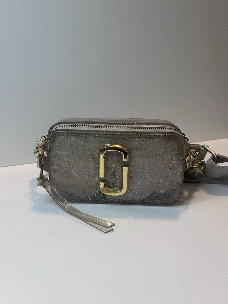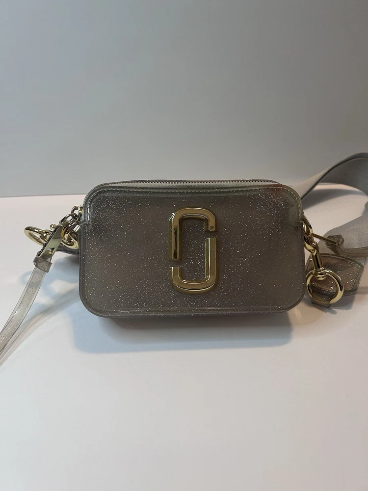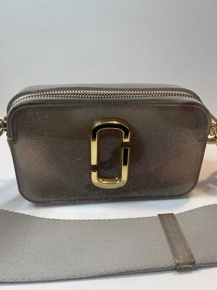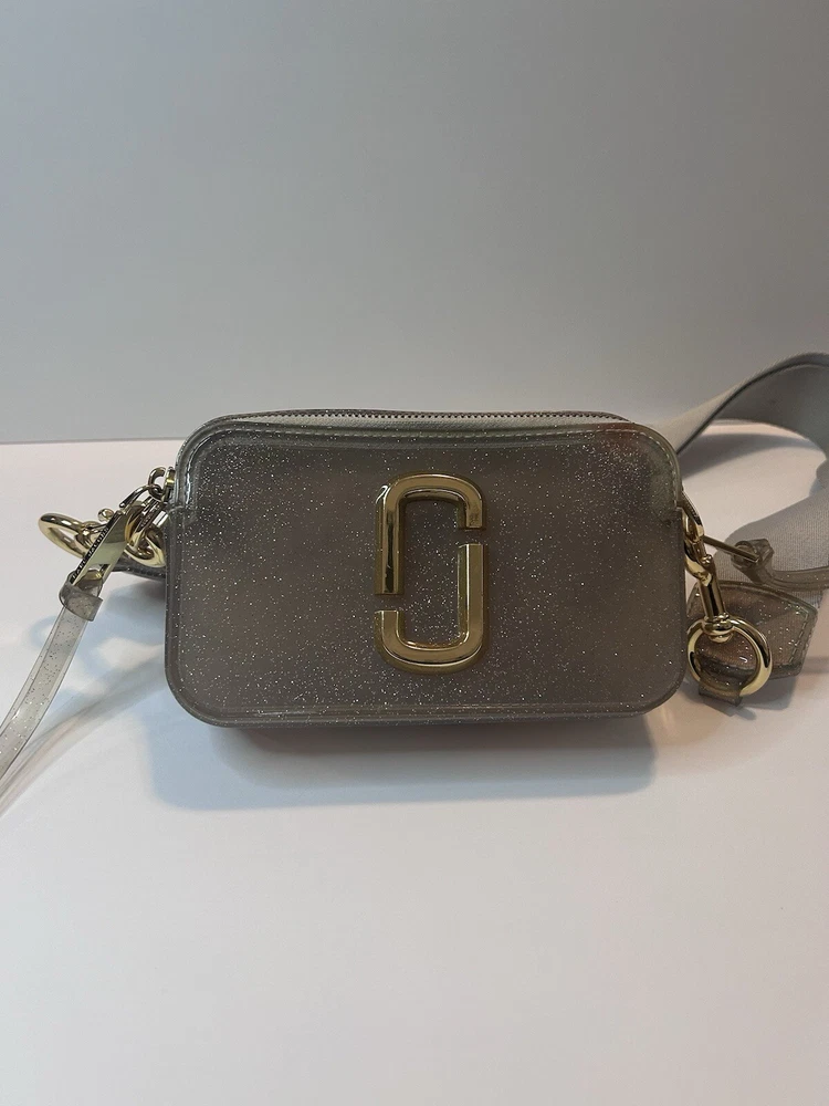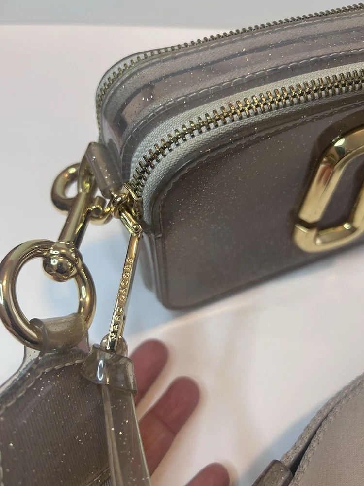 Pls Read The Description before buying it🤗 Gray strap Glittery Clear Slip back pocket Double zipper Closure Two Compartments 7-1/2”Lx4-1/2”x2-1/2”D Gold Hardware Detachable and Adjustable strap Few tiny scratches on logo See the right corner has small stain from lipstick… on PVC Beautiful crossbody bag…