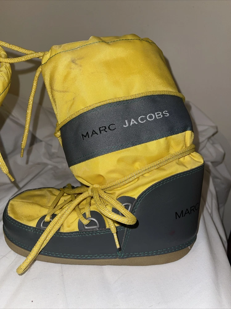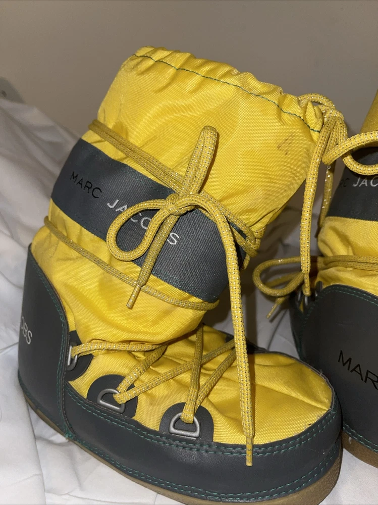 These Marc Jacobs snow boots are a must-have for any winter wardrobe. The vibrant yellow color will add a pop of color to any outfit, while the mid-calf shaft style and nylon upper material provide both warmth and durability. Perfect for women's US shoe size 6, these boots are designed for winter season wear and feature a snow boot style that is both practical and stylish. The boots are pre-owned but in excellent condition. The brand name alone speaks to the quality of the boots, so you can trust that you are getting a well-made product. These boots are perfect for anyone looking for a comfortable and fashionable winter shoe option. Don't miss out on the chance to add these Marc Jacobs snow boots to your collection.