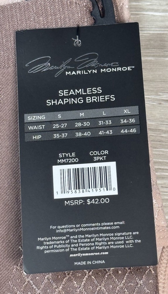 MARILYN MONROE Women’s 3-Pack Shaping BRIEF Seamless FIRM Control Tummy Panel Size S New With Tags! Women’s Size Available: SMALL COLOR: Brown, Beige, Black Jacquard Pattern STYLE: MM7200 85% Nylon 15% Spandex RETAIL PRICE: $42.00+ Tax Control Level: FIRM Machine Wash Cold Imported