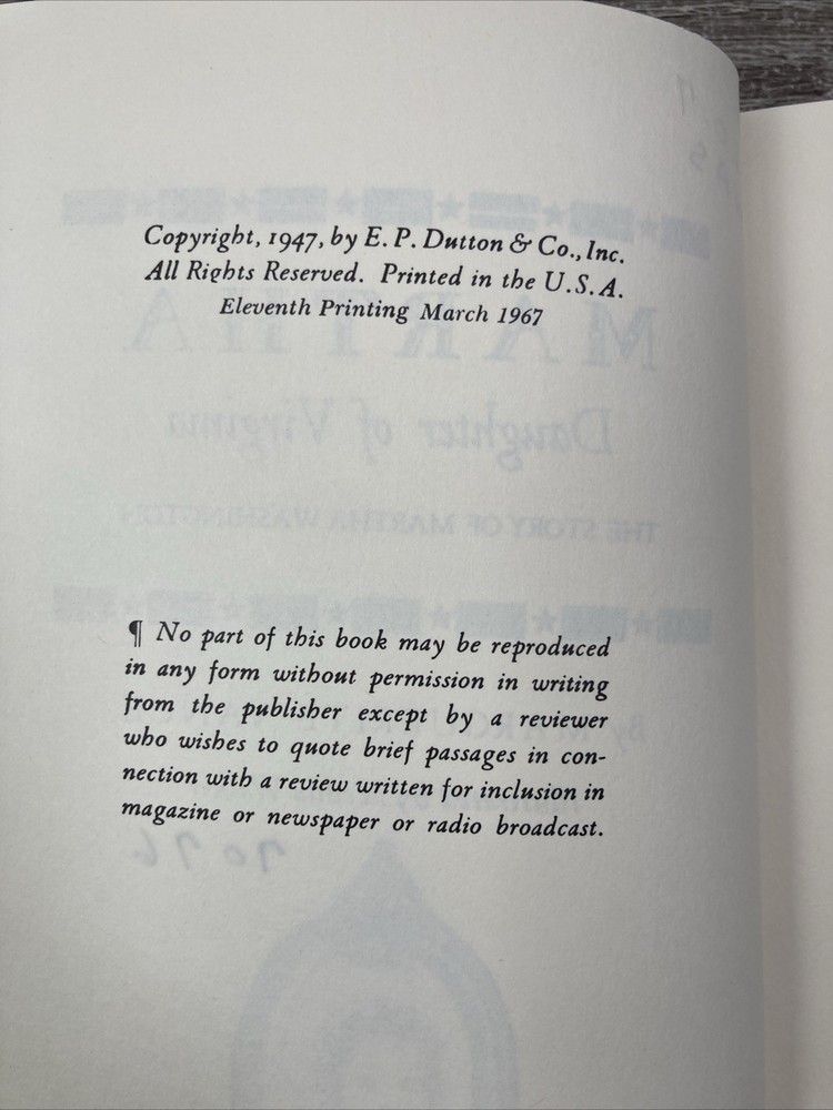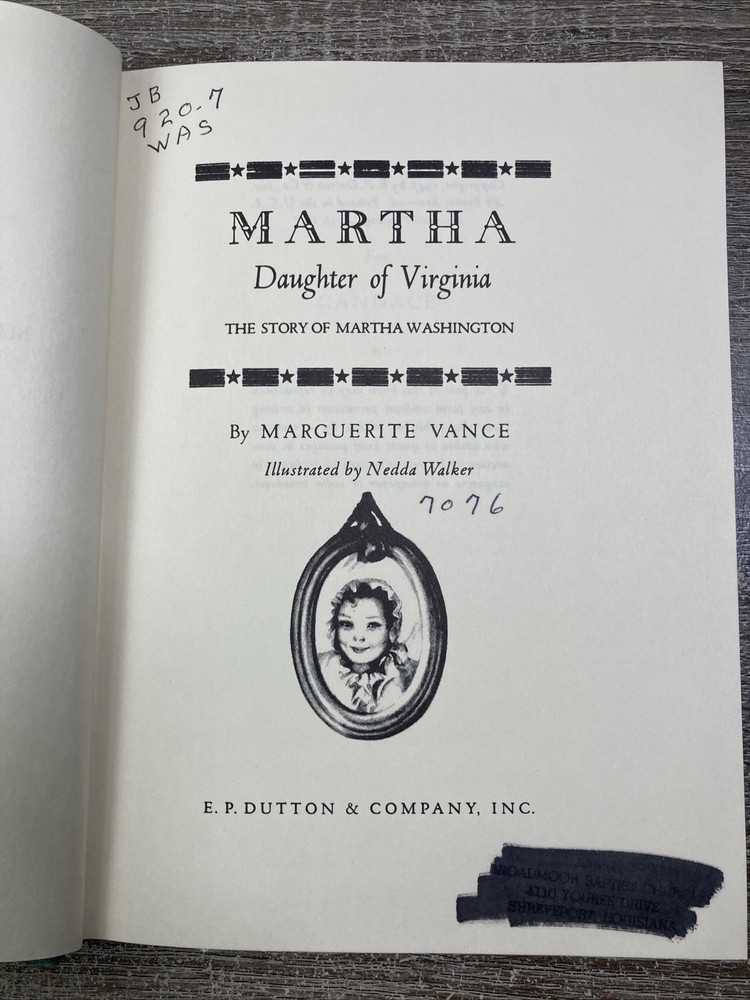 "MARTHA, DAUGHTER OF VIRGINIA" is an 1967 hardcover book by Marguerite Vance, focusing on the life of Martha Washington.